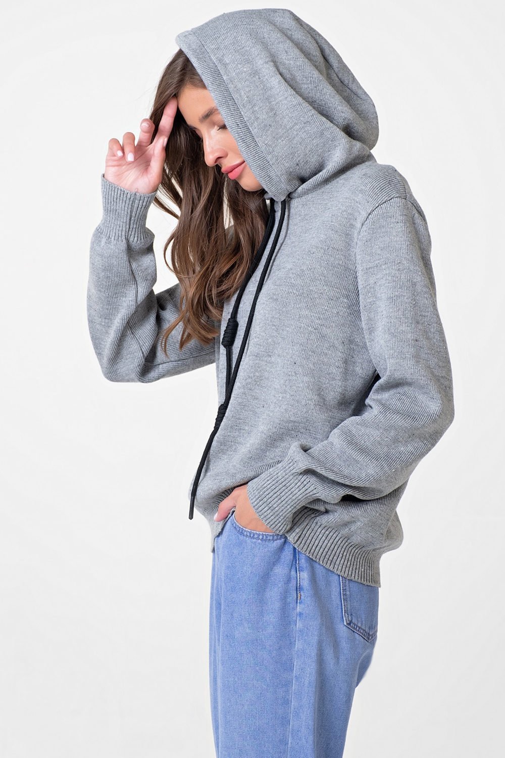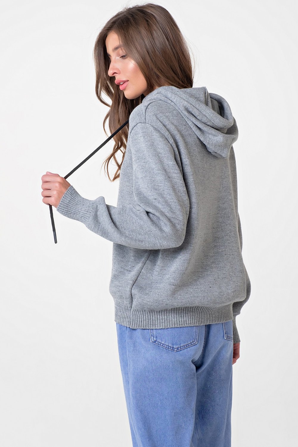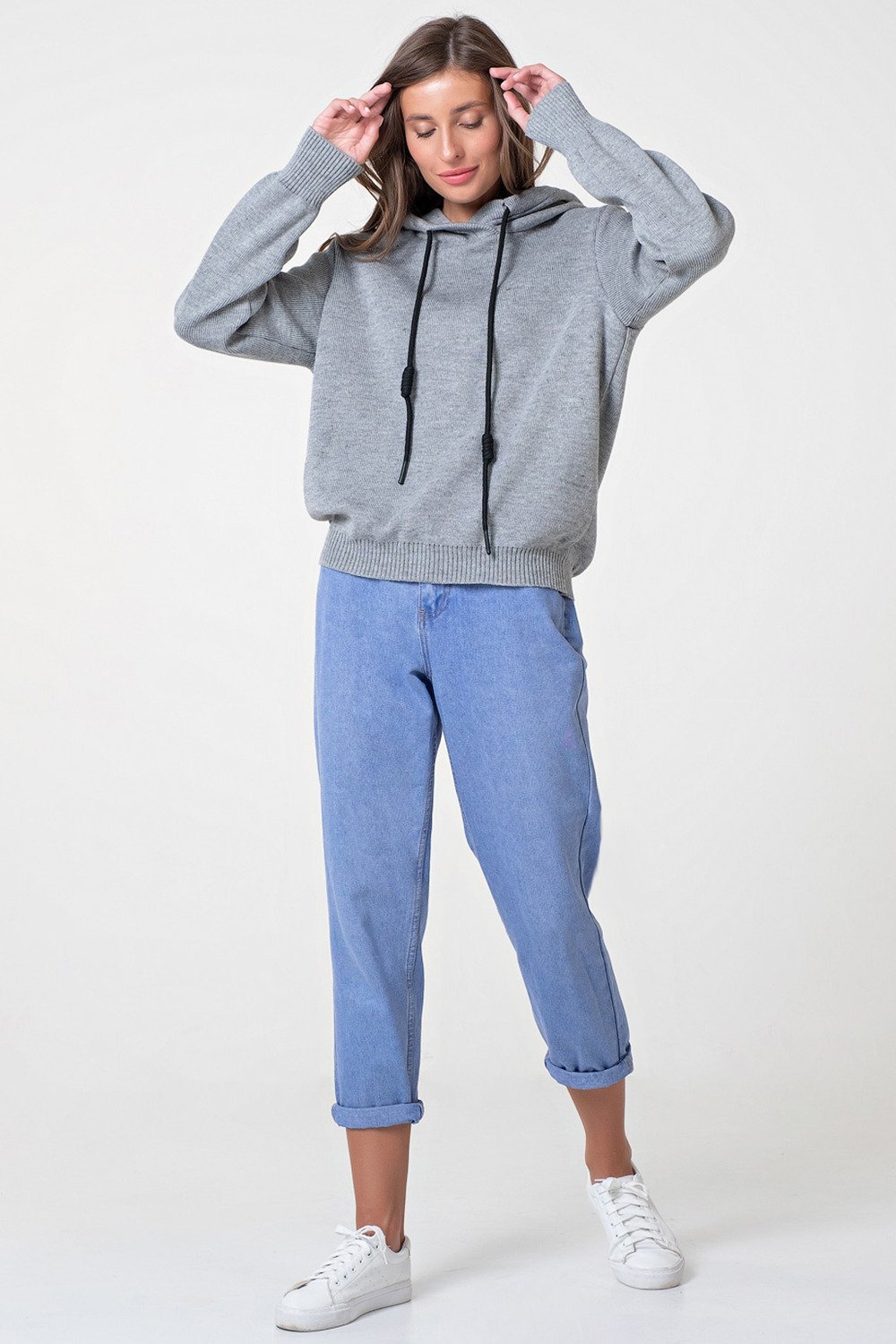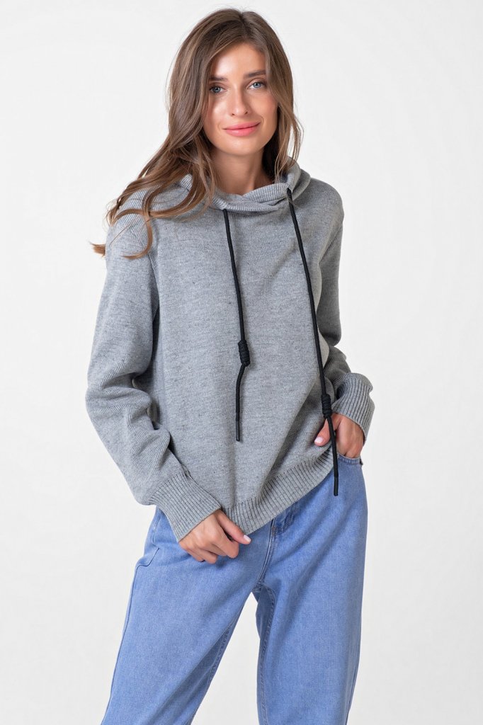 • Длина изделия:63 см. Особенности: Объемный вязаный джемпер выполнен с капюшоном на контрастном шнуре. Низ изделия и рукавов выполнены резинкой в рубчик.