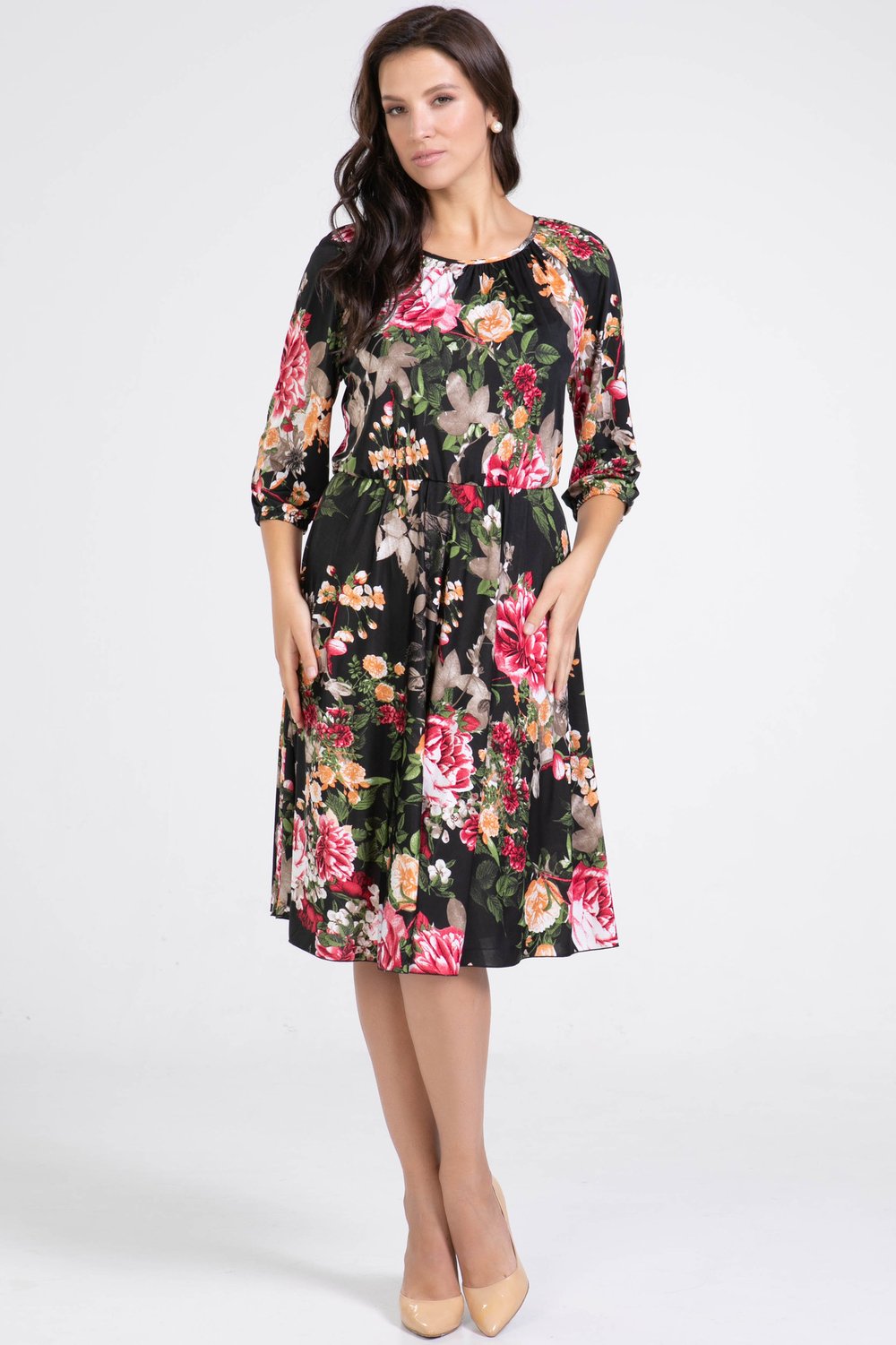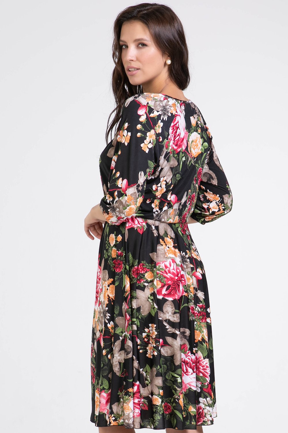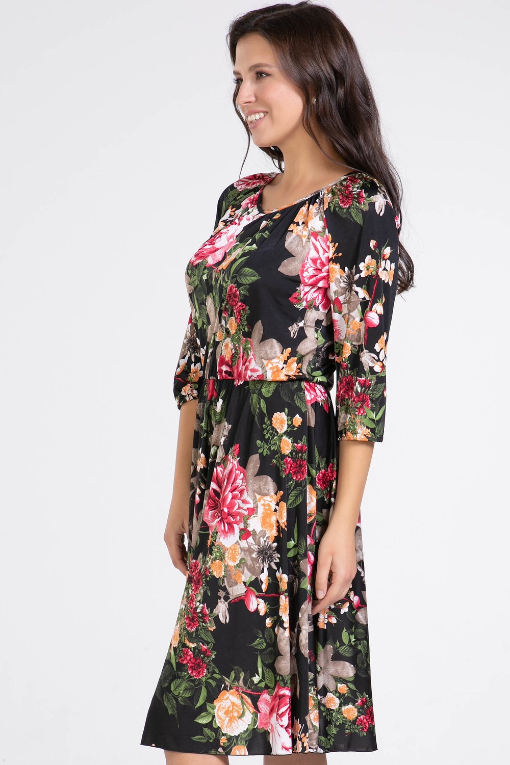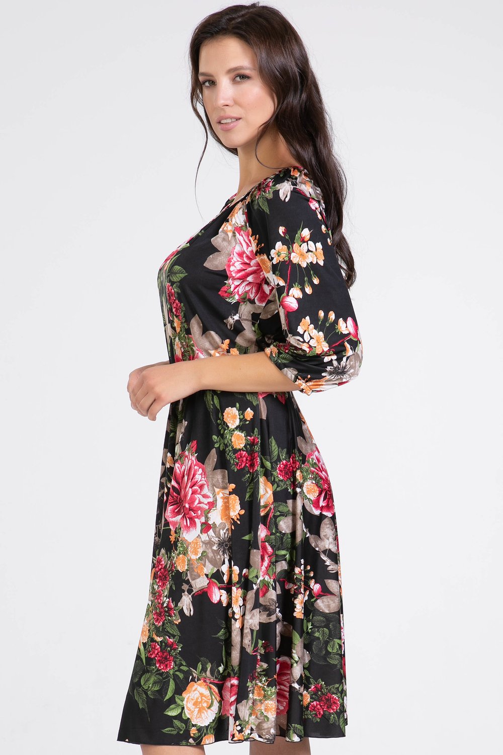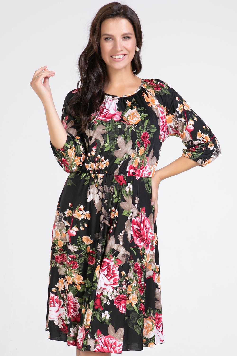 Платье из трикотажного полотна яркого цветочного принта. Отрезное по линии талии, юбка расклешённая, рукав реглан, 3/4, горловина круглая, окантована кантом из основной ткани.Характеристики: