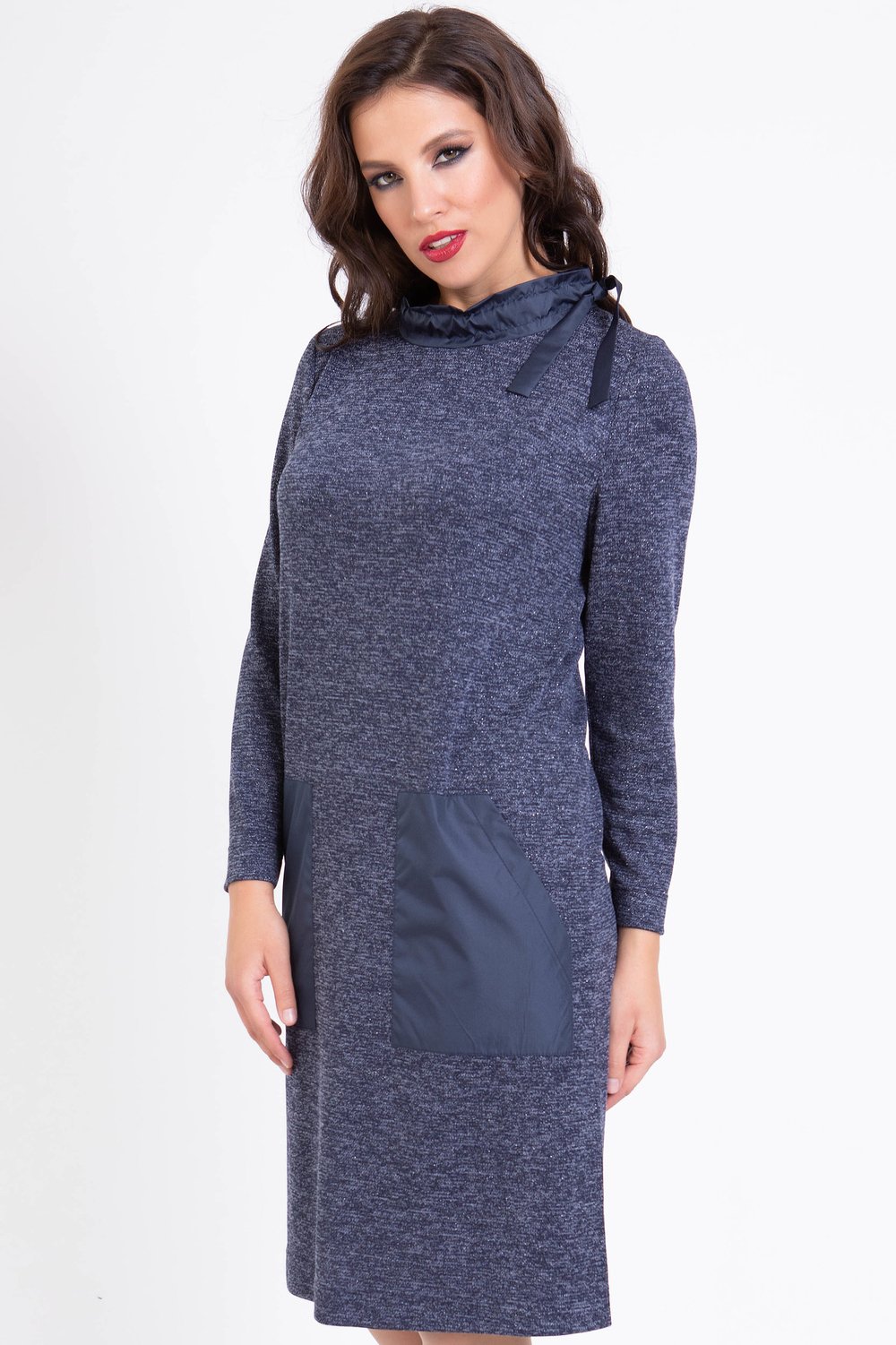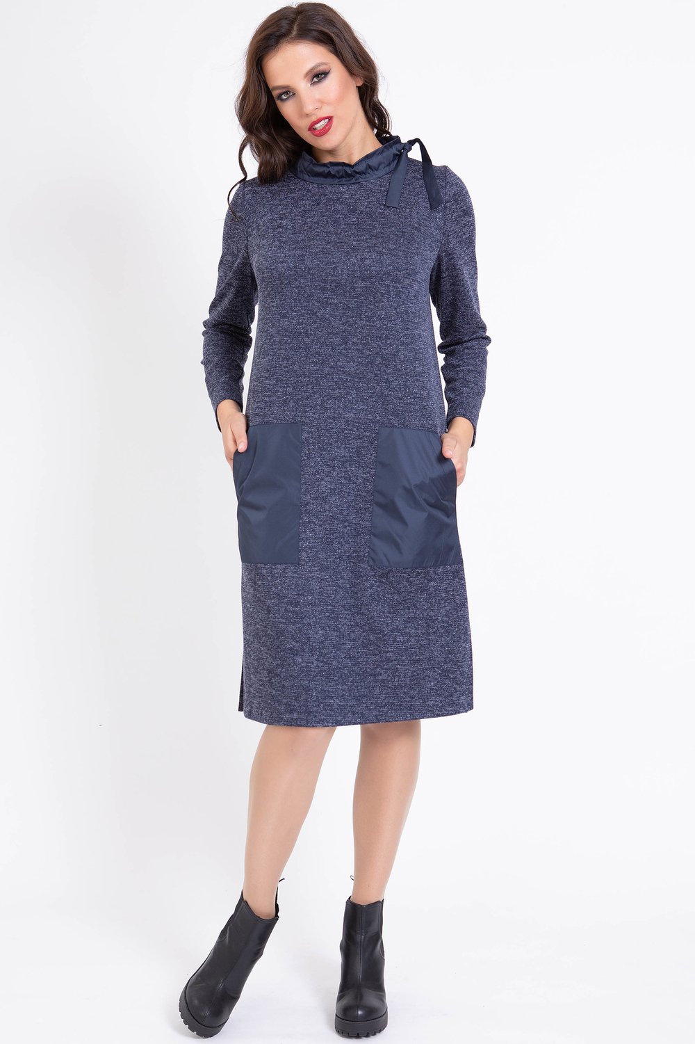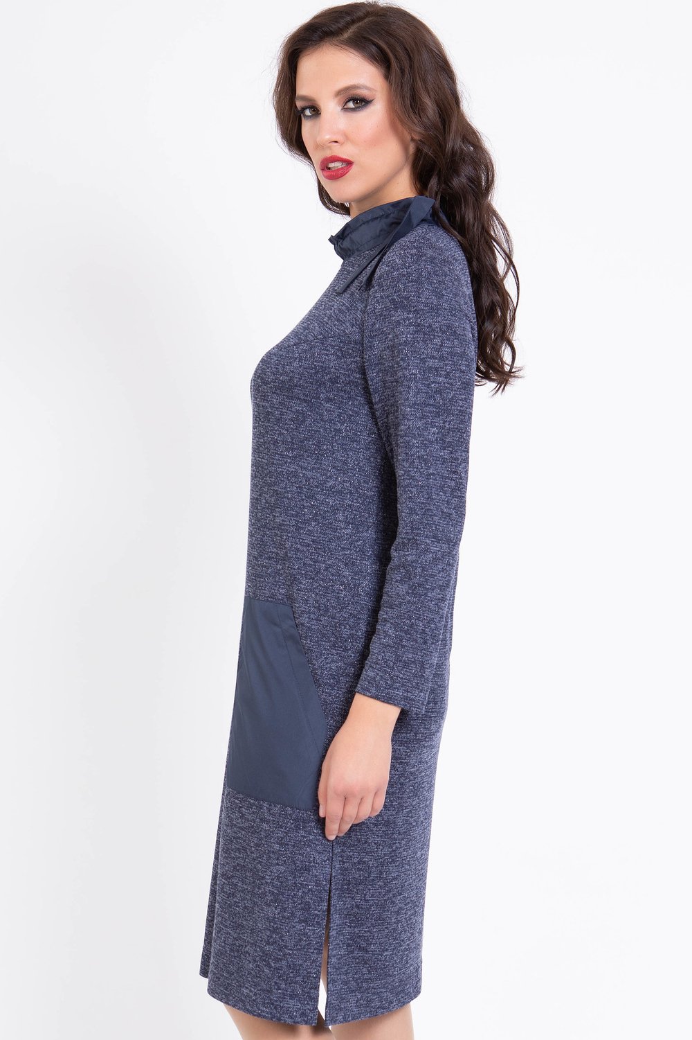 Платье прямого силуэта, с разрезами в боковых швах. Рукав втачной, длинный. Перед с двумя накладными карманами. Воротник стойка, с кулисой, в кулису продета завязка. Воротник, завязка, накладные карманы выполнены из тонкой плащевой ткани в тон основного сырья.