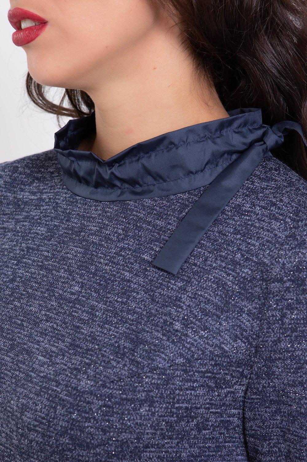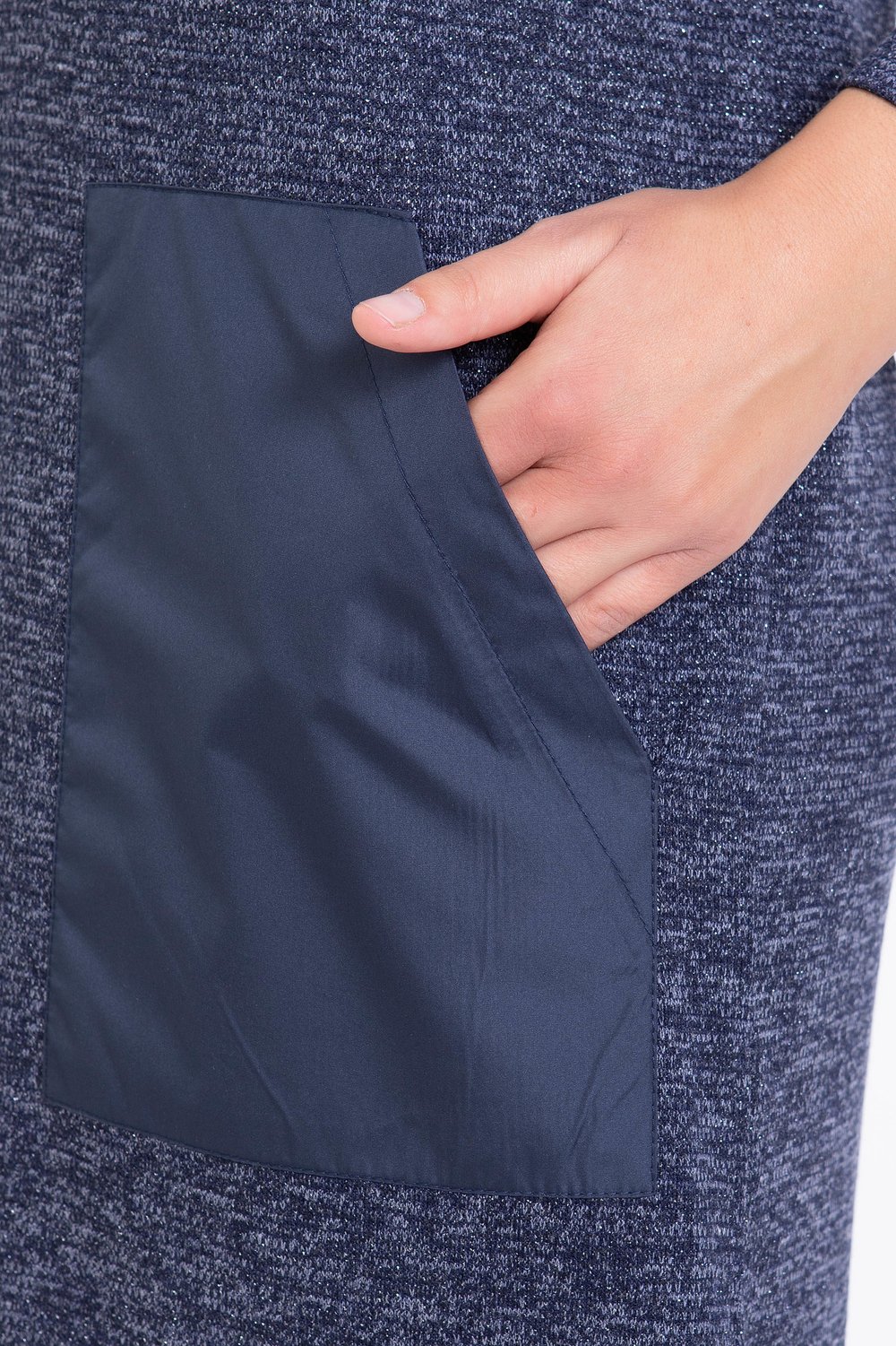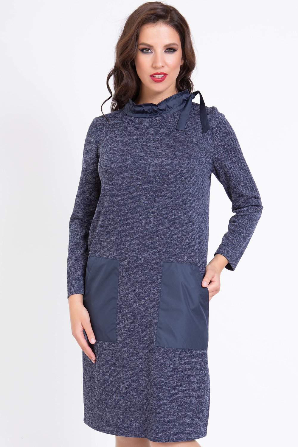 Платье прямого силуэта, с разрезами в боковых швах. Рукав втачной, длинный. Перед с двумя накладными карманами. Воротник стойка, с кулисой, в кулису продета завязка. Воротник, завязка, накладные карманы выполнены из тонкой плащевой ткани в тон основного сырья.