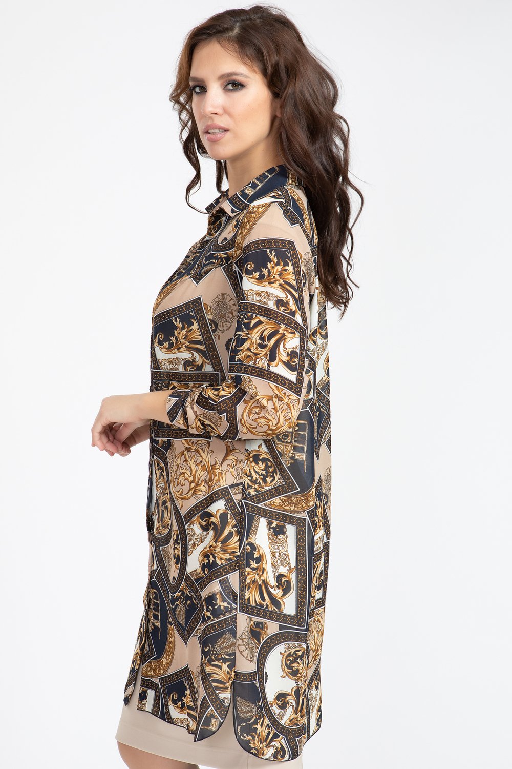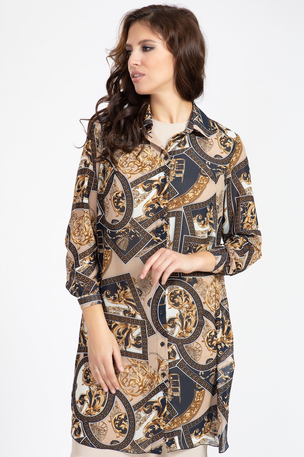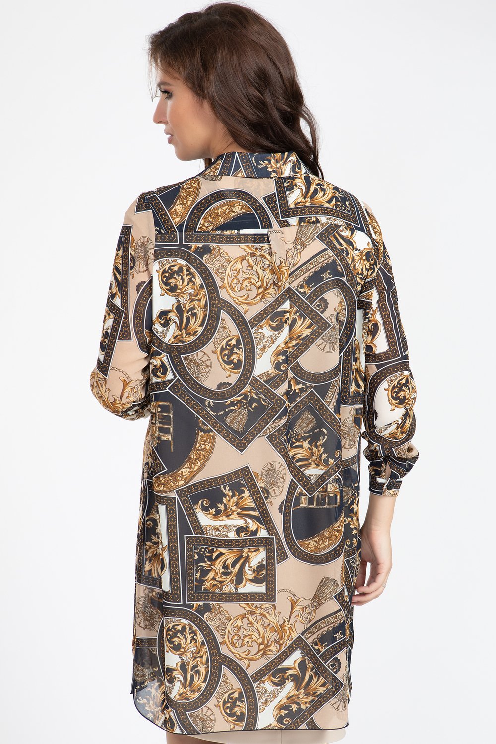 Блуза прямого силуэта с закругленным низом по переду и спинке. Перед по центру с застежкой на петли и пуговицы. Спинка с двойной кокеткой. Рукав втачной, длинный, по низу на притачной манжете, застегивающейся на петлю и пуговицу. Воротник с острыми концами на притачной стойке, застегивающейся на петлю и пуговицу.