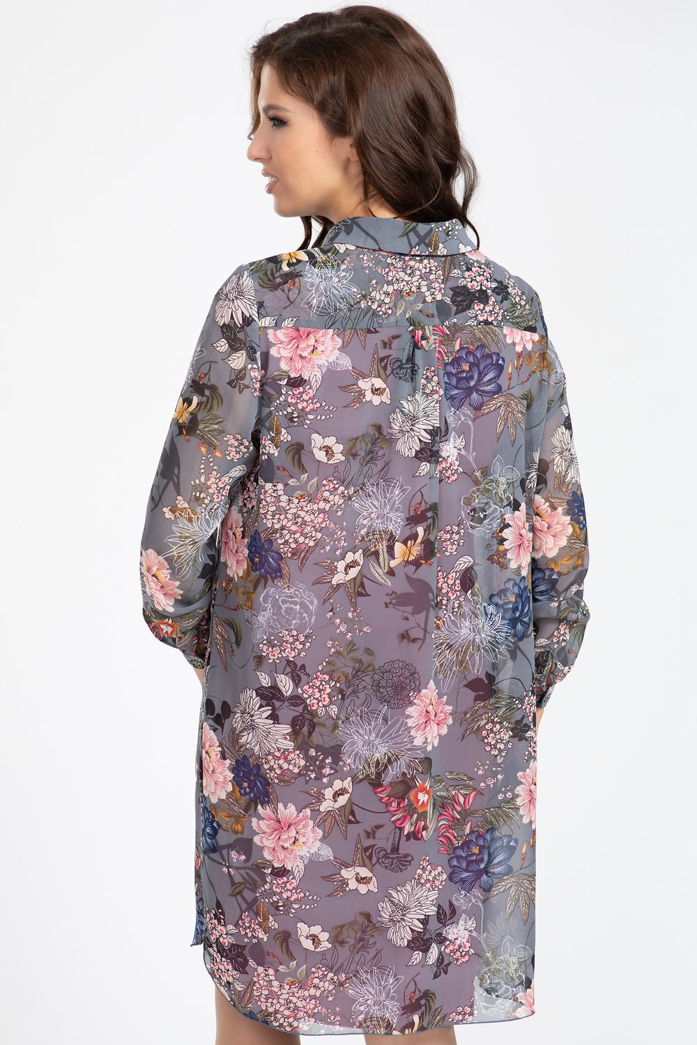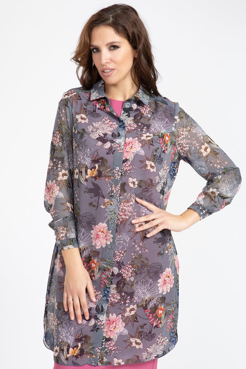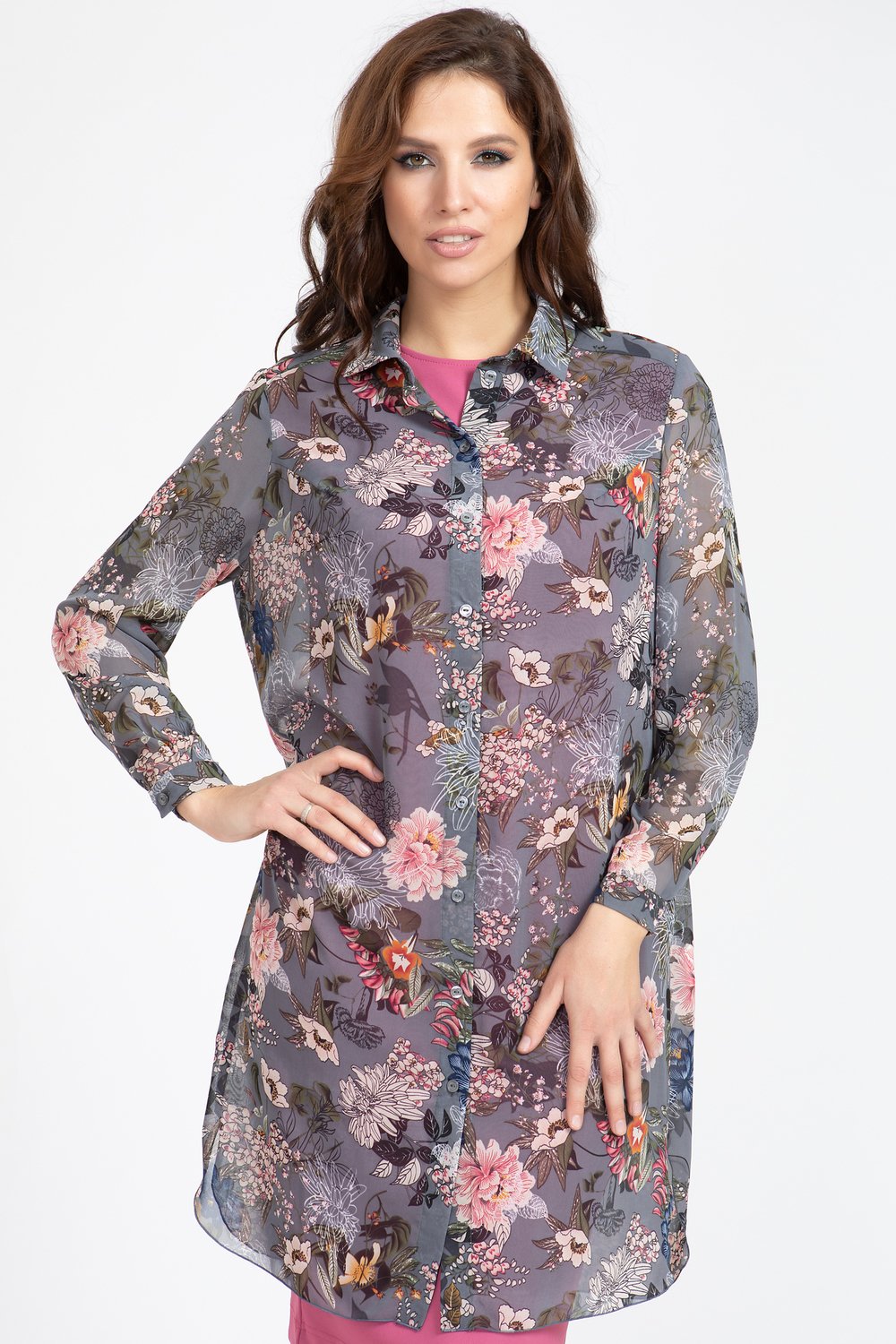 Блуза прямого силуэта с закругленным низом по переду и спинке. Перед по центру с застежкой на петли и пуговицы. Спинка с двойной кокеткой. Рукав втачной, длинный, по низу на притачной манжете, застегивающейся на петлю и пуговицу. Воротник с острыми концами на притачной стойке, застегивающейся на петлю и пуговицу.