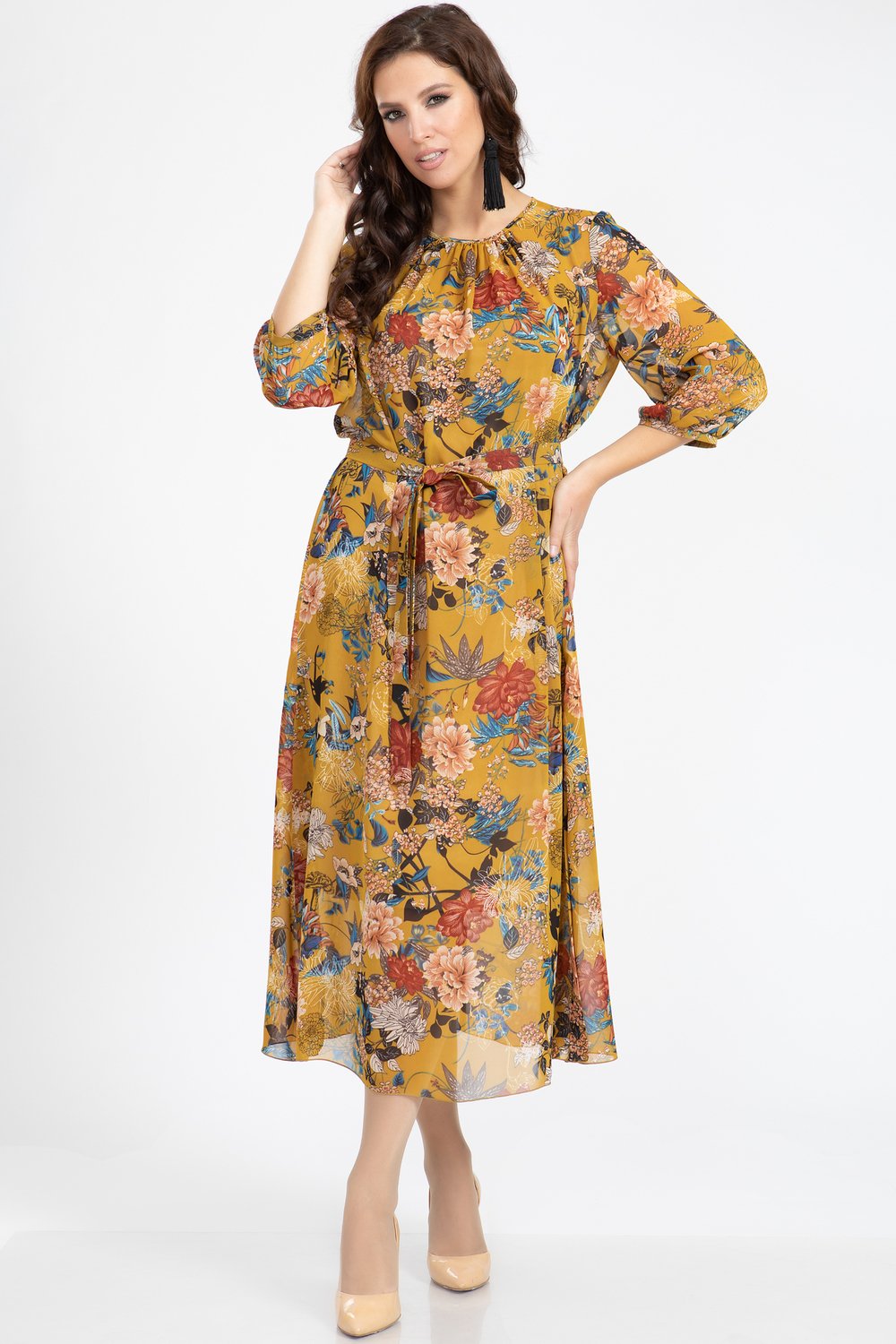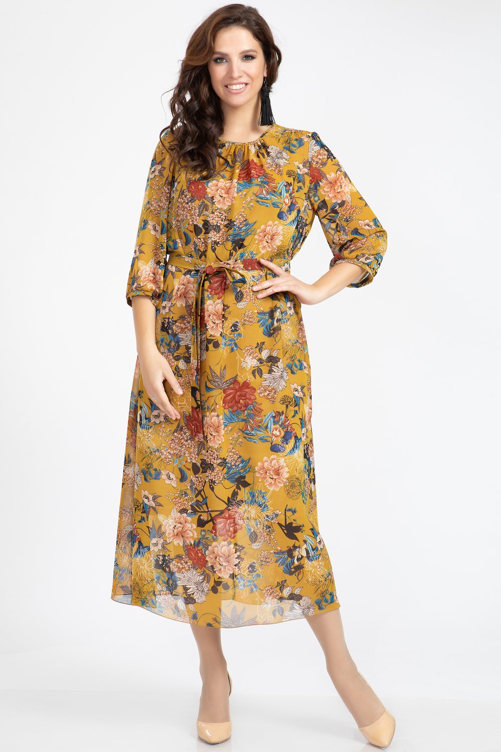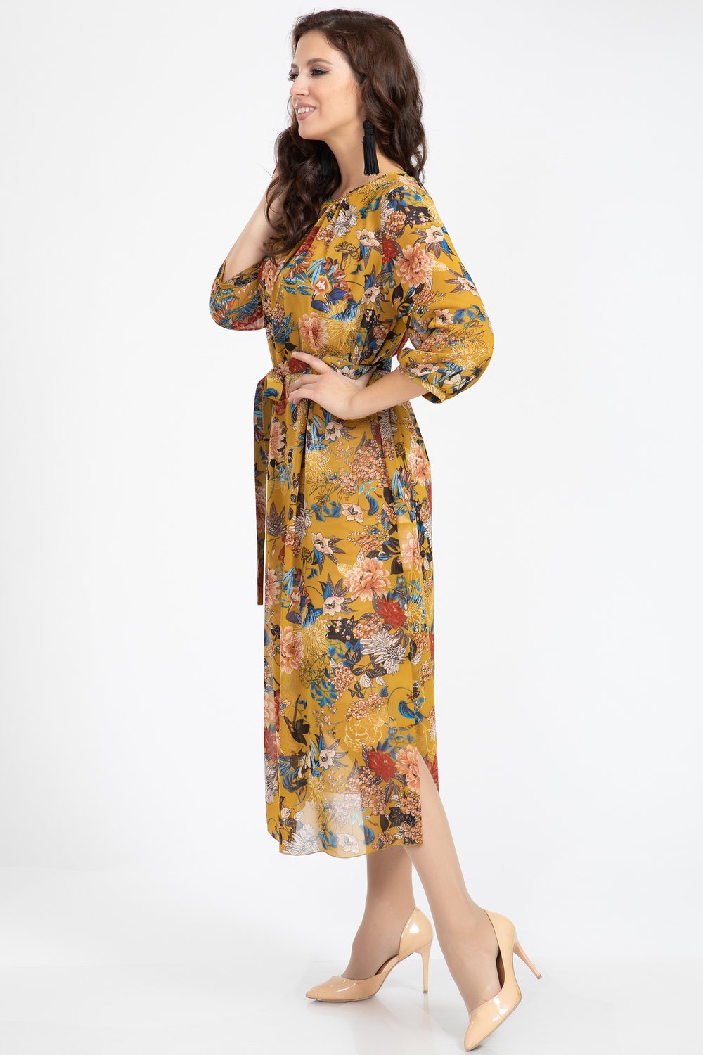 Платье А-образного силуэта, с открытой шлицей в боковых швах, с завязывающимся съемным поясом. Горловина круглая, со сборкой посередине переда. Спинка с разрезом в среднем шве и застежкой по горловине на навесную петлю и пуговицу. Рукав втачной, 3/4, по низу собран в сборку и на притачной манжете. К платью прилагается чехол из трикотажного полотна.Характеристики: