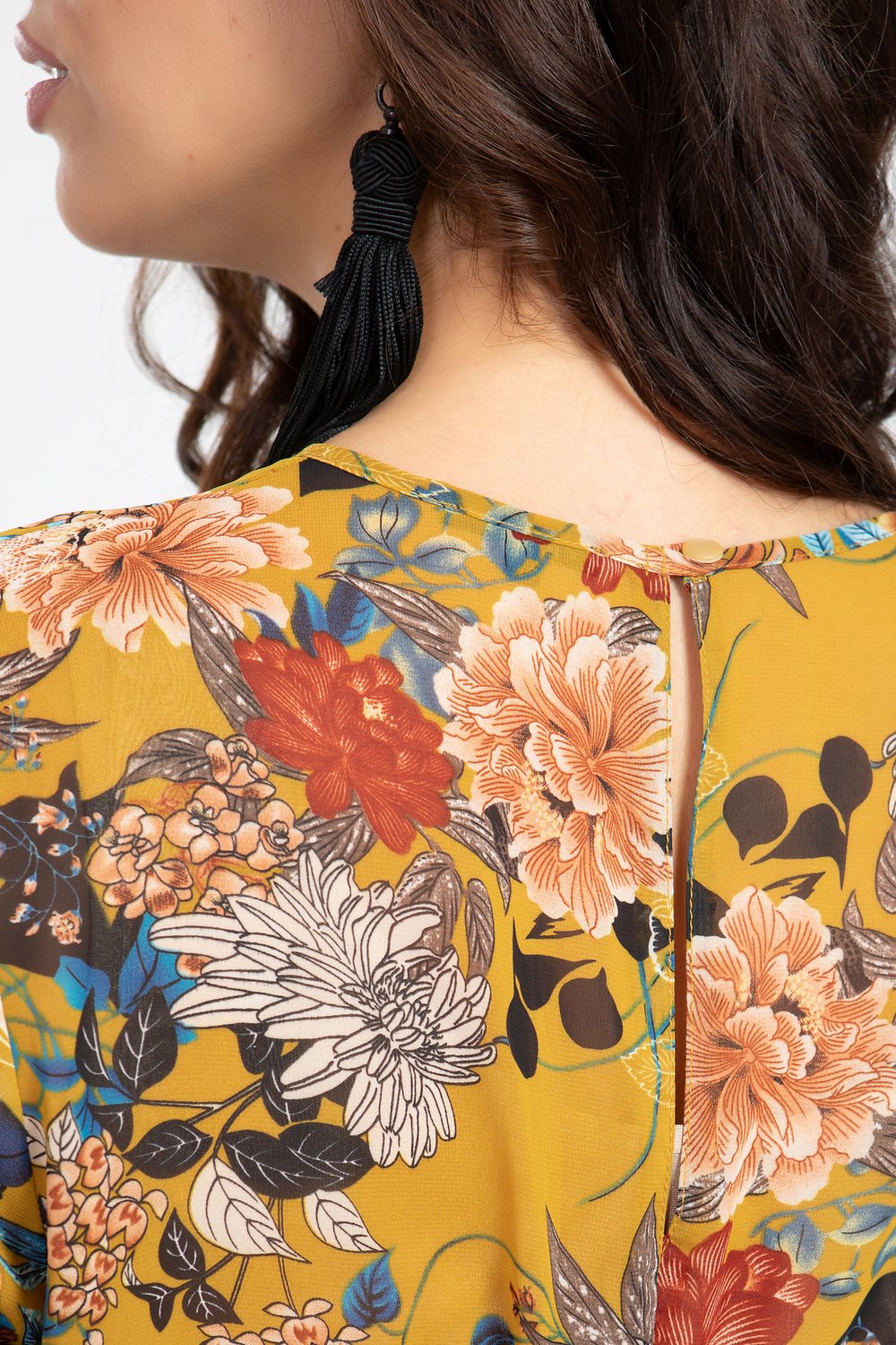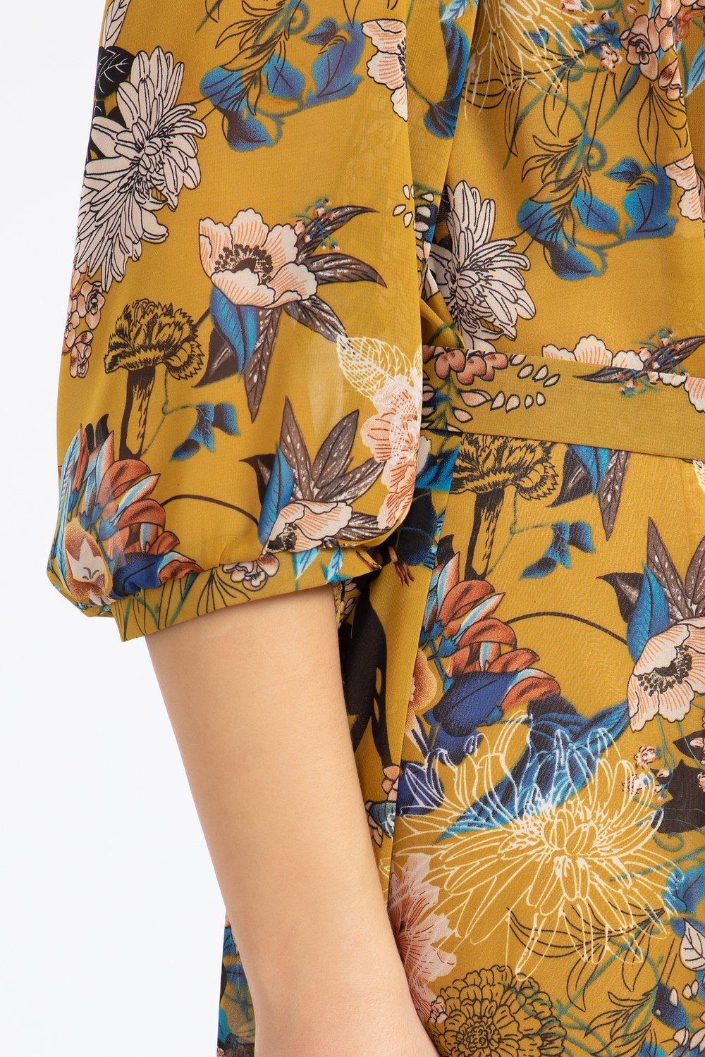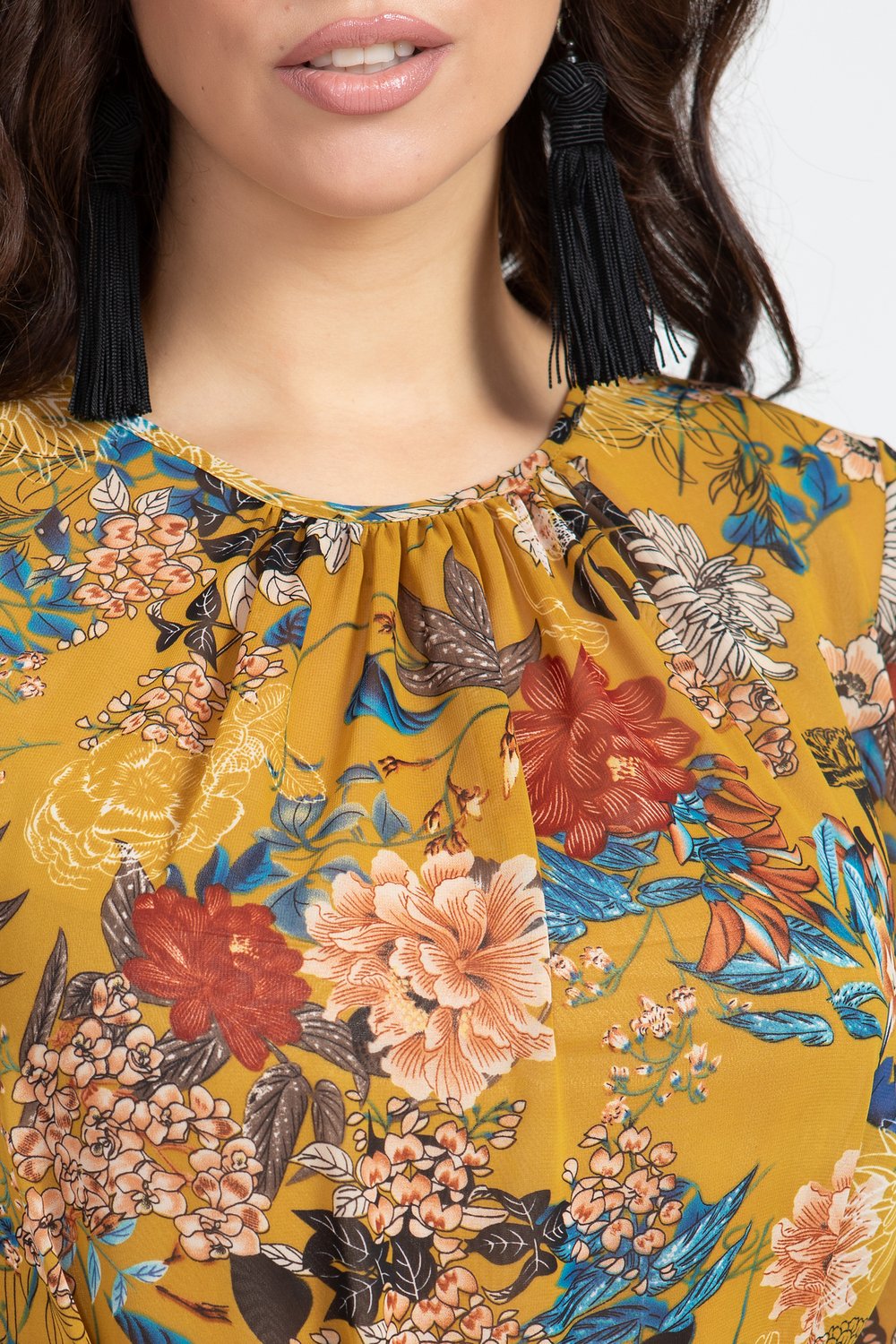 Платье А-образного силуэта, с открытой шлицей в боковых швах, с завязывающимся съемным поясом. Горловина круглая, со сборкой посередине переда. Спинка с разрезом в среднем шве и застежкой по горловине на навесную петлю и пуговицу. Рукав втачной, 3/4, по низу собран в сборку и на притачной манжете. К платью прилагается чехол из трикотажного полотна.Характеристики: