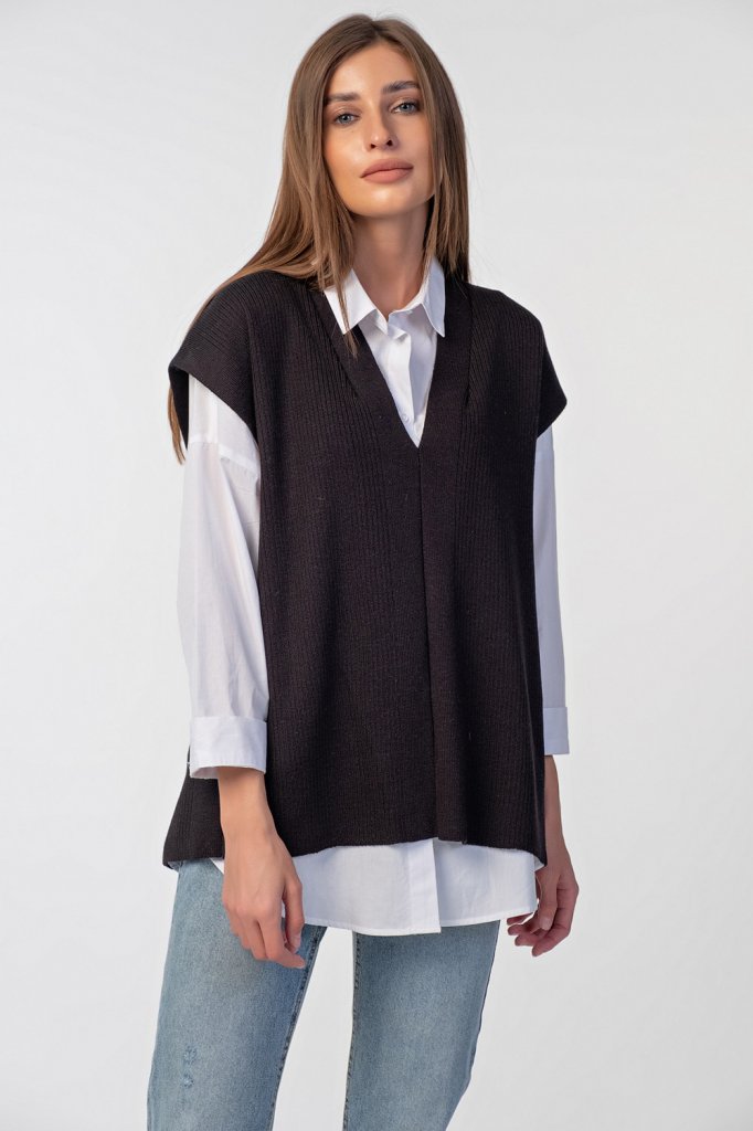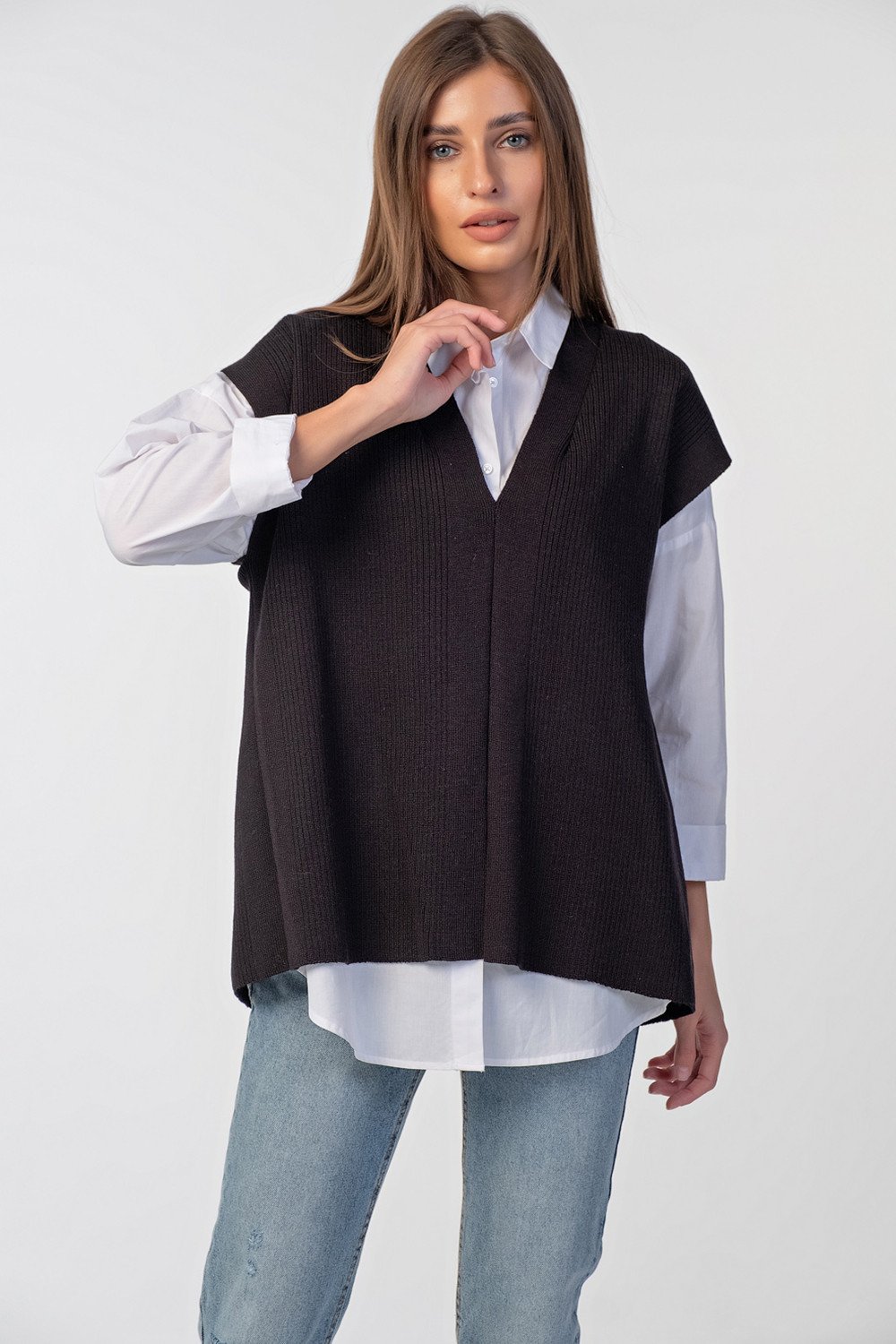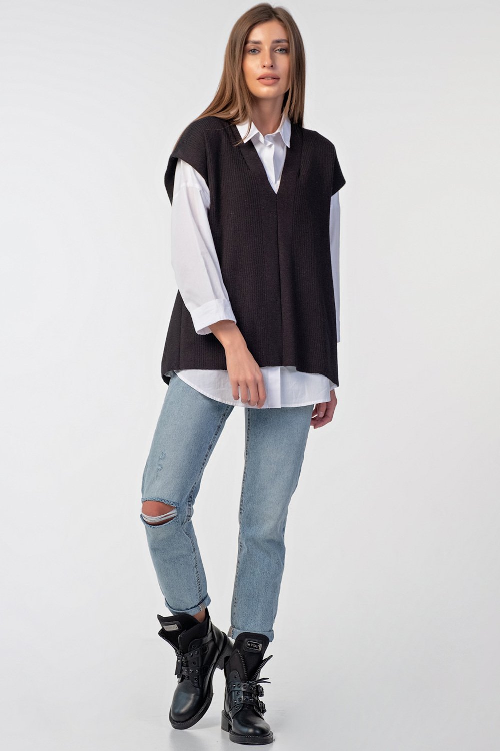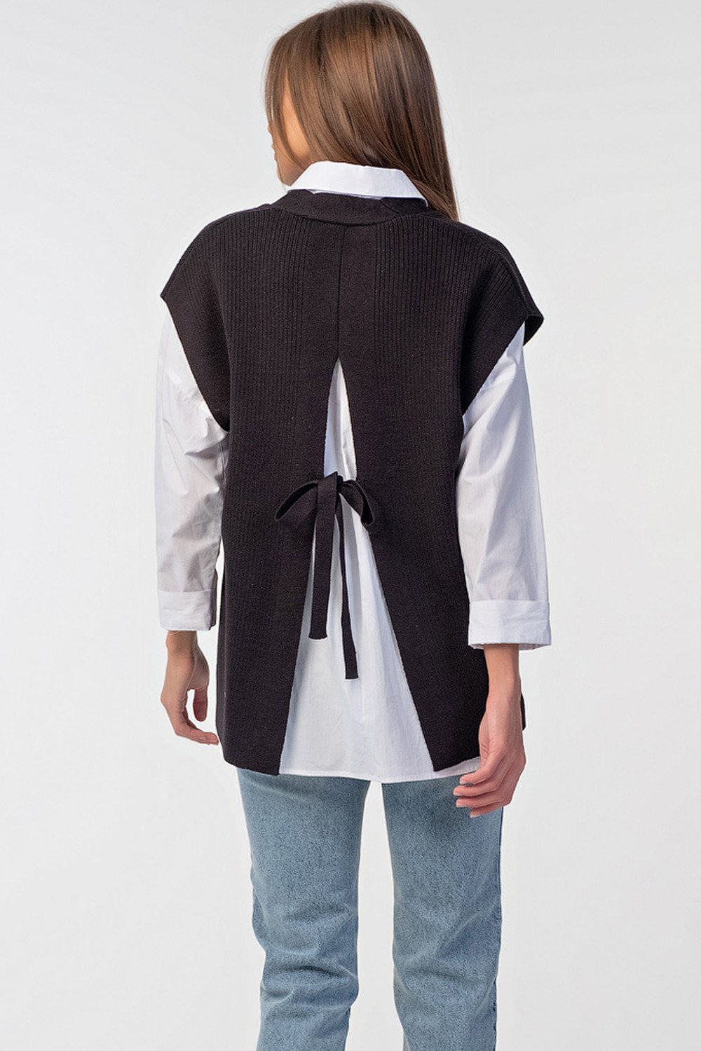 • Длина изделия: по спинке около 70 см. 40-42 р. Особенности: Вязаный жилет прямого силуэта из полушерстяной пряжи выполнен фактурной вязкой с широкой цельновязаной обтачкой по пройме и горловине. По спинке разрез с завязками.