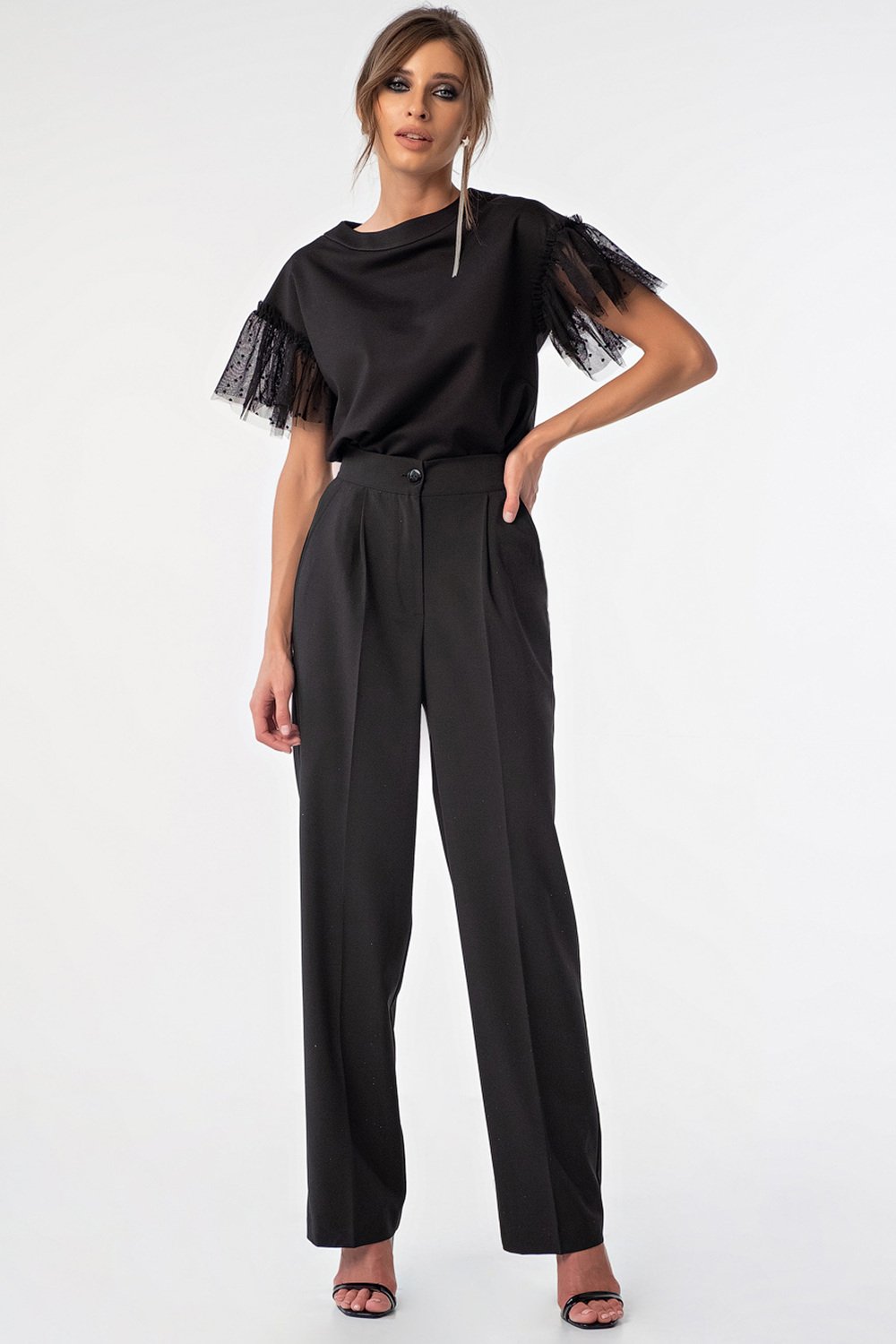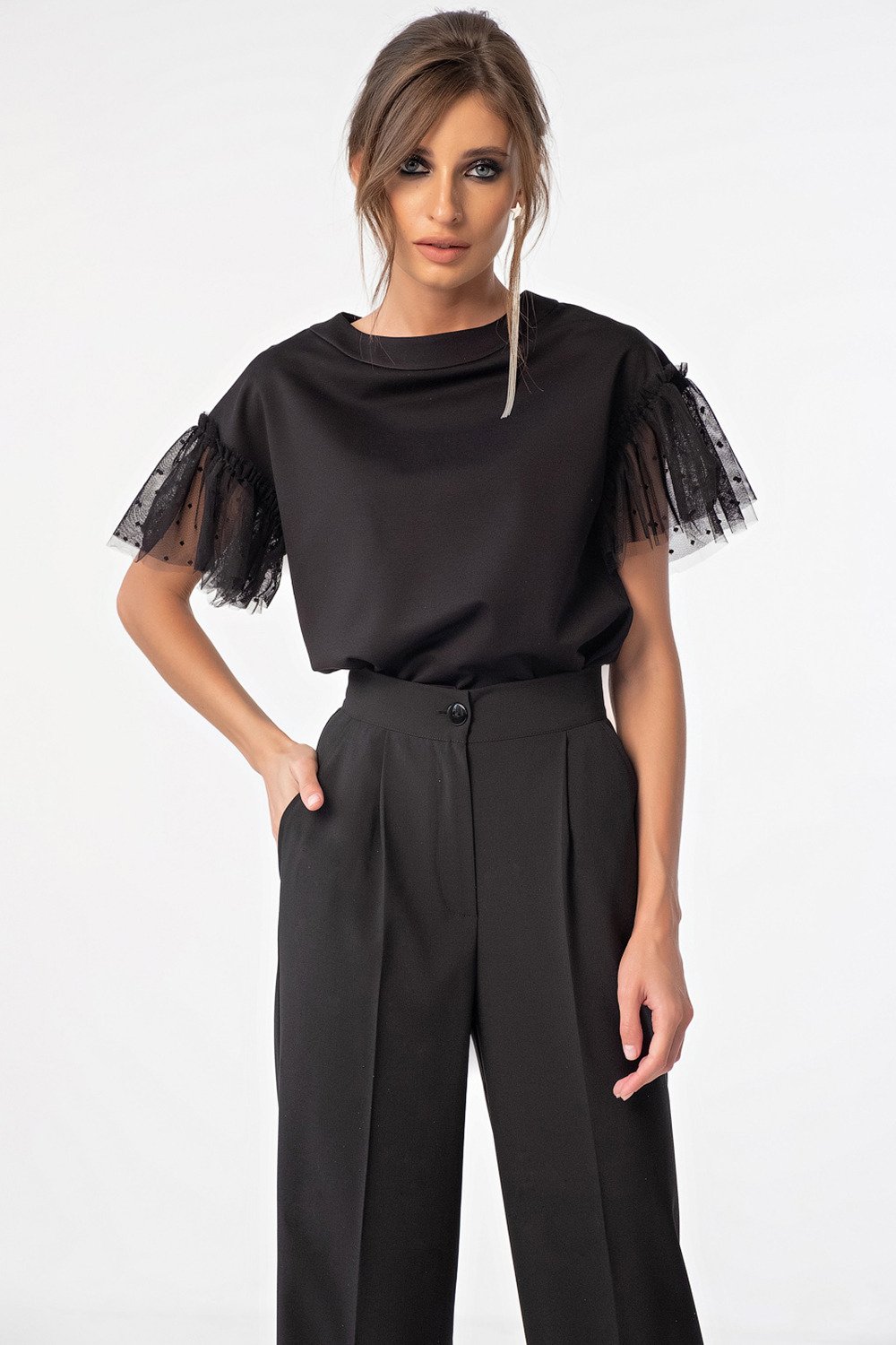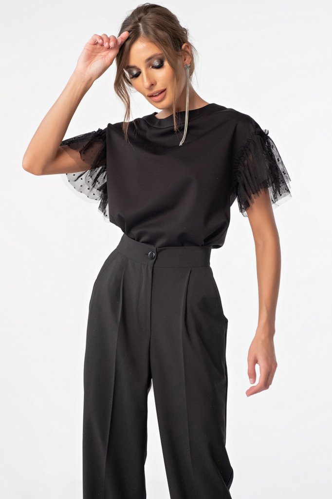 • Длина рукава: короткие расклешенный • Тип горловины: округлый • Линия плеча: спущенная • Силуэт: свободный • Рост модели на фото: 171 см • Размер модели на фото: 40 р-р