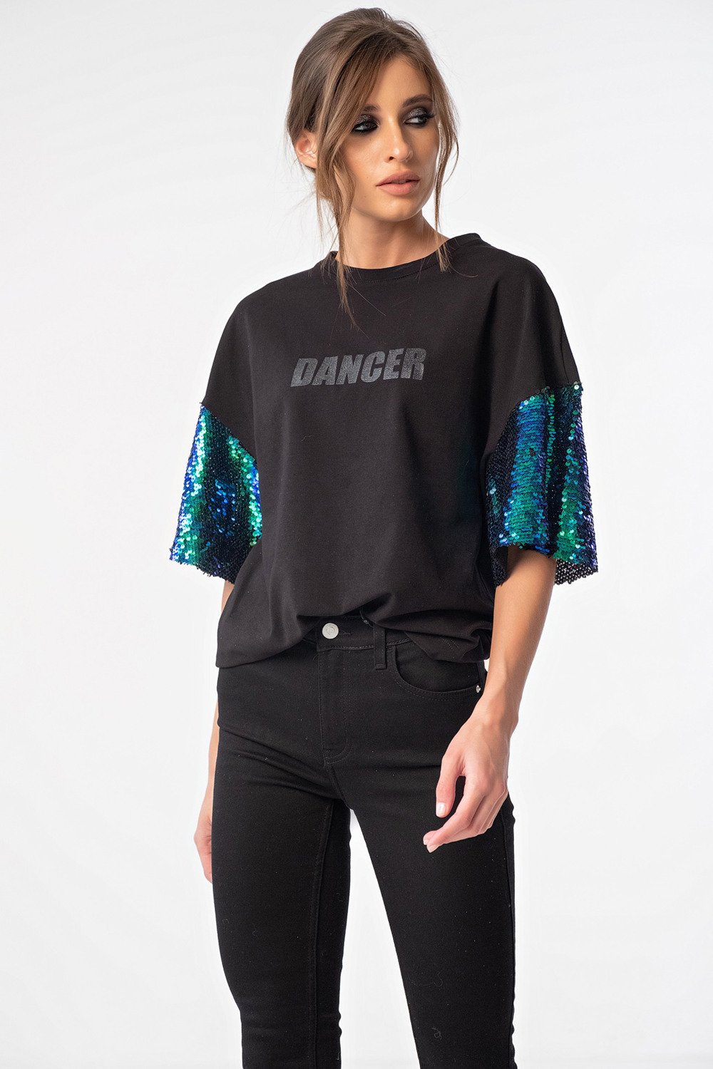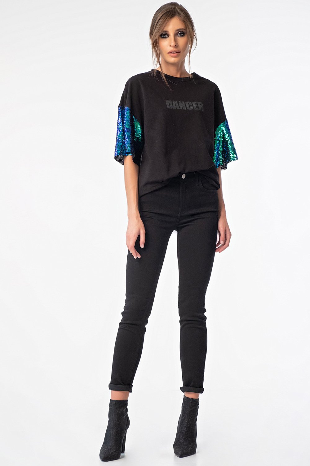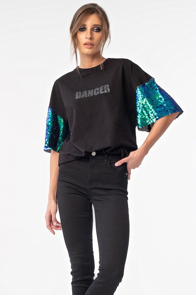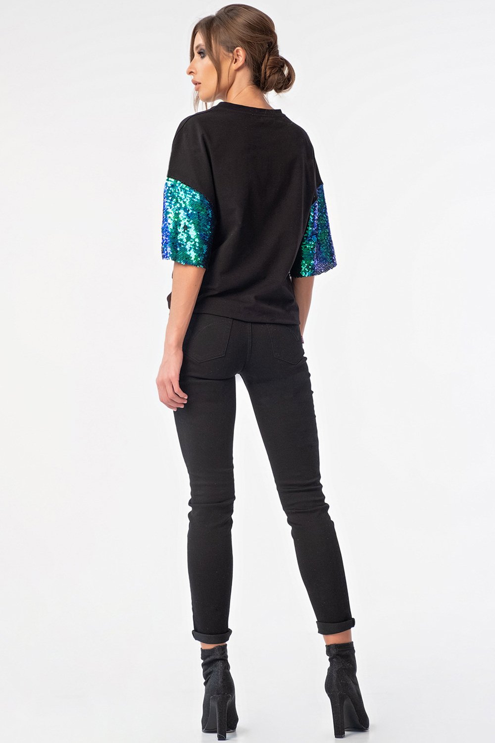 • Особенности: рукава выполнены из трикотажной ткани в черную пайетку, принт на переде изделия
