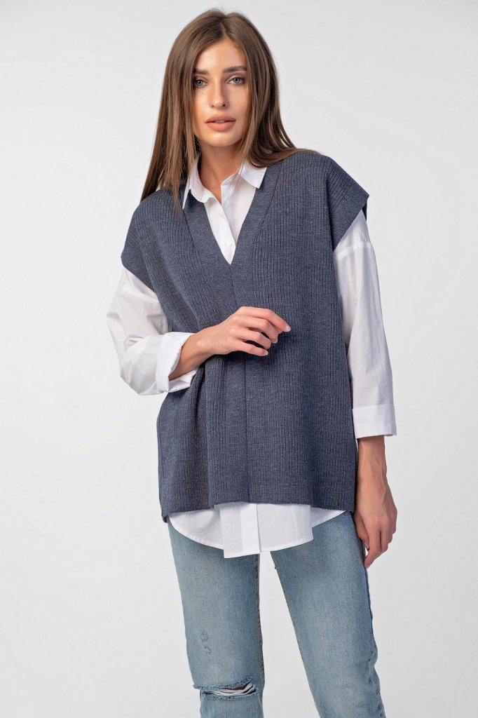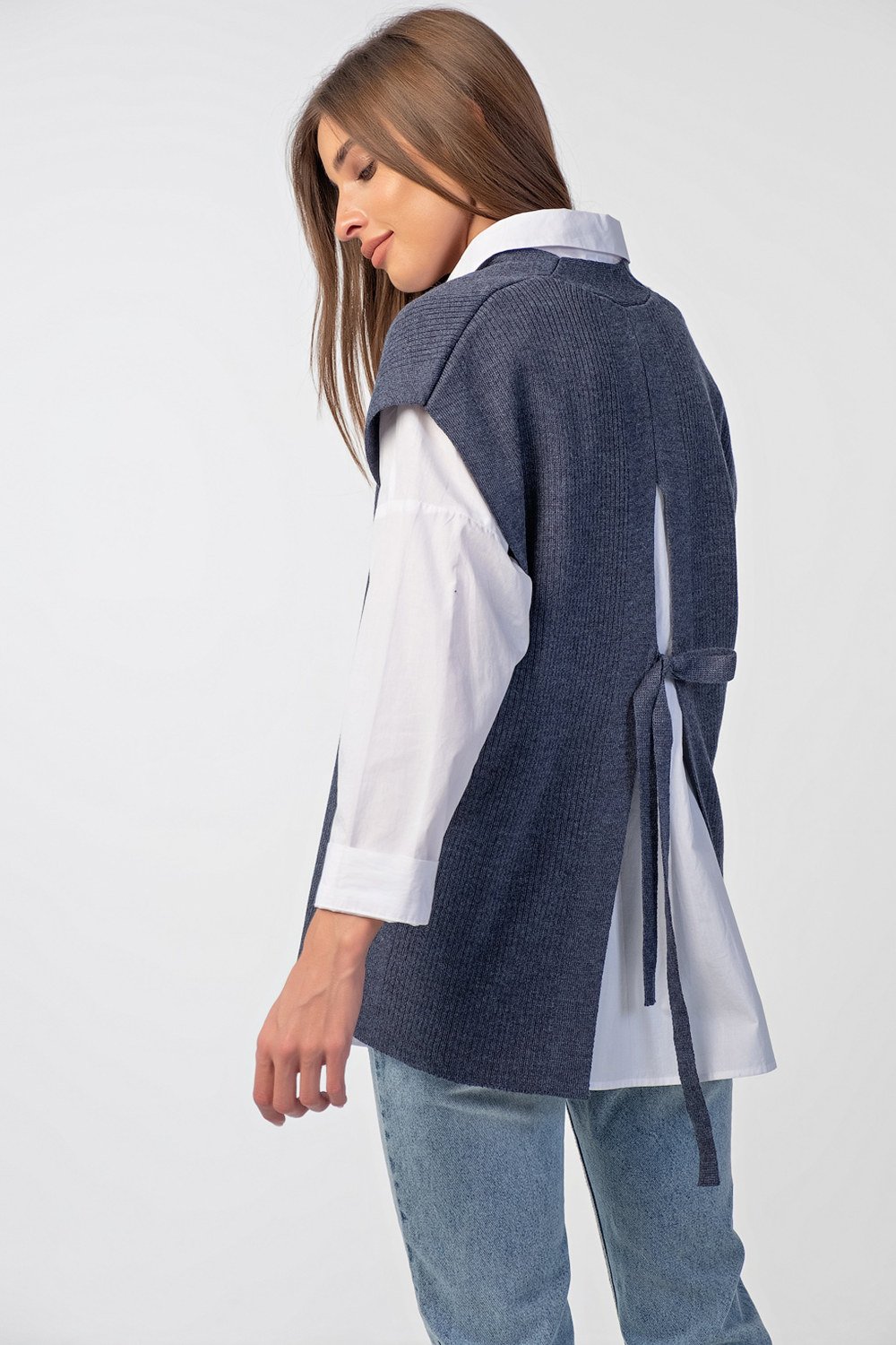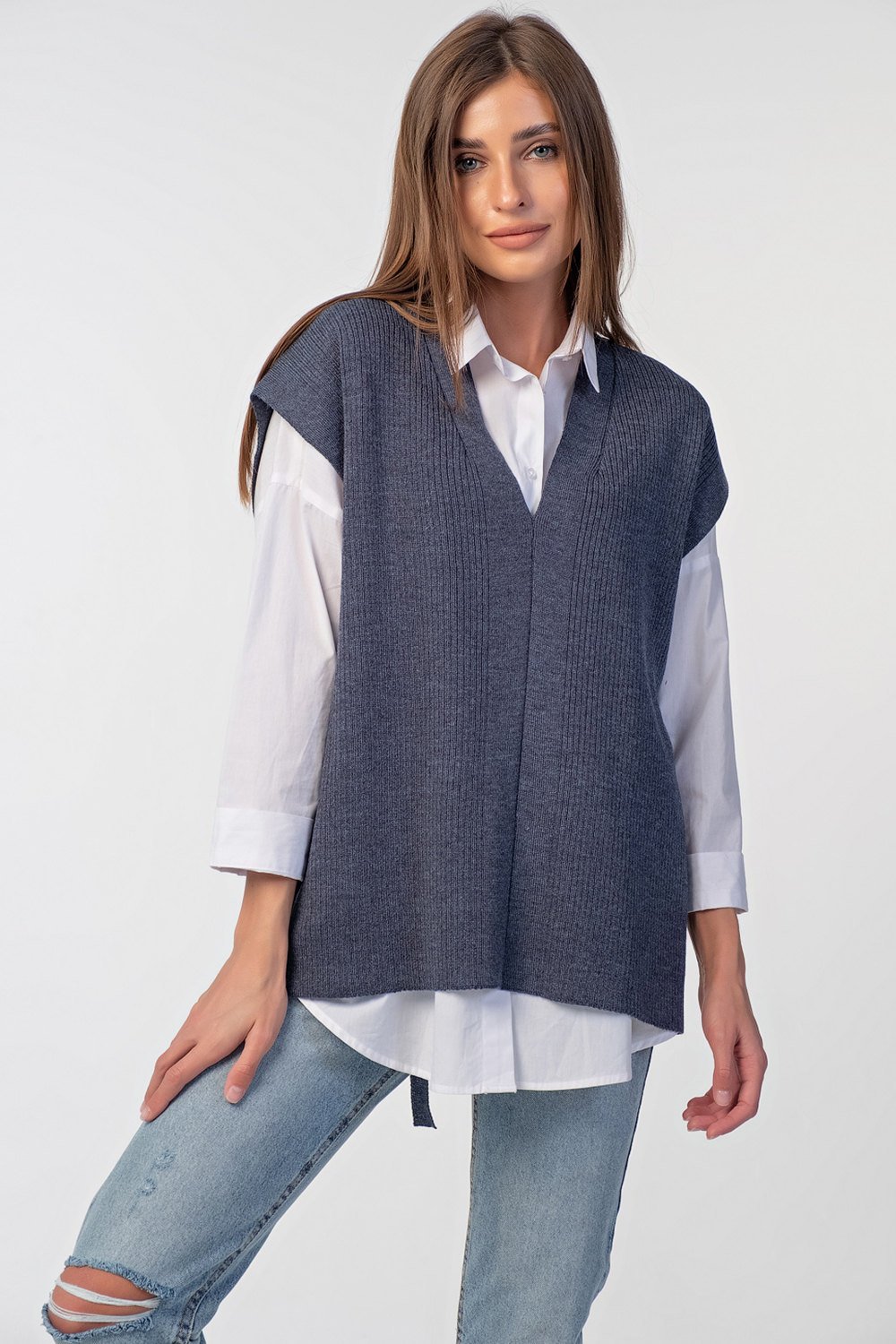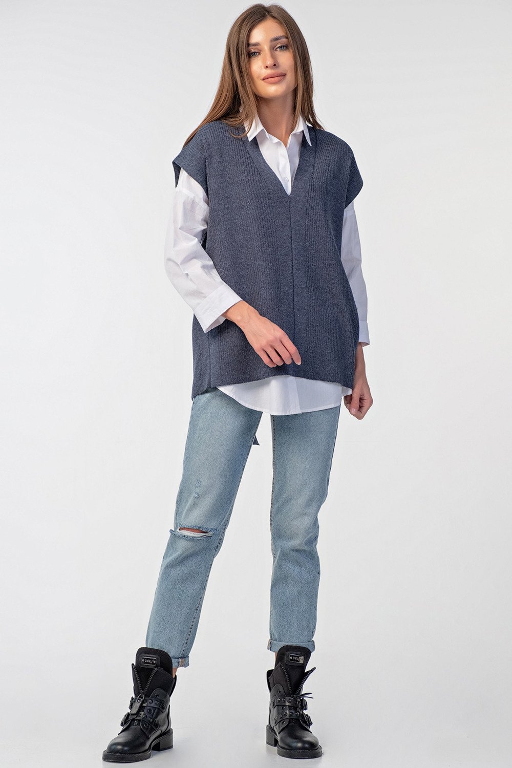 • Особенности: Вязаный жилет прямого силуэта из полушерстяной пряжи выполнен фактурной вязкой с широкой цельновязаной обтачкой по пройме и горловине. По спинке разрез с завязками.