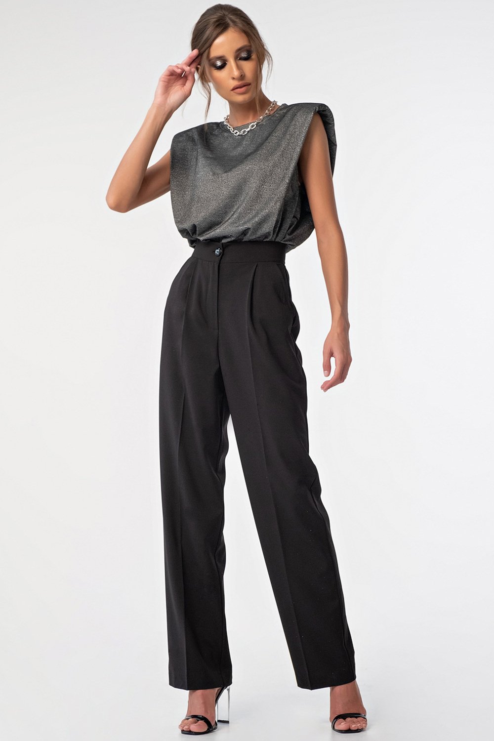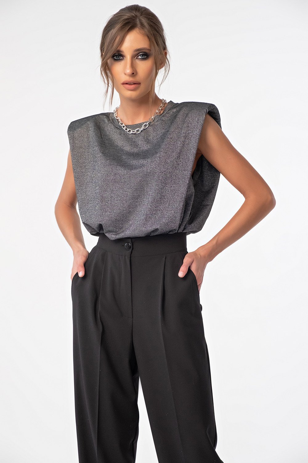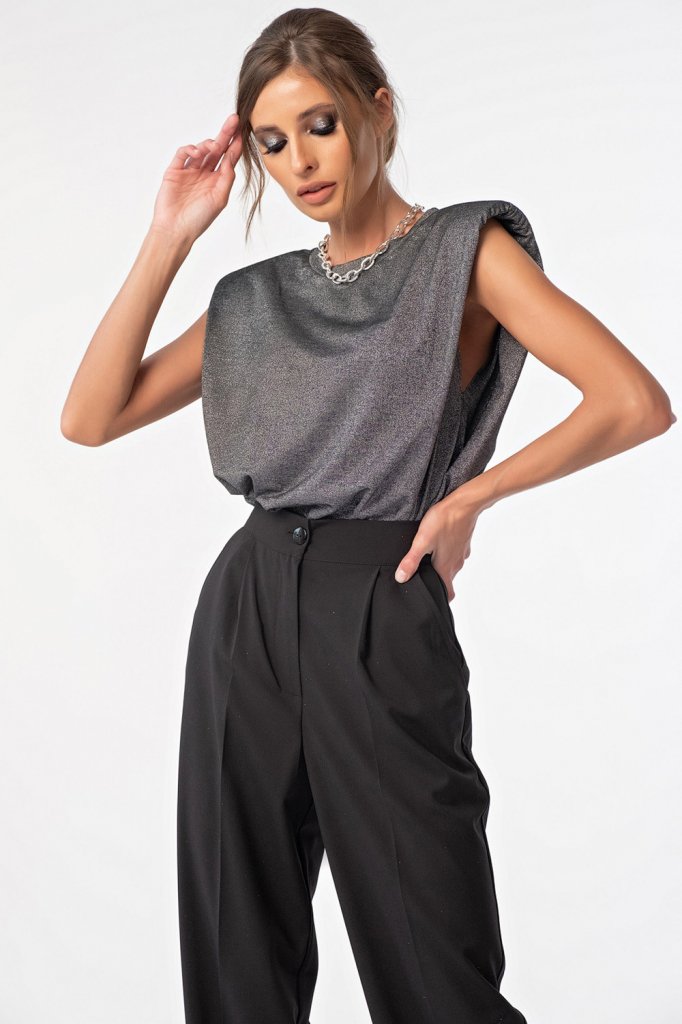 • Особенности: Футболка без рукавов свободного силуэта из трикотажа. Детали: горловина обработана бейкой, увеличенная линия плеча с драпировкой на подплечник. Без застежки.