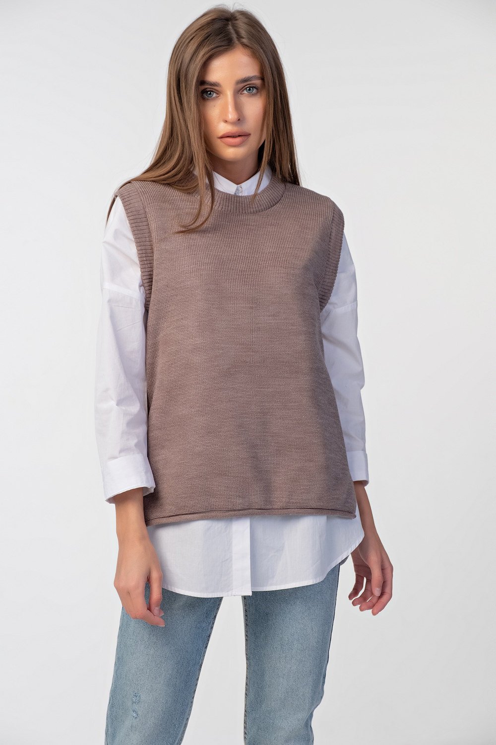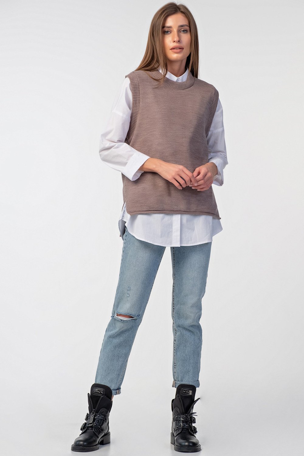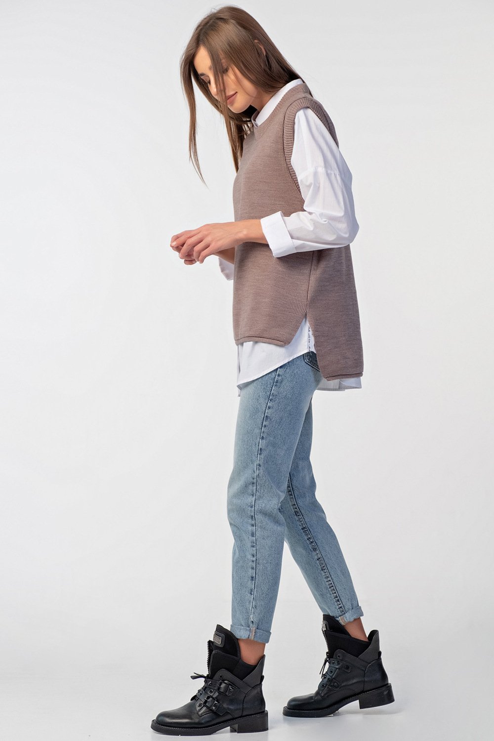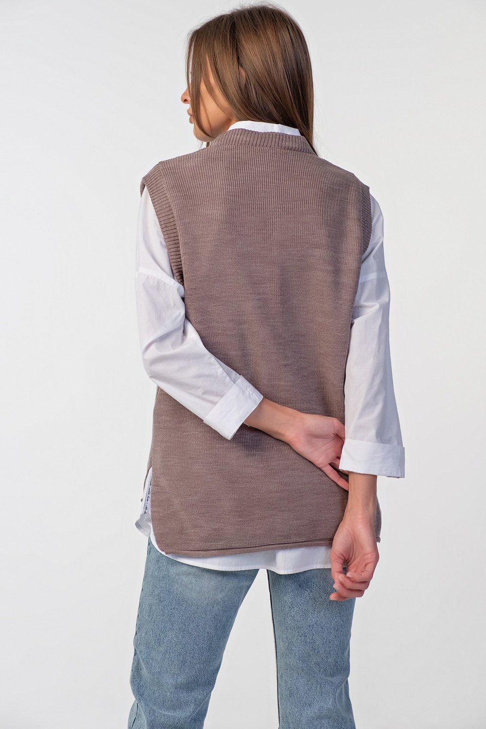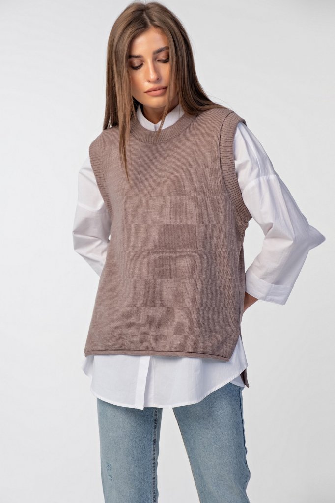 • Длина изделия: 69 см. Спинка длиннее переда на 7 см. Особенности: Вязаный жилет свободного силуэта с ассиметричным низом. Низ изделия оформлен закруткой по бокам выполнены разрезы.