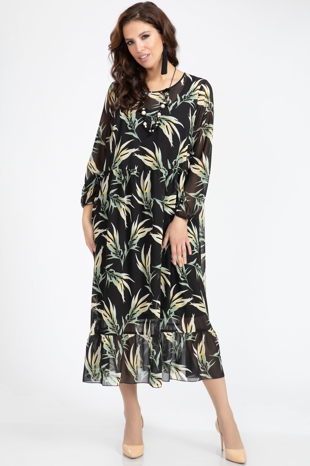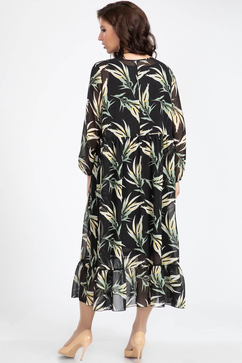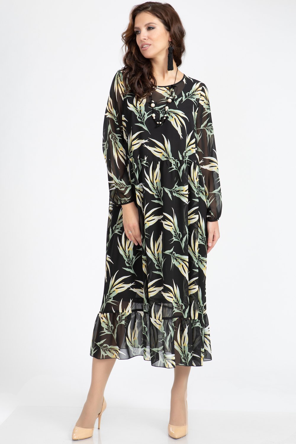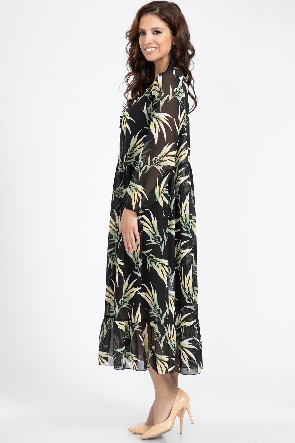 Платье трапециевидного силуэта, отрезное выше линии талии. По низу платья волан, собранный в сборку. Горловина круглая. Рукав втачной, длинный, присборенный по низу. К платью прилагается чехол из трикотажного подкладочного полотна.