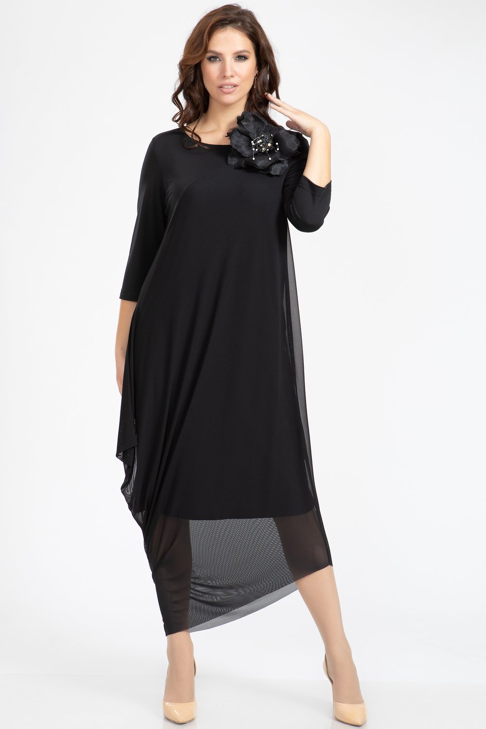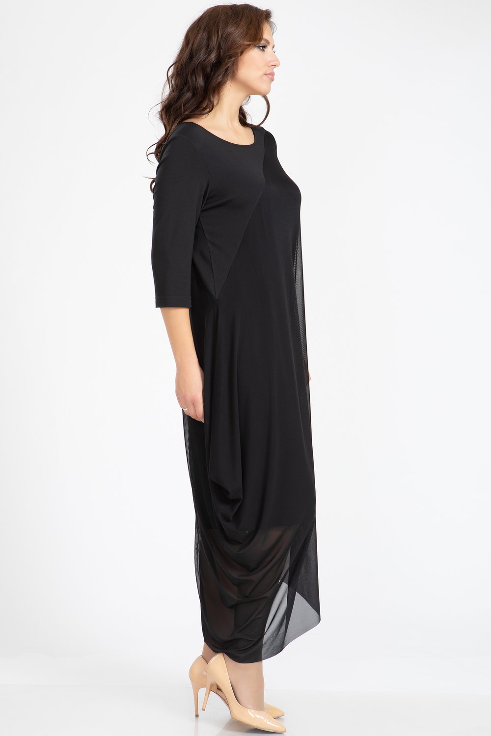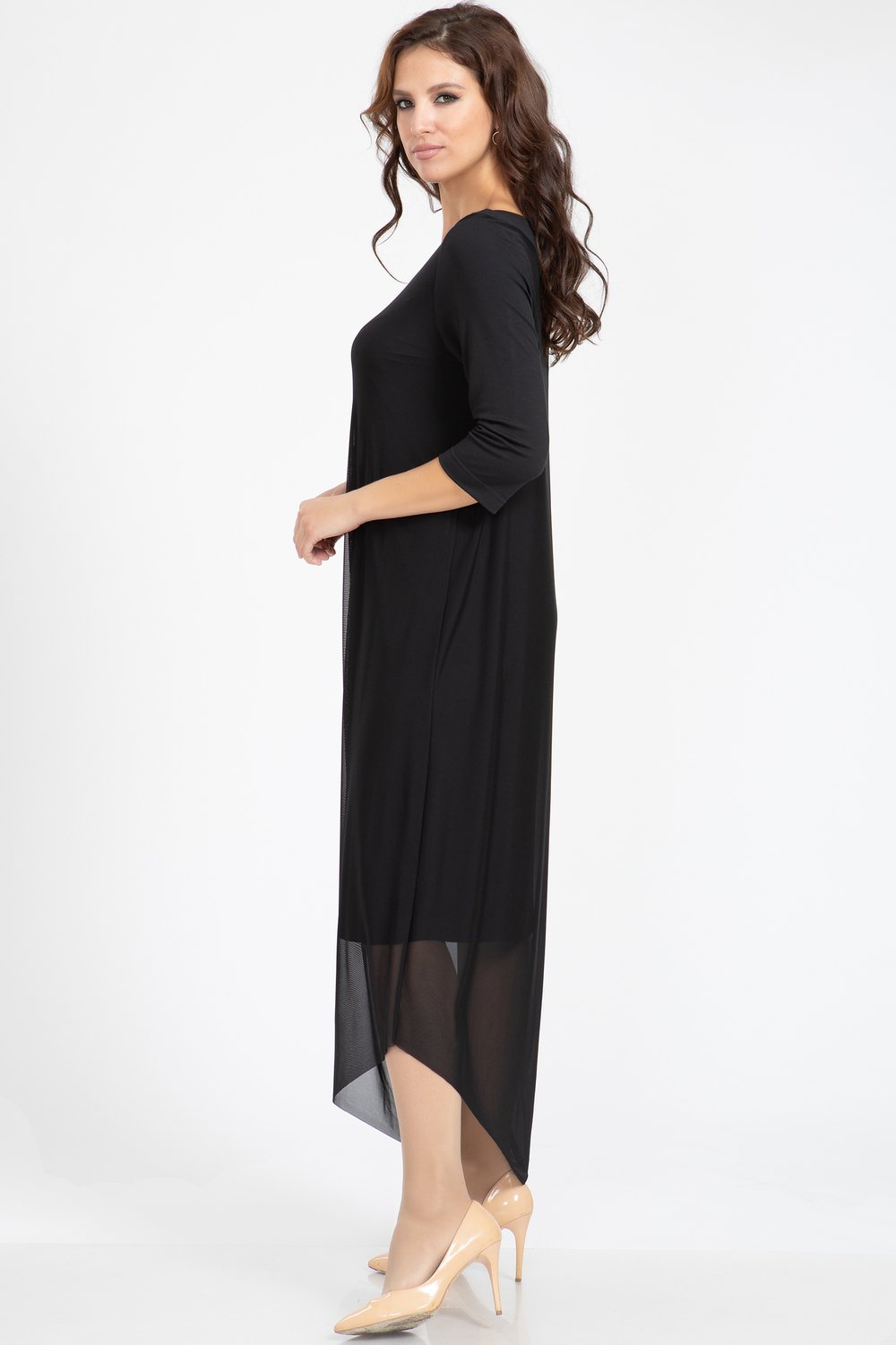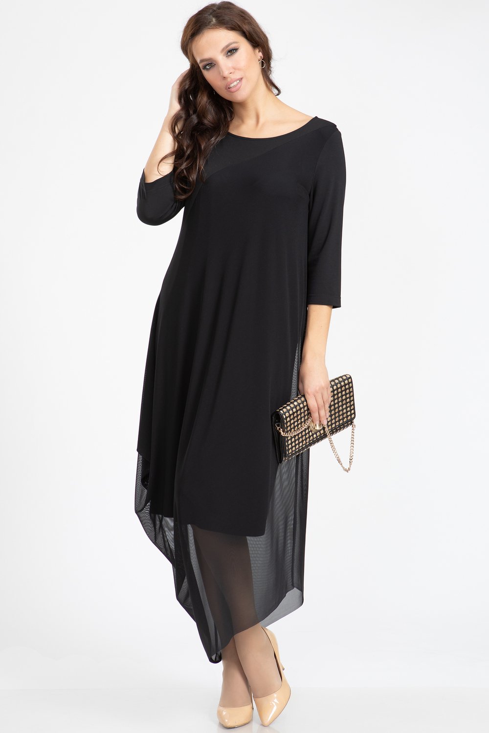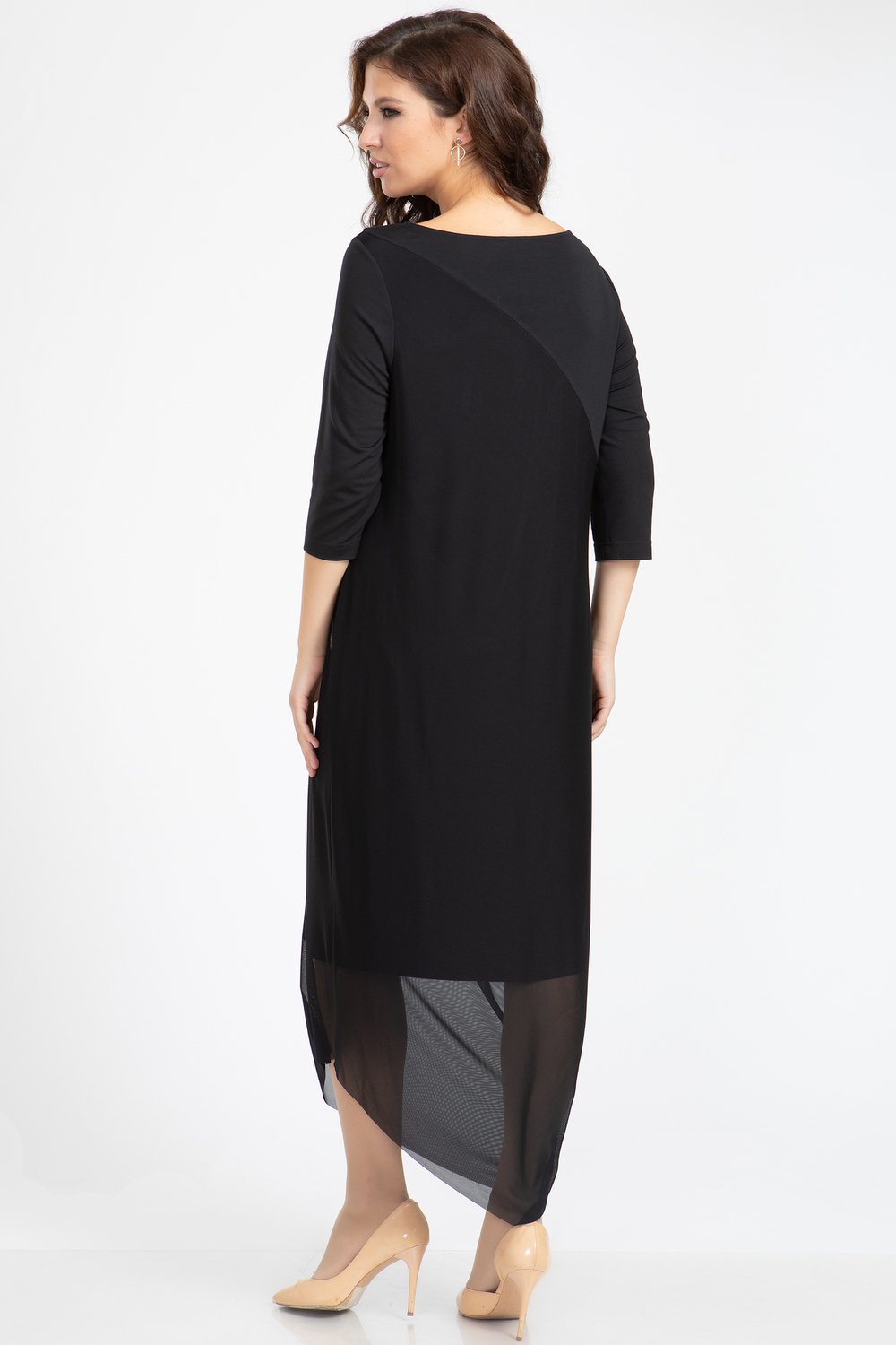 Платье полуприлегающего силуэта. Горловина круглая, рукав втачной, 3/4. Перед и спинка с асимметричной кокеткой. Низ изделия двойной — нижняя часть переда и спинки из трикотажного полотна- прямая, верхняя часть переда и спинки — разноуровневая, выполнена из сетки.Характеристики: