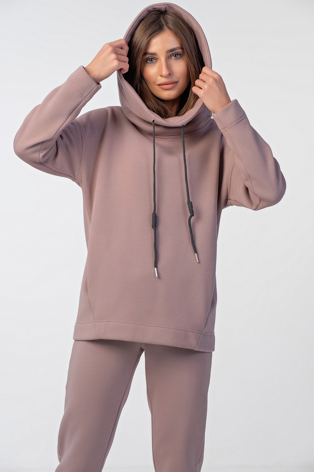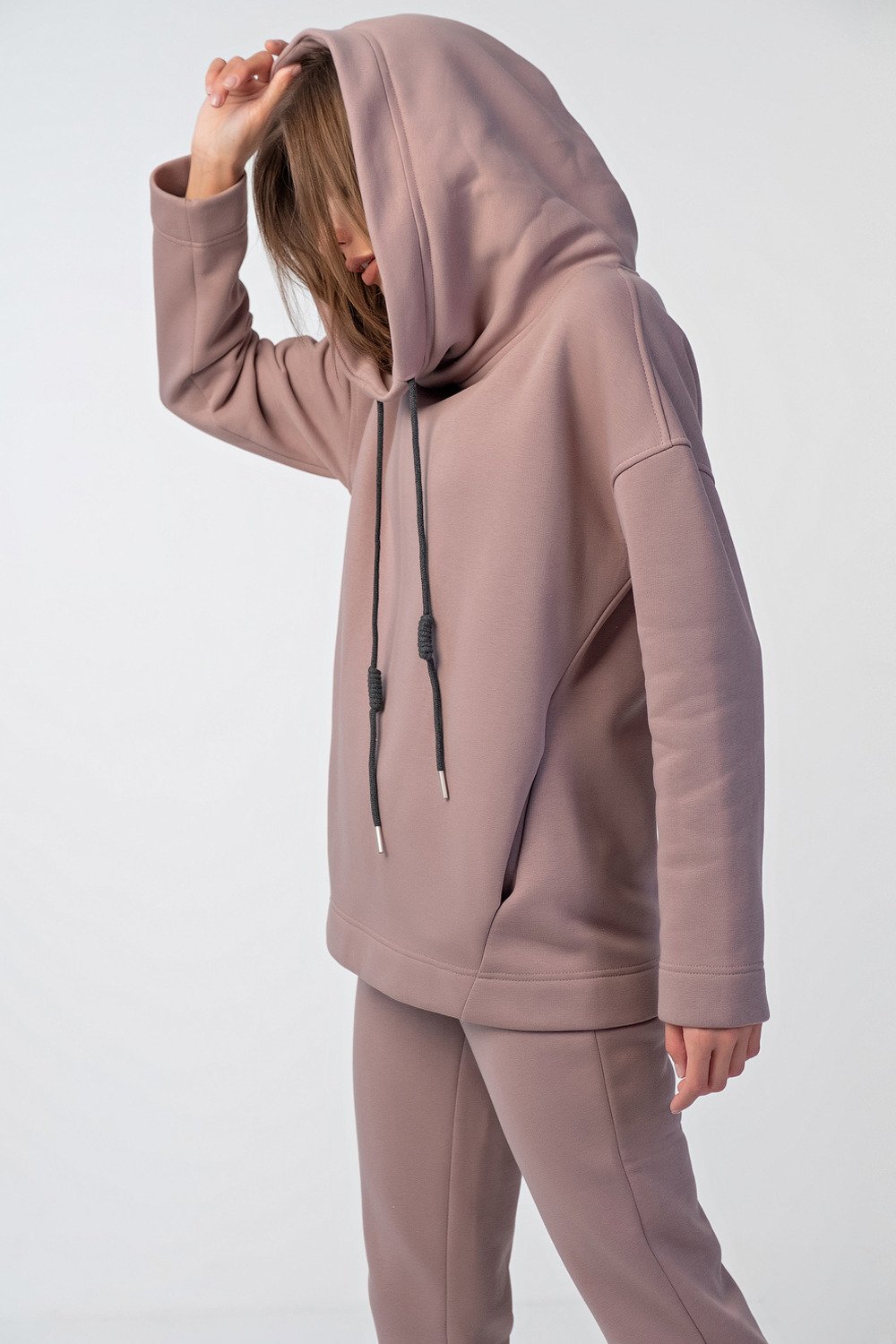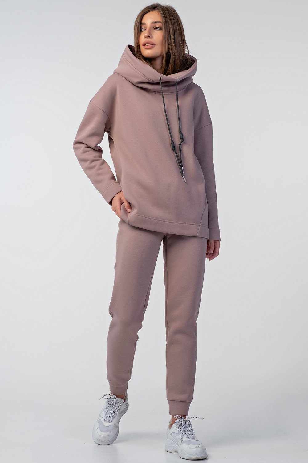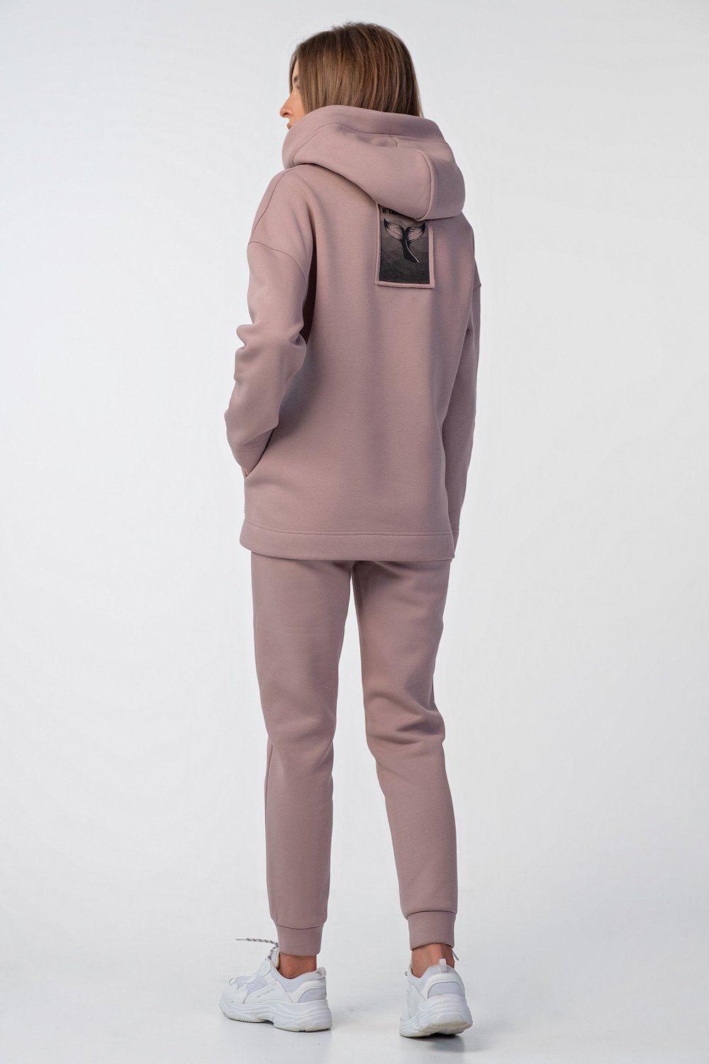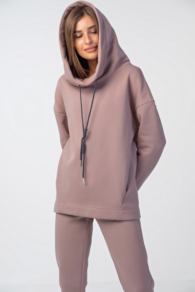 • Особенности: Костюм из футера с начесом. Детали свитшота: объемный капюшон-скафандр с подкладкой из футера, спущенная линия плеча, втачной рукав, боковые швы со смещением на перед, карман-кенгуру между боковых швов, нашивка с принтом на спинке. Детали брюк: притачной пояс из футера с перестрочкой, притачные манжеты по низу брюк.