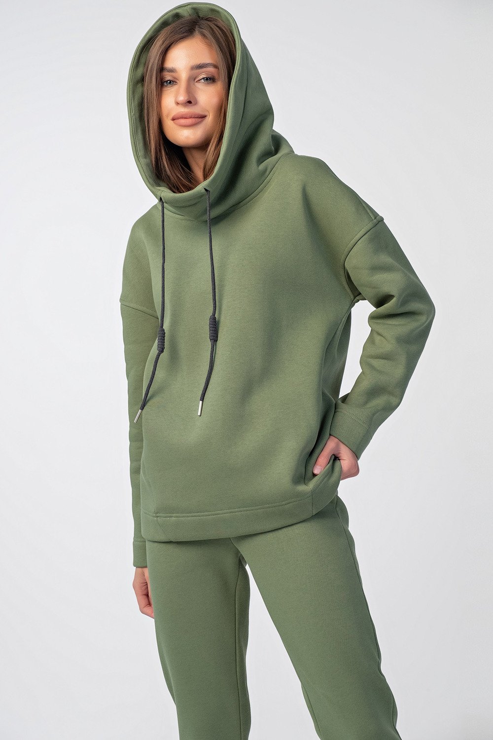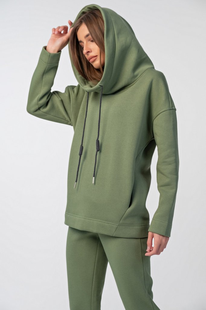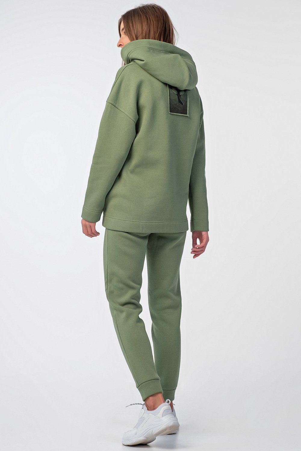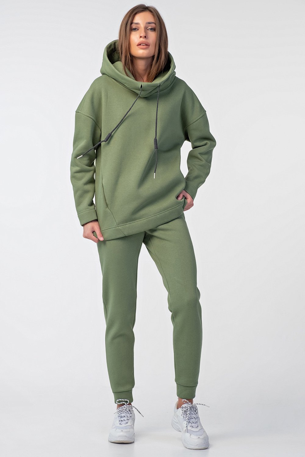 • Особенности: Костюм из футера с начесом. Детали свитшота: объемный капюшон-скафандр с подкладкой из футера, спущенная линия плеча, втачной рукав, боковые швы со смещением на перед, карман-кенгуру между боковых швов, нашивка с принтом на спинке. Детали брюк: притачной пояс из футера с перестрочкой, притачные манжеты по низу брюк.