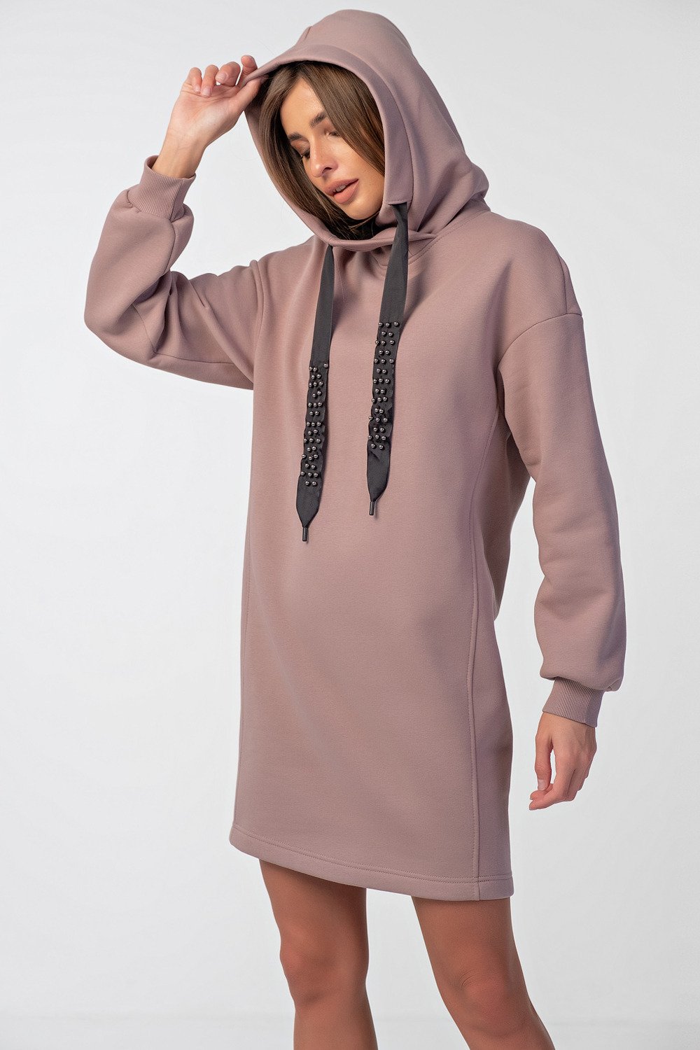 • Особенности: Объемное платье прямого силуэта из футера. Детали: капюшон, обработанный изнутри контрастным материалом, декоративные завязки с бусинами, втачной рукав со спущенной проймой, на манжете, также по рукаву нанесена вышивка с фирменным знаком; боковые швы смещены на перед и отстрочены.