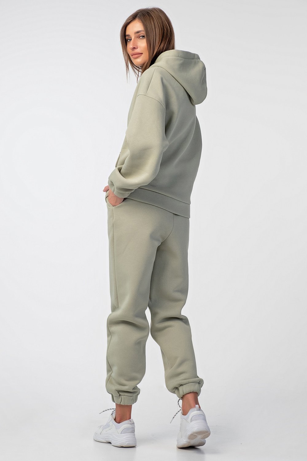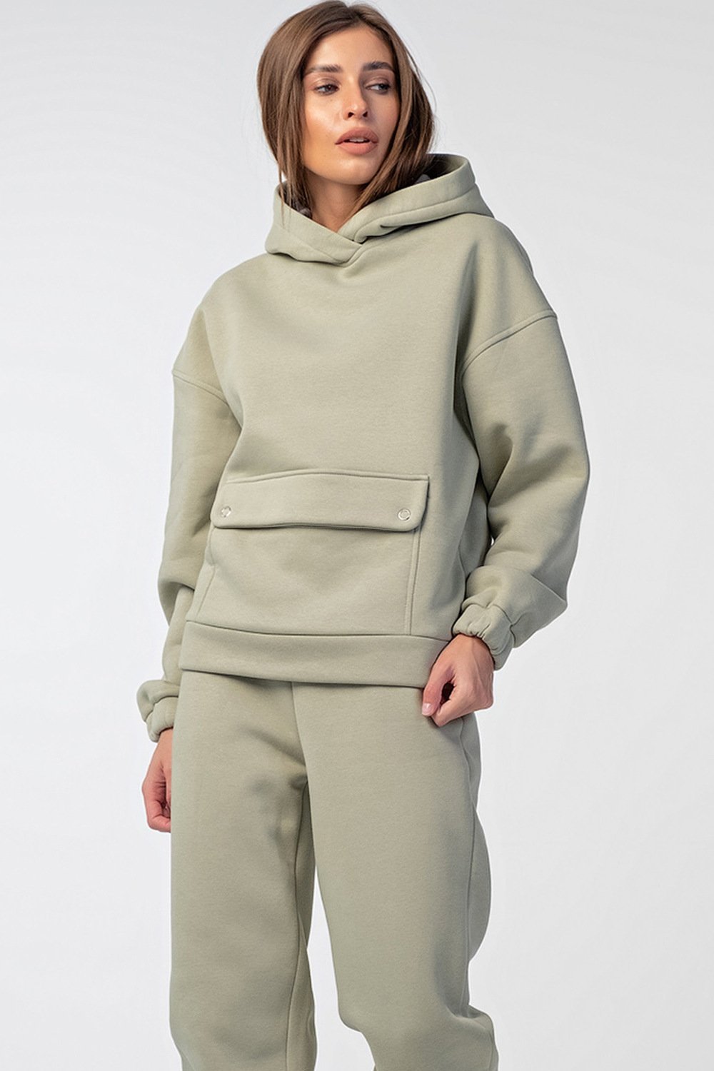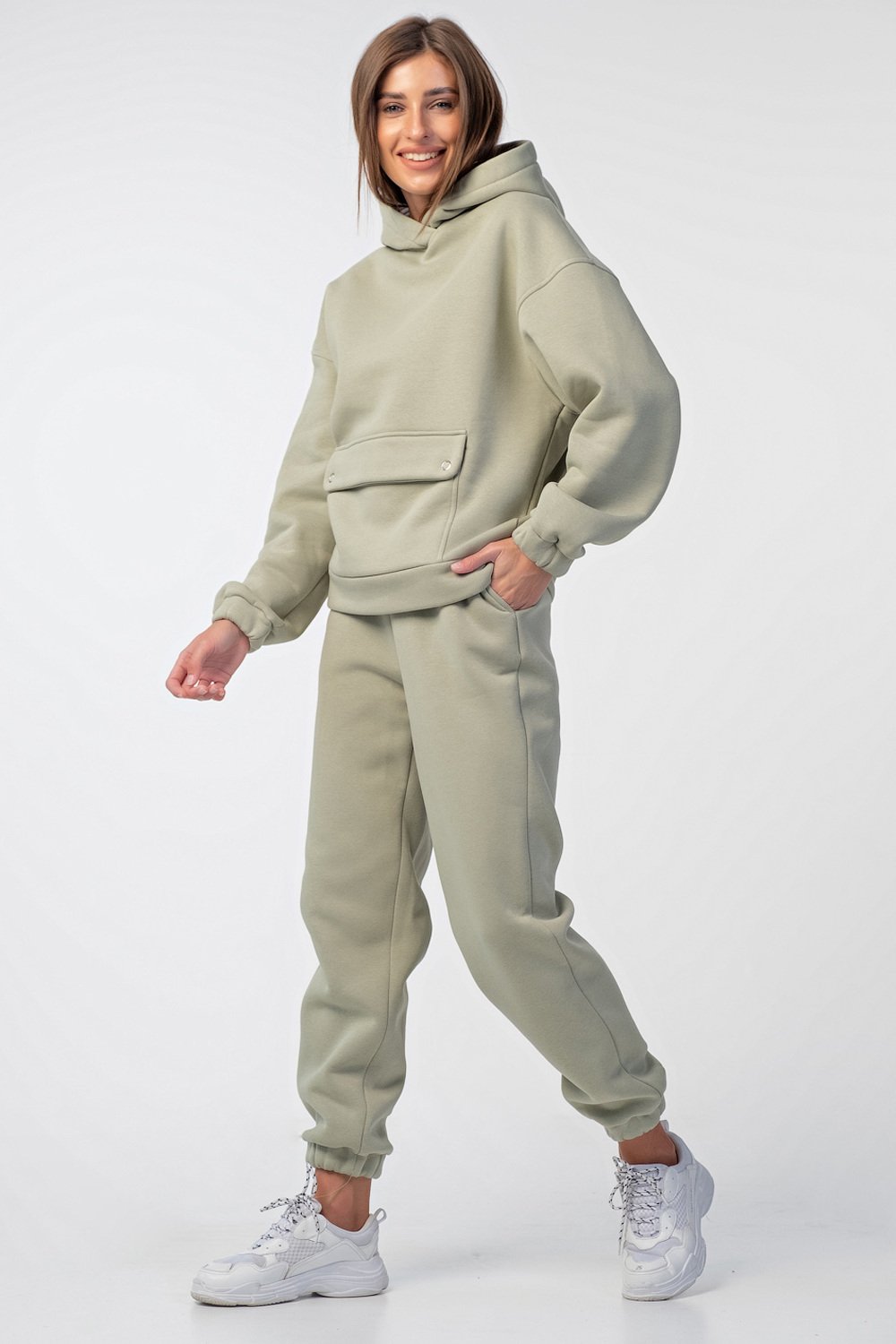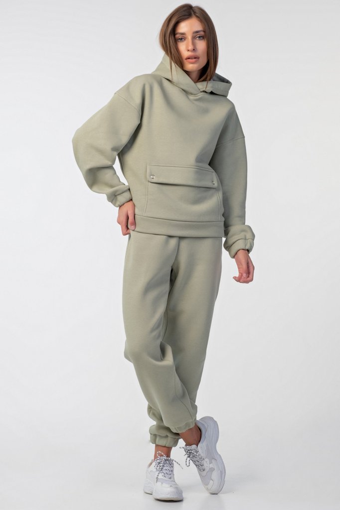 • Особенности: Костюм из свитшота с брюками из футера с начесом. Детали свитшота: капюшон на подкладке, спущенная линия плеча, втачной широкий рукав с манжетой, манжета из футера со сборкой на резину, накладной карман с клапаном, с застежкой на кнопки, по переду притачной пояс по низу свитшота из футера. Детали брюк: брюки свободного кроя с манжетами, по низу манжеты из футера со сборкой на резинку, притачной пояс из футера с резиной, боковые карманы.