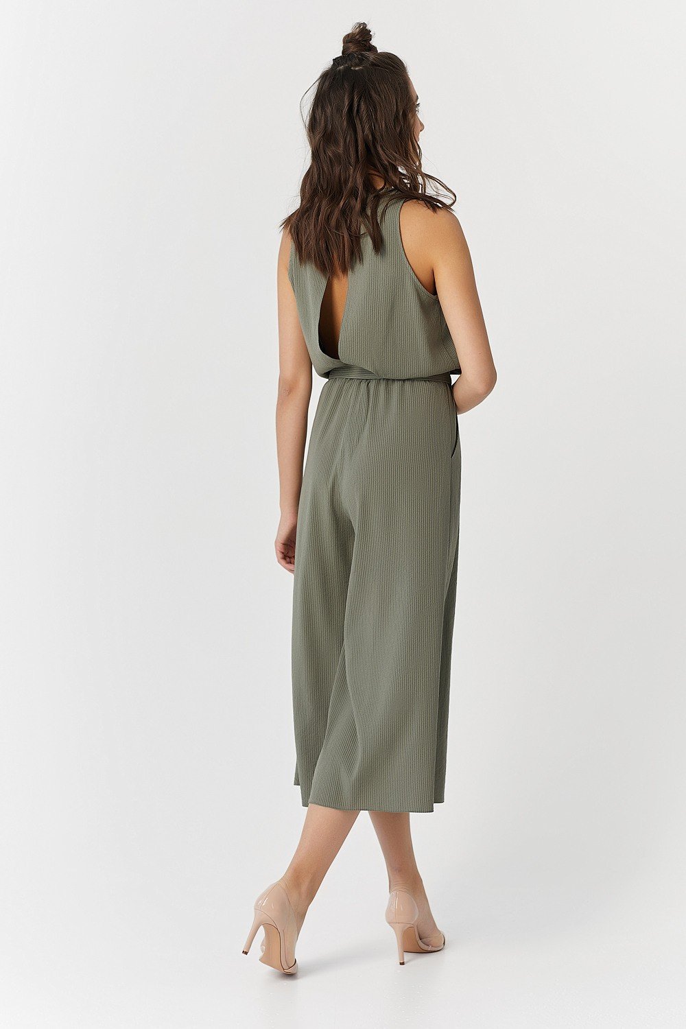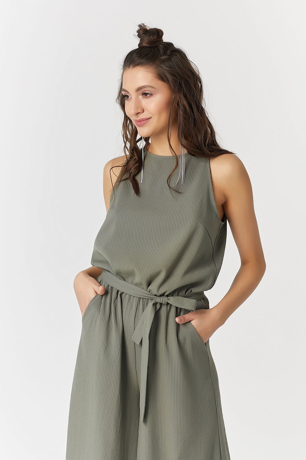 • Особенности: Комбинезон полуприлегающего силуэта по низу - брюки-кюлоты с расклешением. Детали: округлый вырез горловины американская пройма. В изделии предусмотрен напуск в верхней части. По талии - резинка и пояс в комплекте.