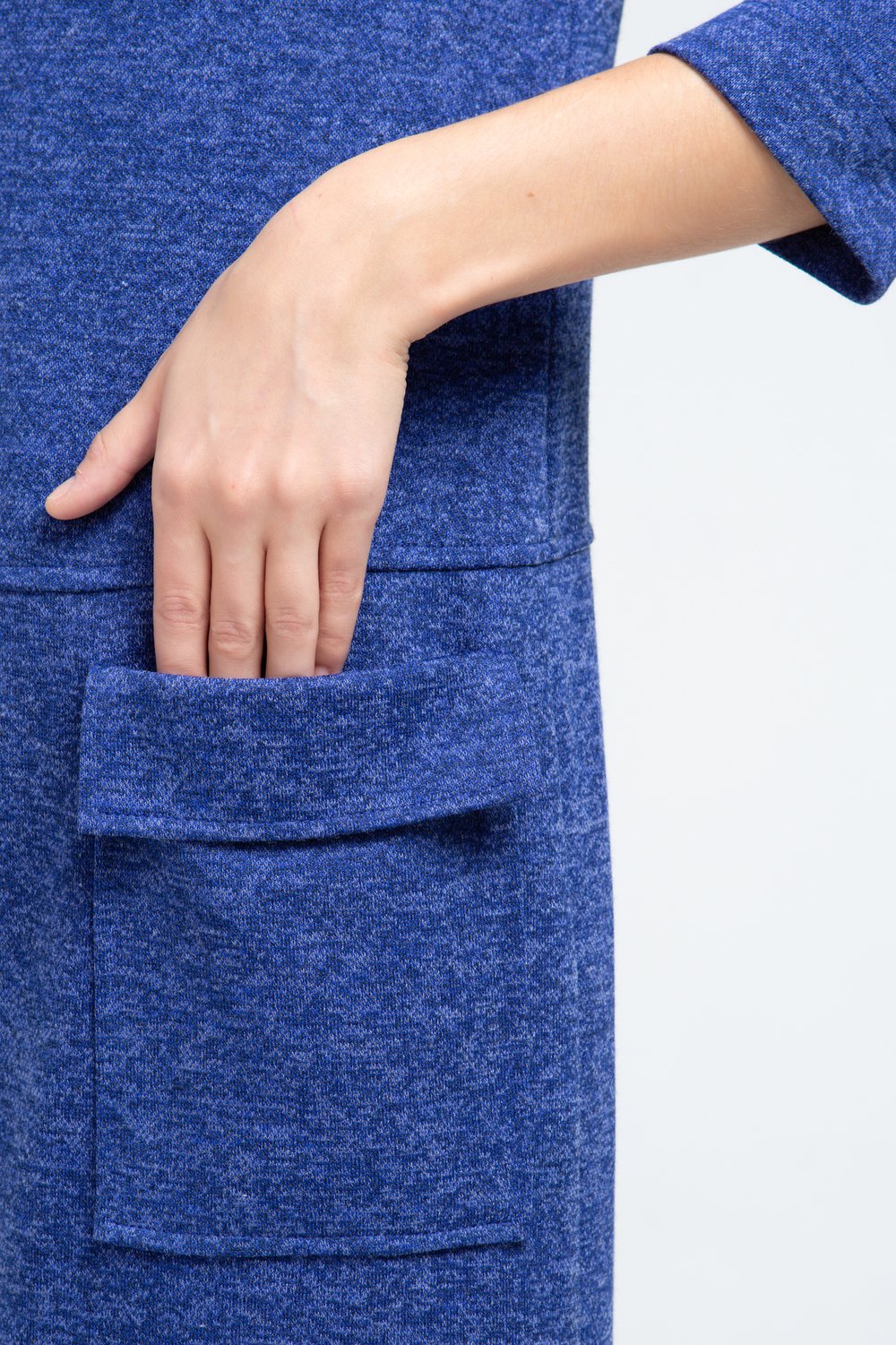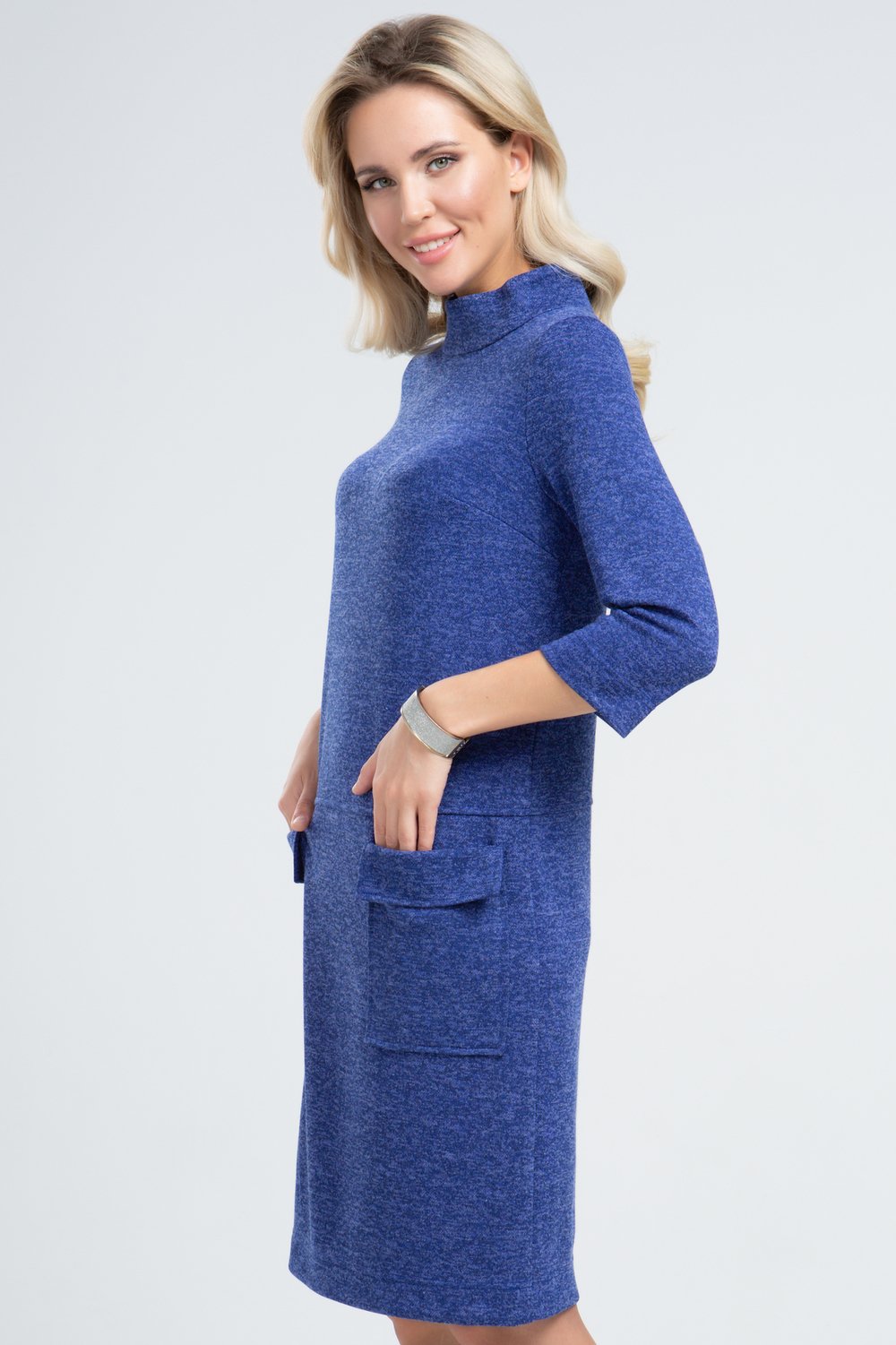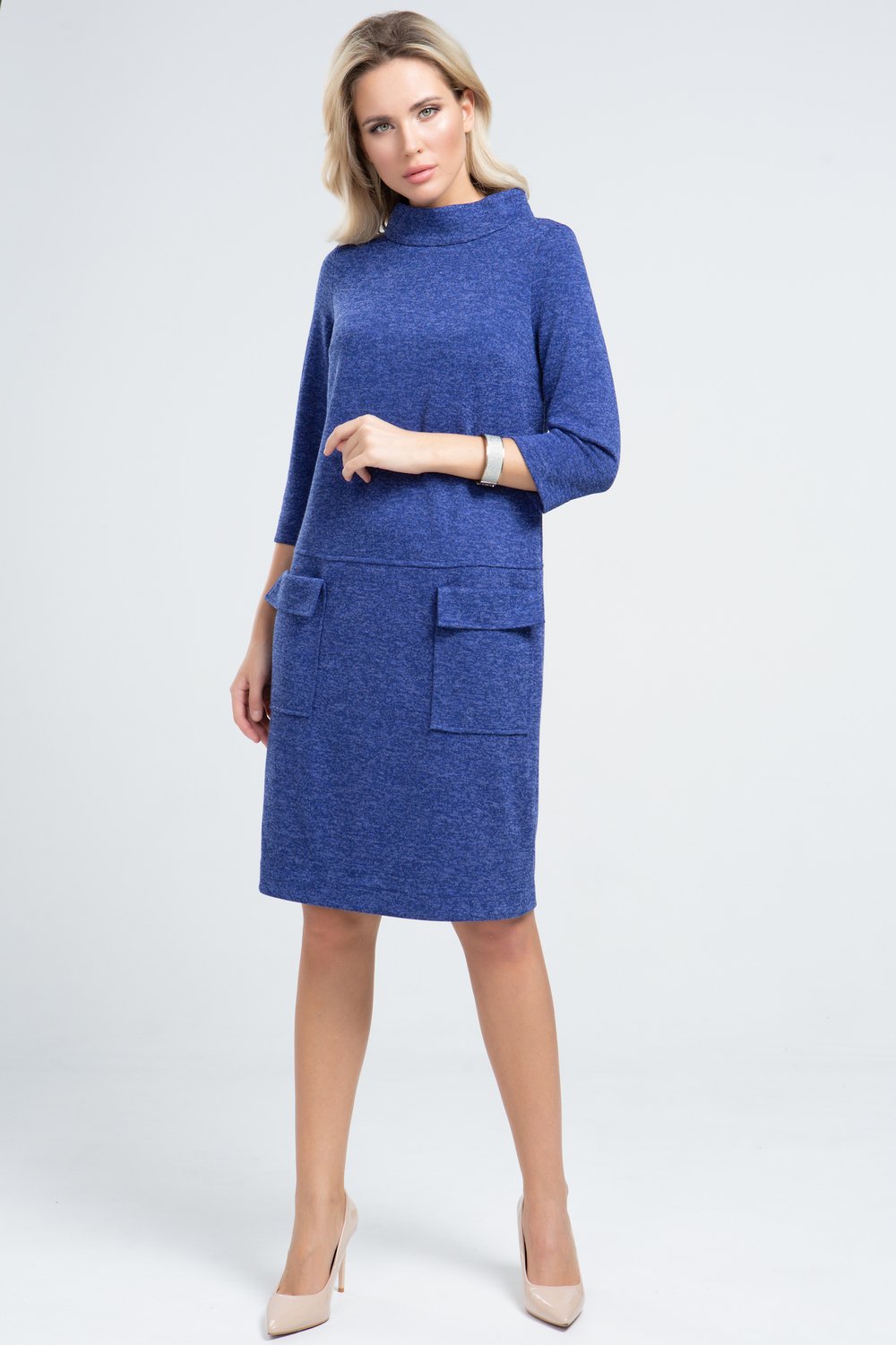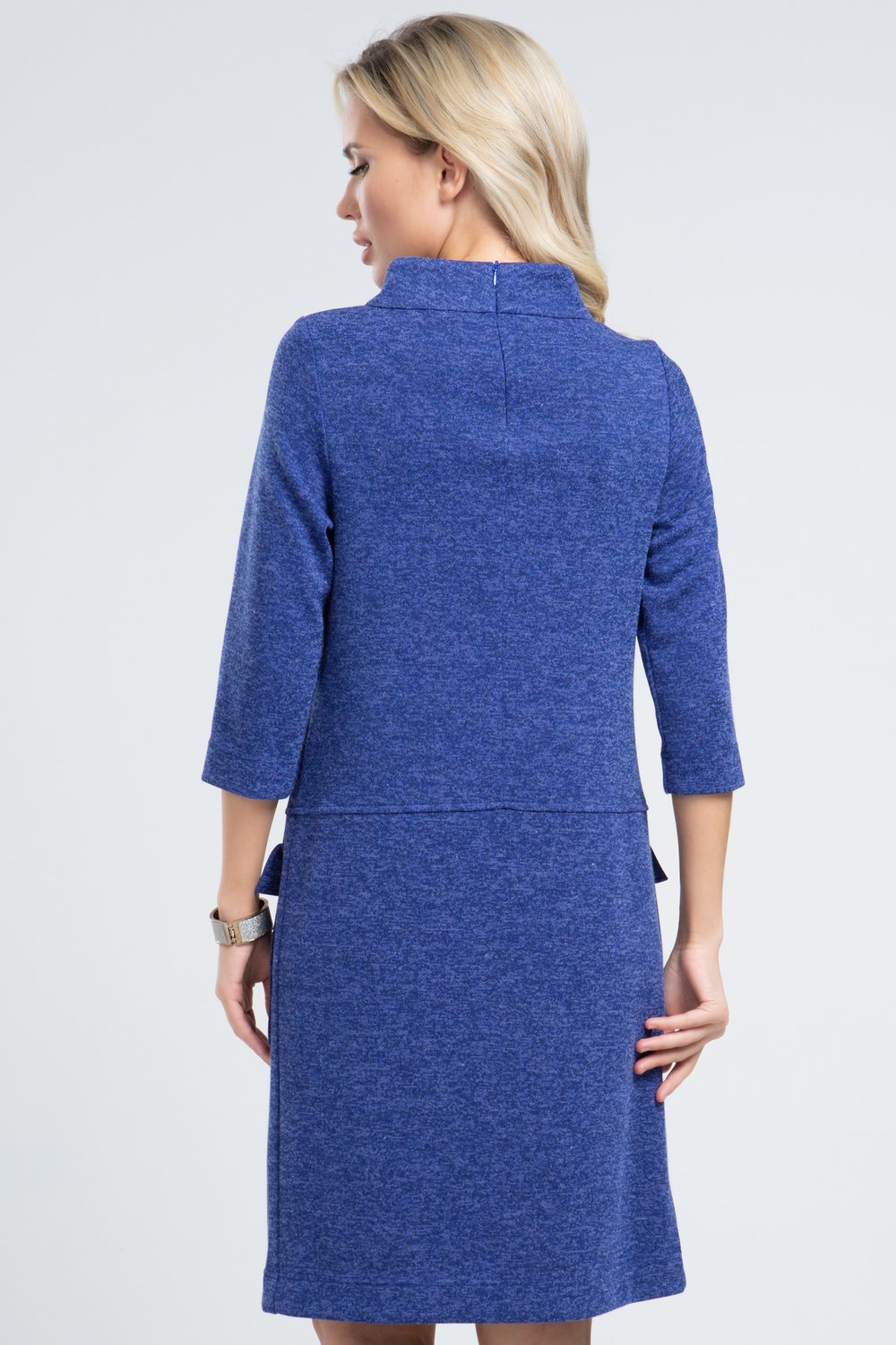 Платье прямого силуэта, отрезное по линии бедер. Воротник стойка, рукав втачной, 3/4. Нижняя часть переда с двумя накладными карманами с цельнокроеным клапаном. Спинка с застежкой на потайную молнию в среднем шве.