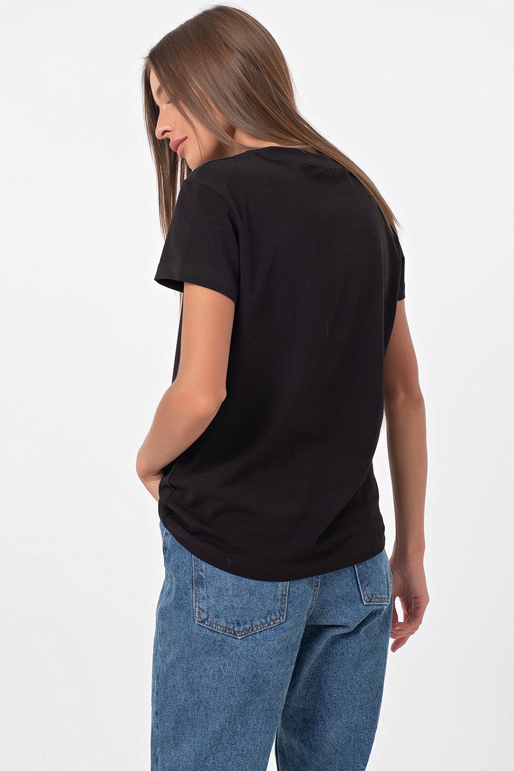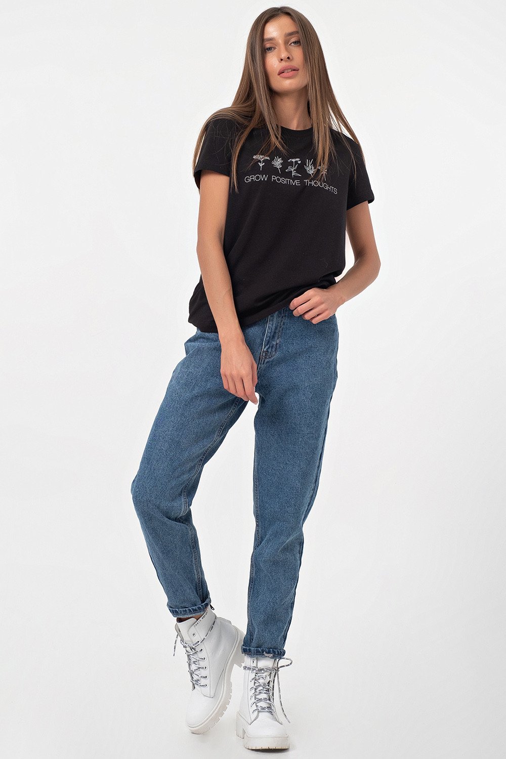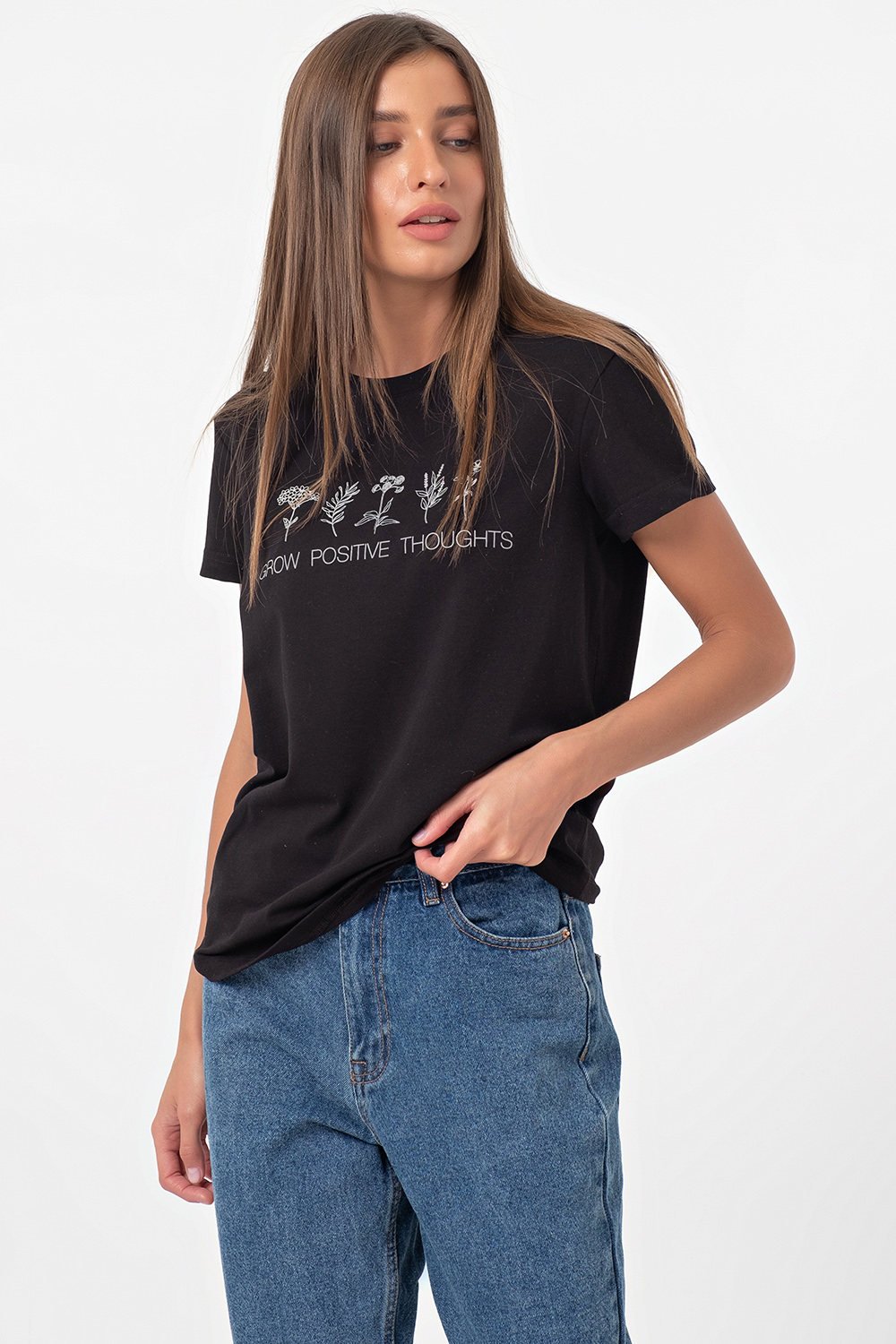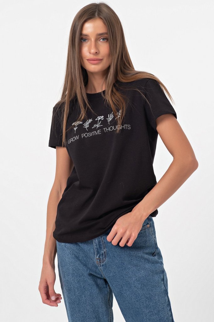 • Особенности: Футболка прямого силуэта из трикотажа. Детали: горловина обработана бейкой низ рукава обработан в подгибку с отстрочкой. По переду нанесен принт.