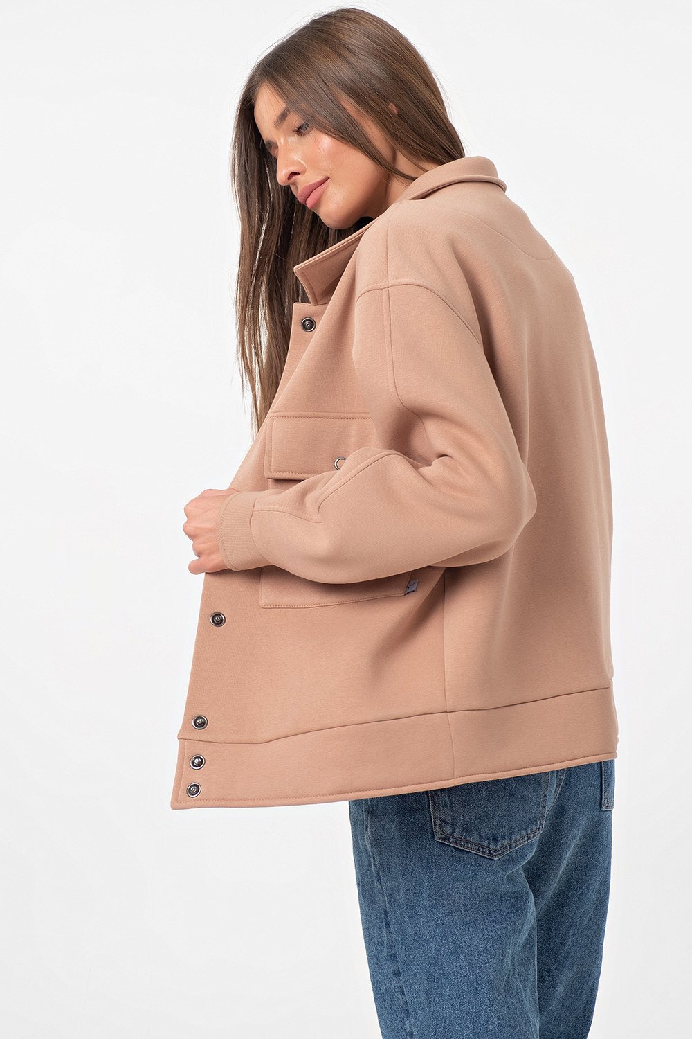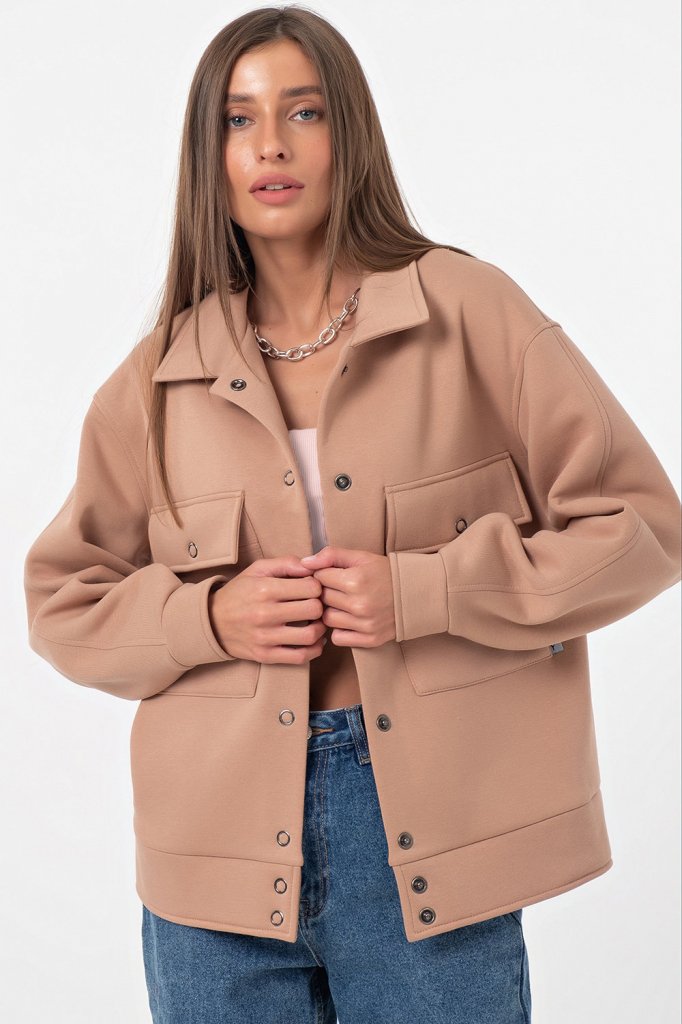 • Особенности: Бомбер свободного силуэта из футера с начесом. Детали: отложной воротник спущенная линия плеча. длинный рукав с манжетой с застежкой на кнопку по переду накладные карманы с клапанами с застежкой на кнопку по низу притачной пояс. Застежка по переду на кнопки.