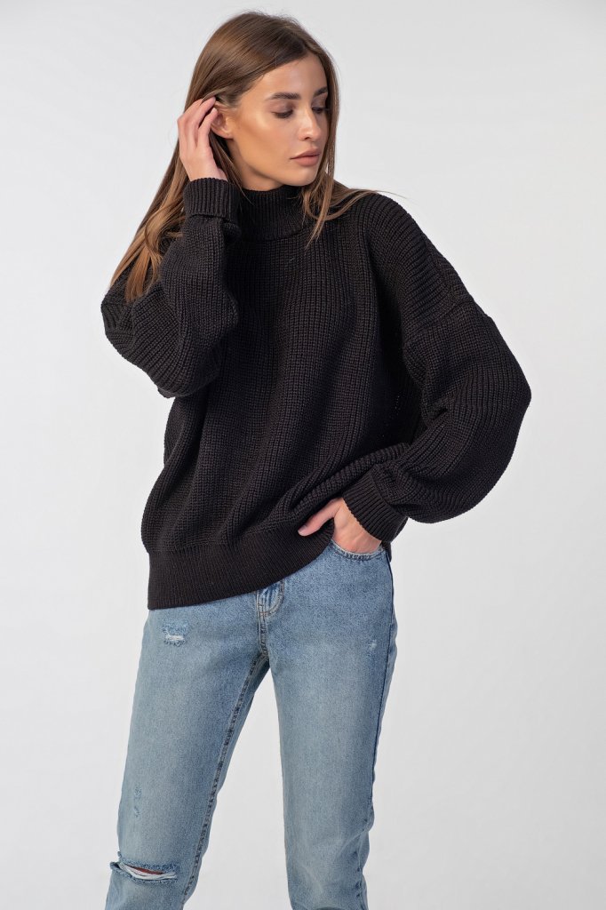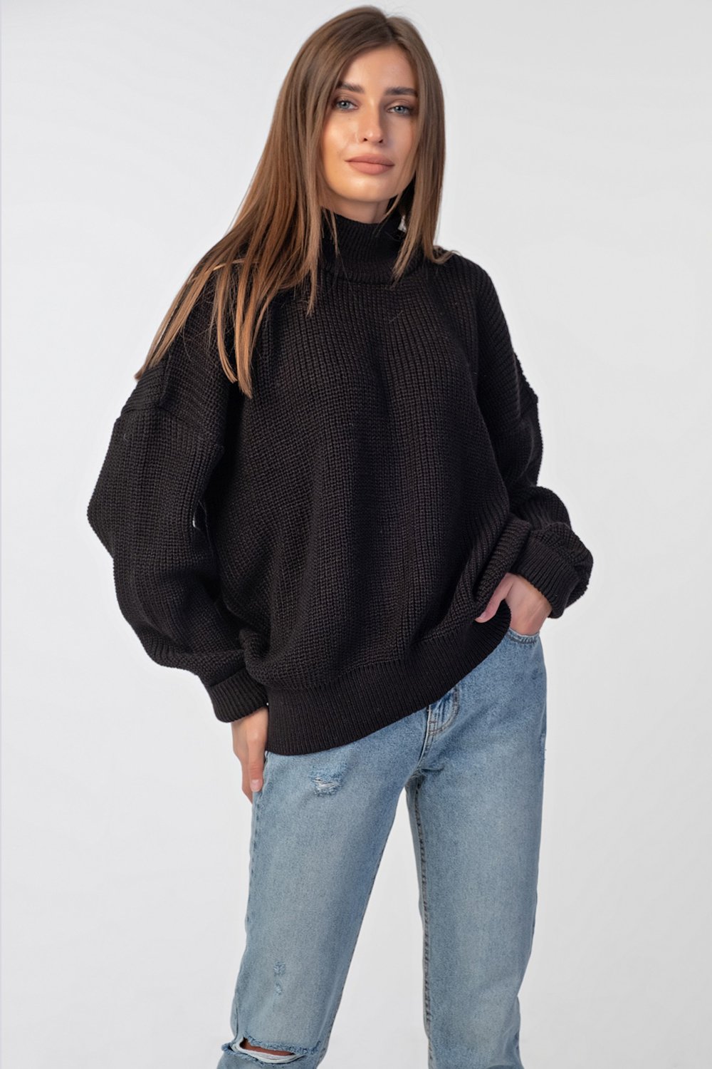 • Особенности: Объемный свитер выполнен фактурной вязкой из смесовой пряжи с асимметричным низом. Вырез горловины оформлен двойным воротником "стойка". Рукав со спущенной проймой, широкой цельновязаной манжетой с отворотом.