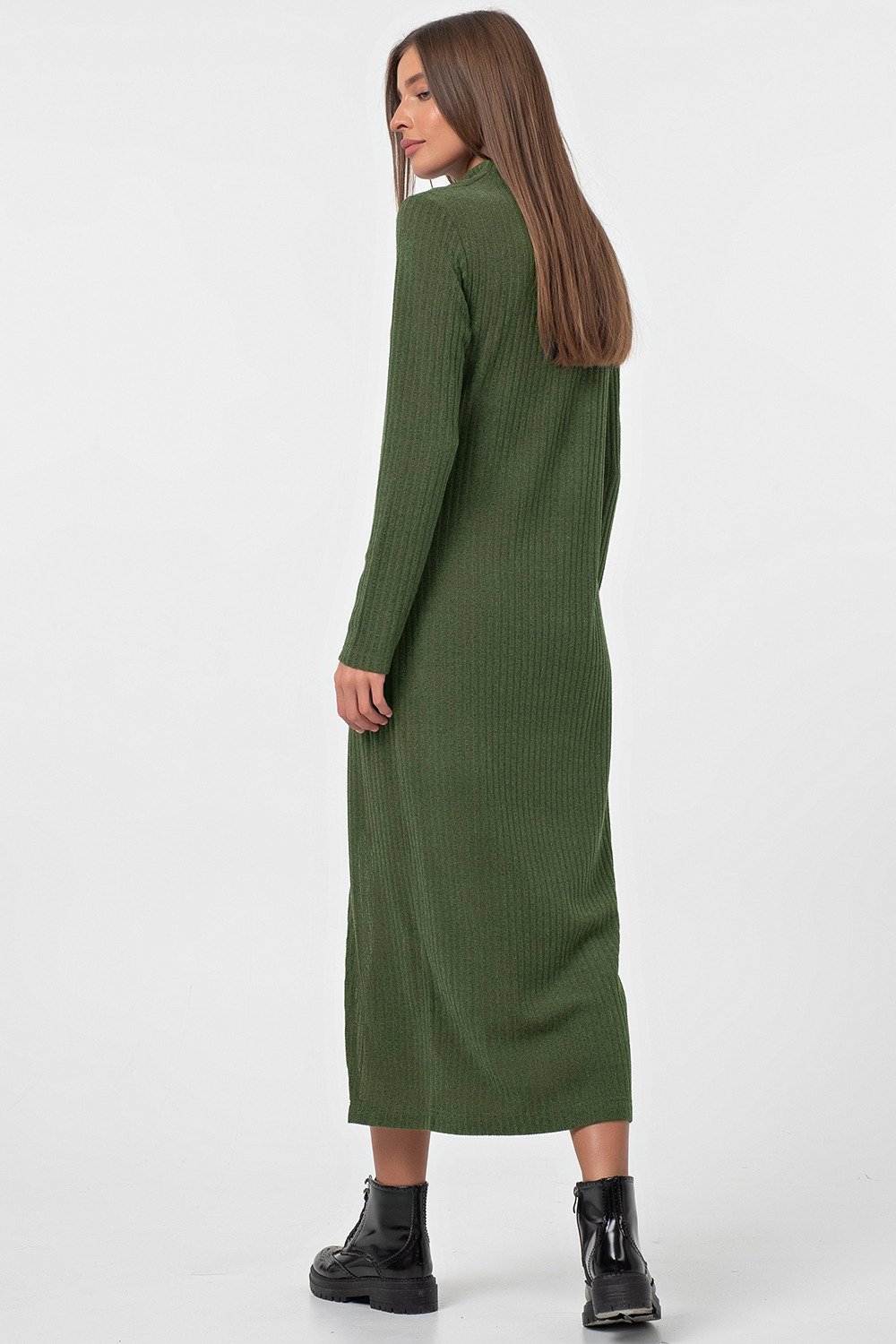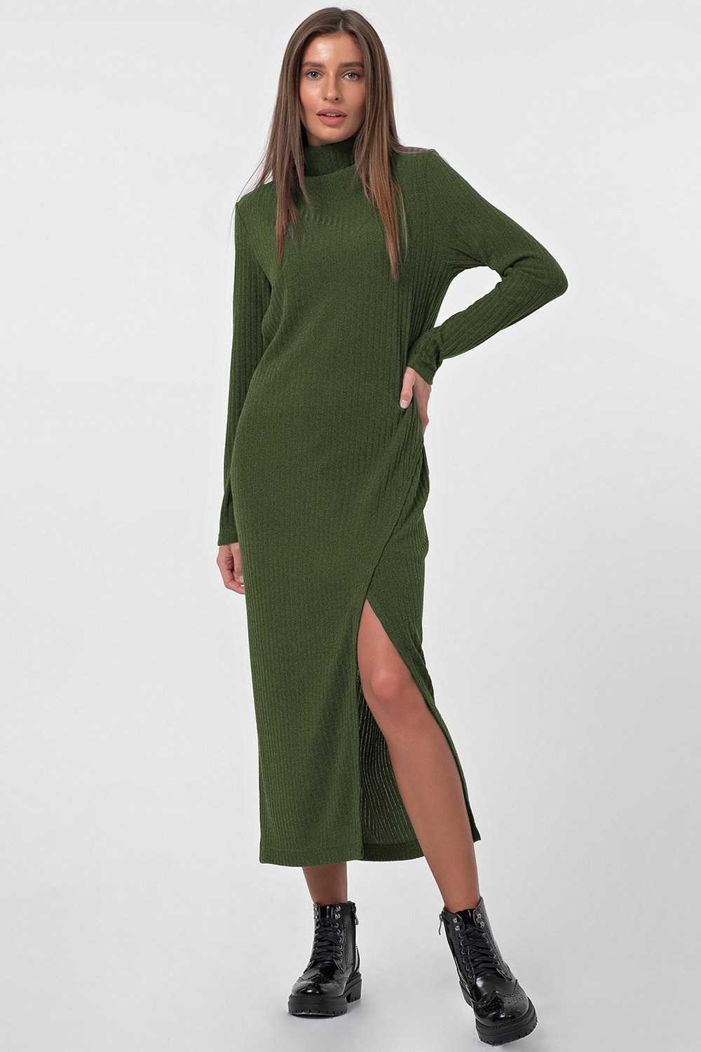 • Особенности: Платье прямого силуэта из трикотажа в рубчик. Детали: цельнокроенный воротник-стойка, длинный втачной рукав, запах по переду. Без застежки.