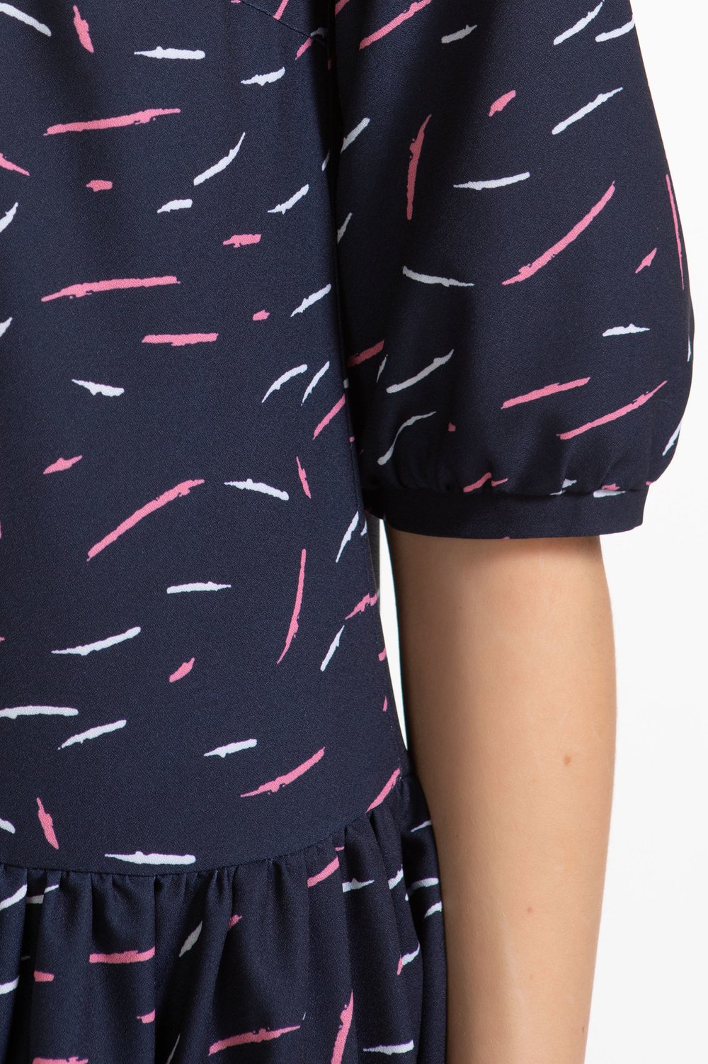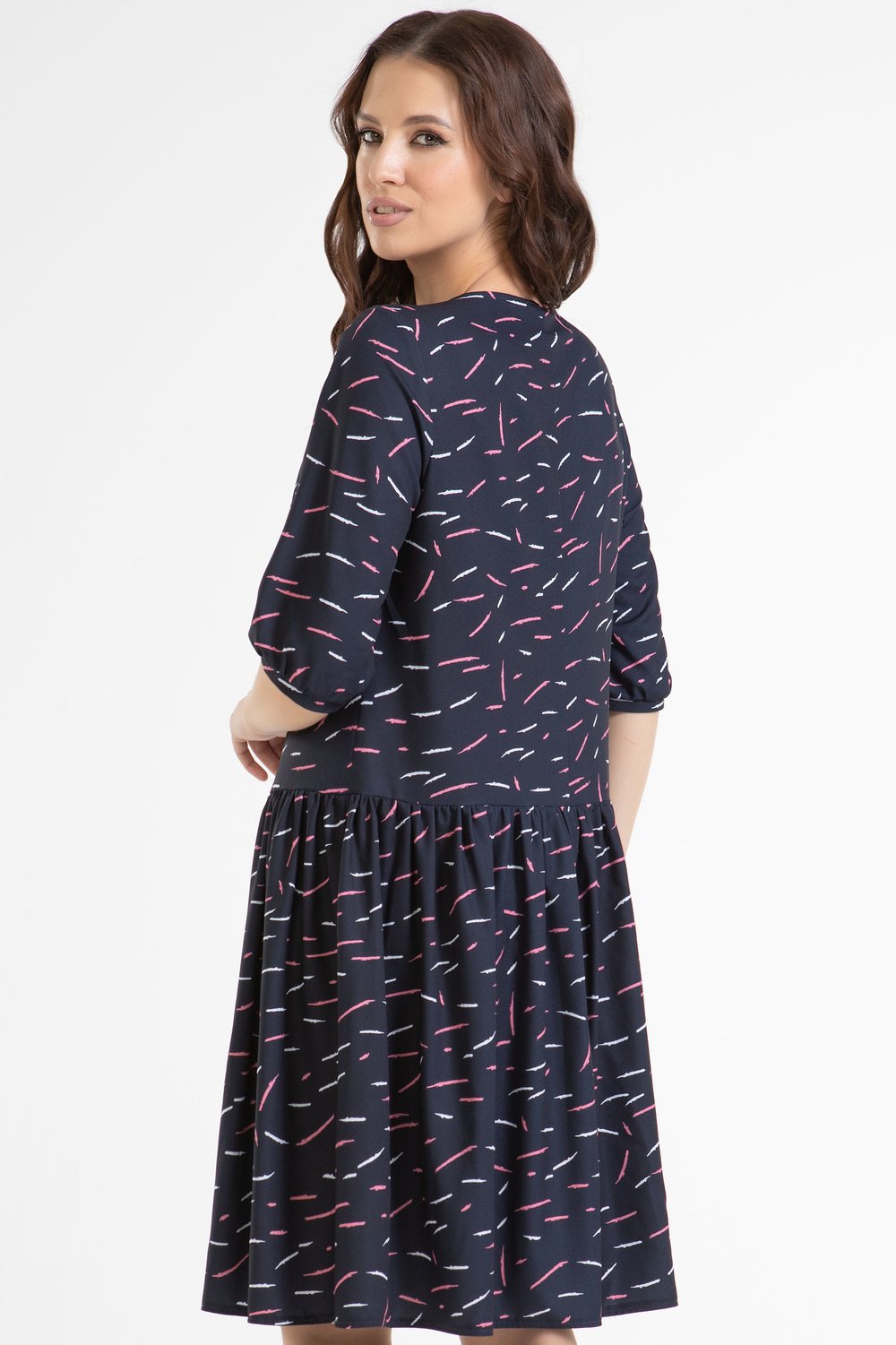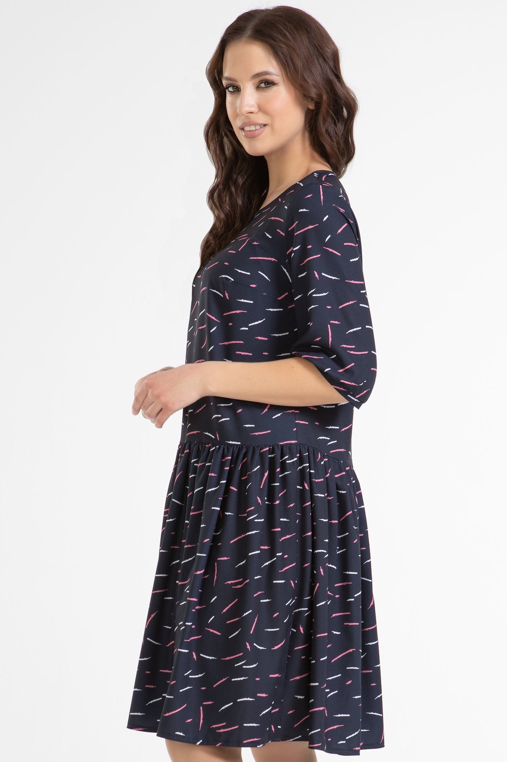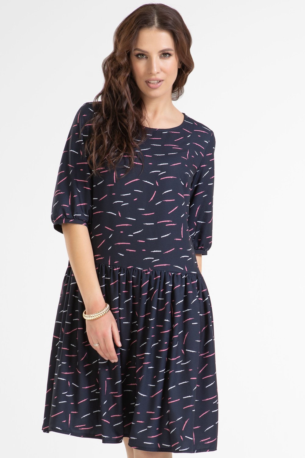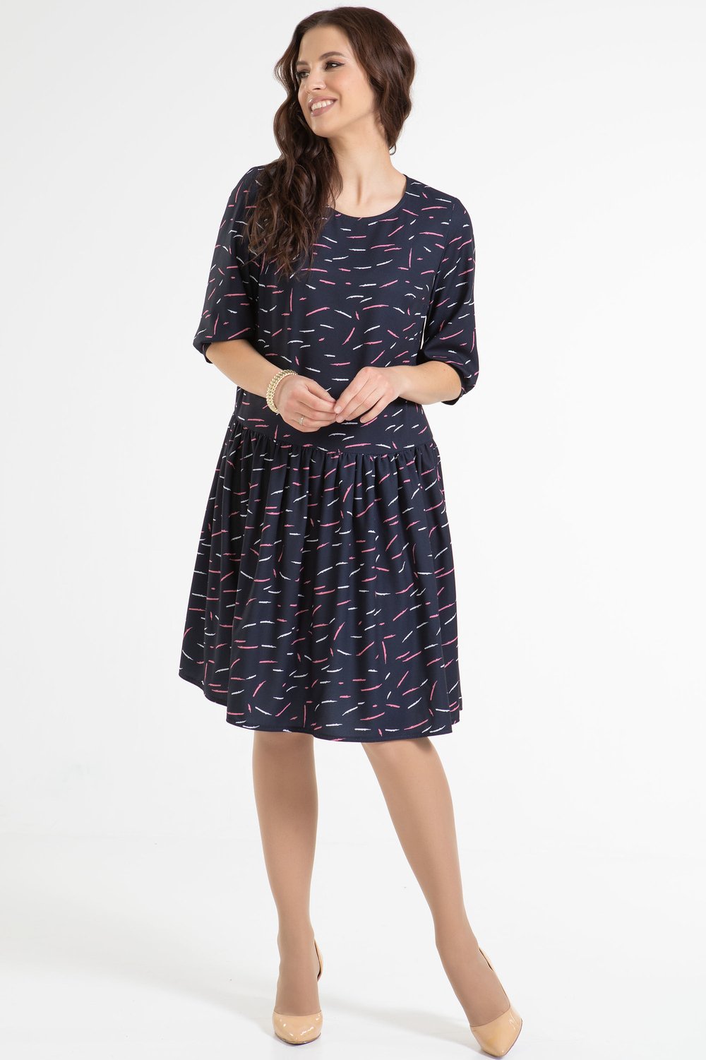 Платье можно отнести к категории нарядного офиса. Выполнено из непрозрачного плательного крепа. Заниженная линия талии. Юбка платья присборена. Круглая горловина. Втачной рукав. К платью легко подобрать аксессуар в виде броши, бус, цветка.Характеристики: