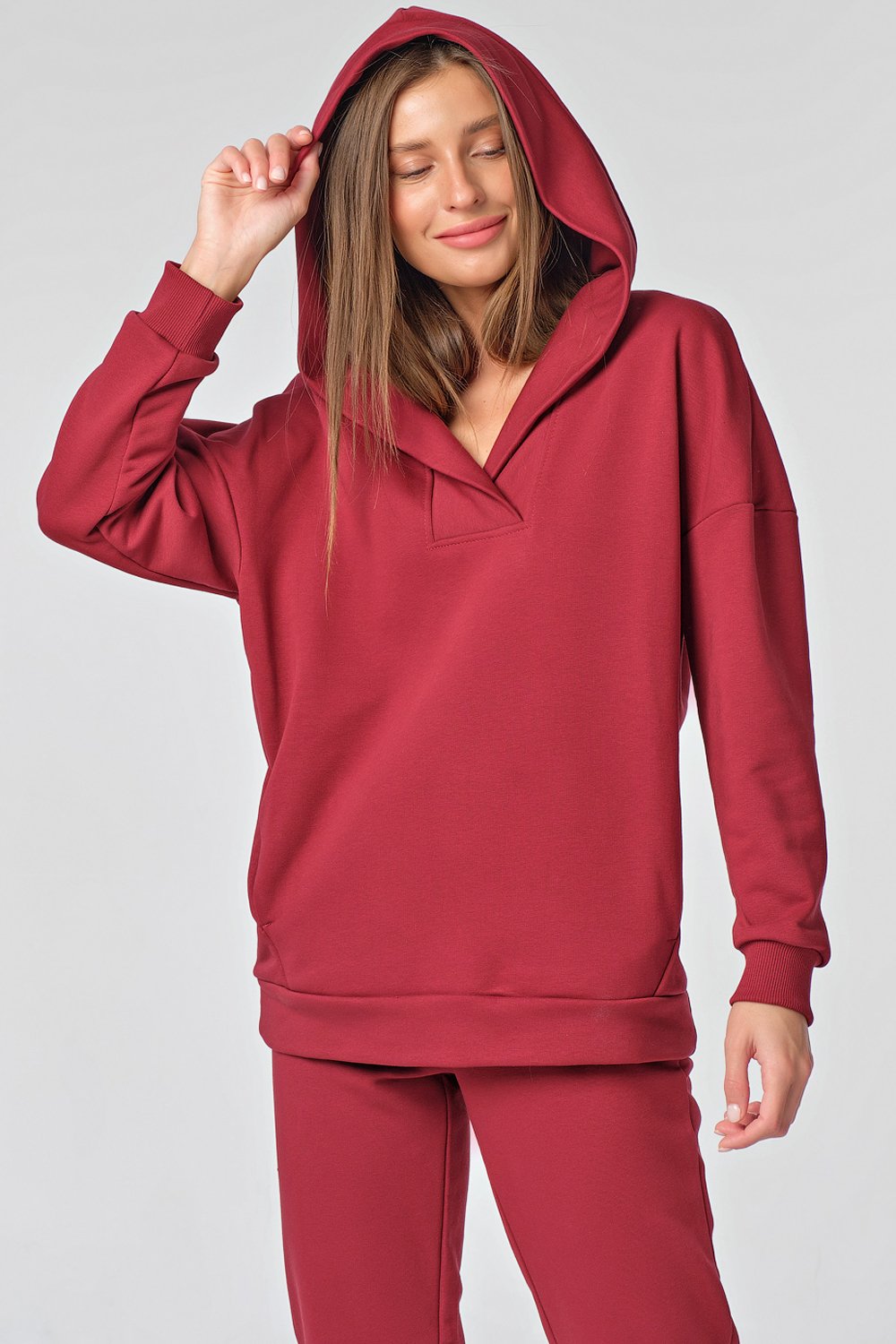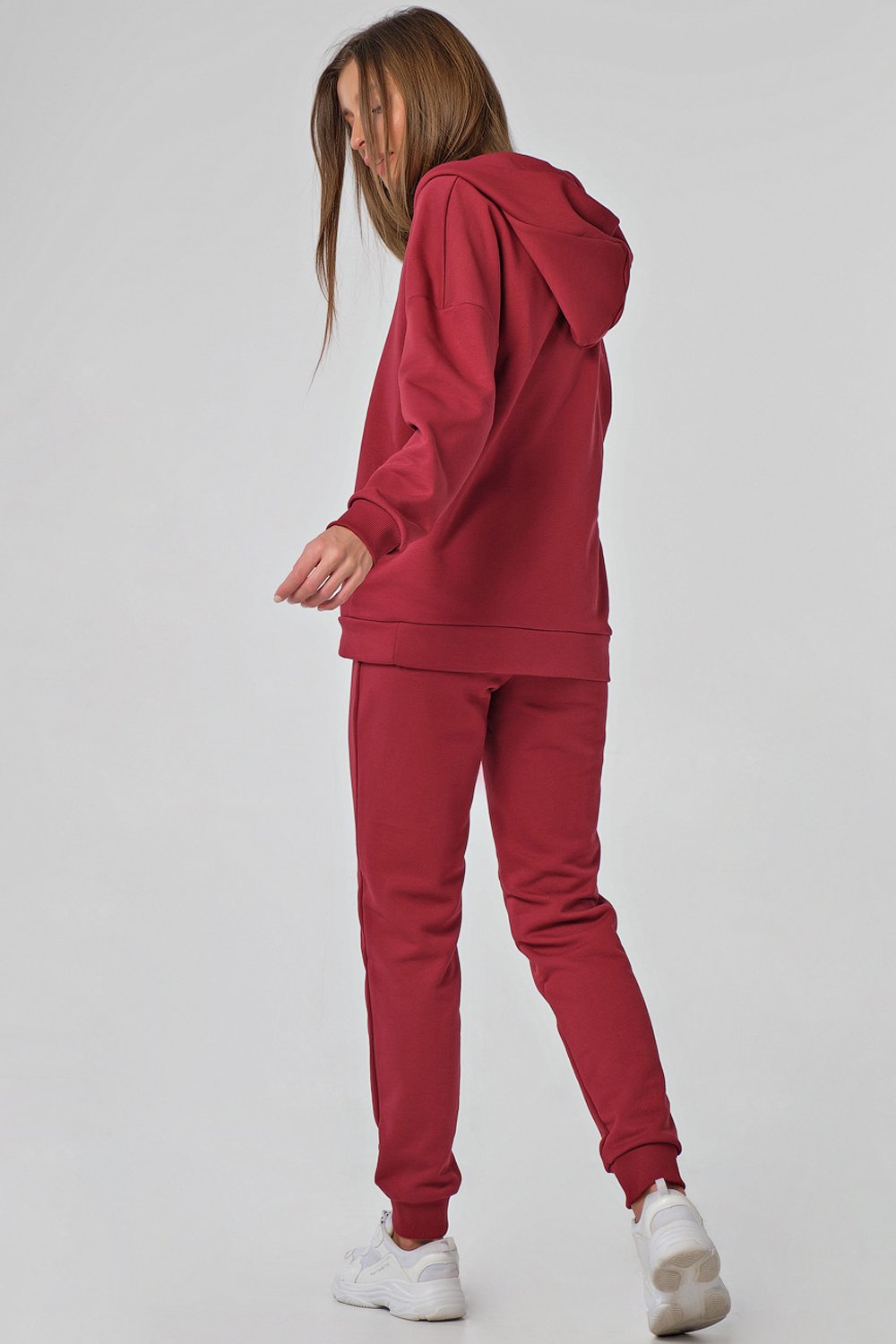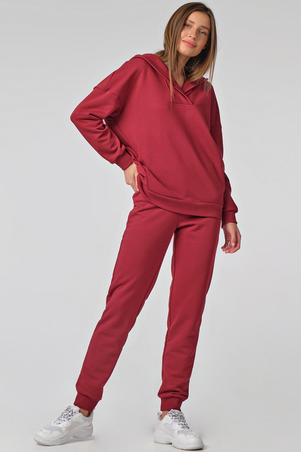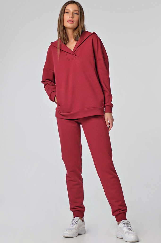 •Особенности: костюм из футера состоит из свитшота и брюк. Детали свитшота: свободный силуэт, капюшон, переходящий в планку переда, спущенная линия плеча, втачной рукав с притачной манжетой из кашкорсе, боковые швы со смещением на перед, карманы в боковых швах, притачной пояс по низу свитшота. Детали брюк: притачной пояс с резиной, манжеты из кашкорсе по низу брючин, без карманов.