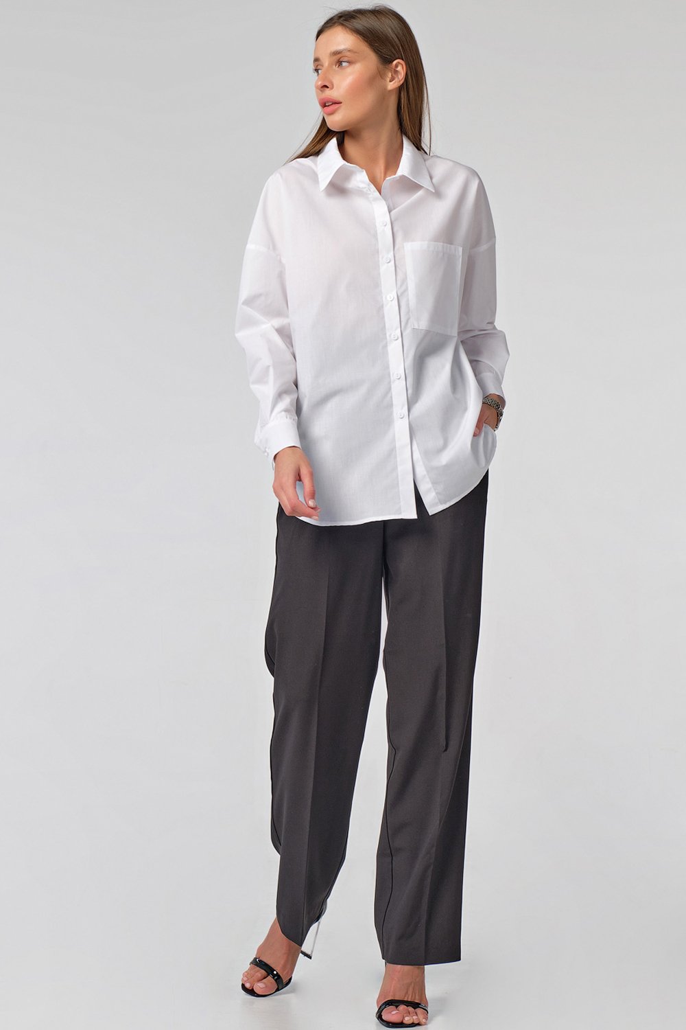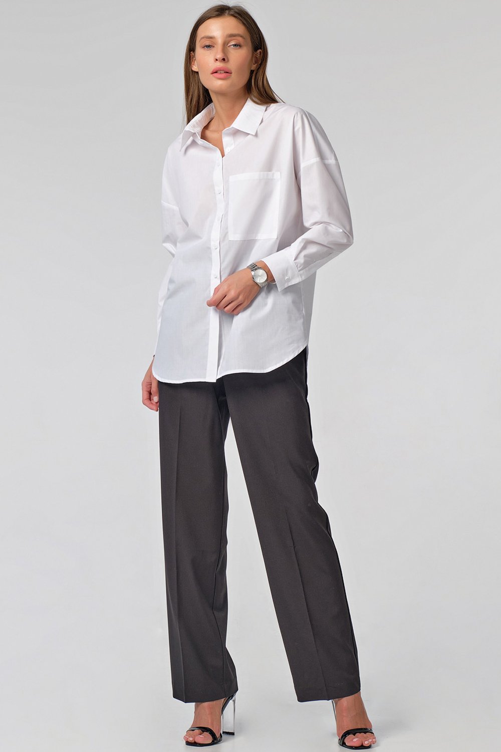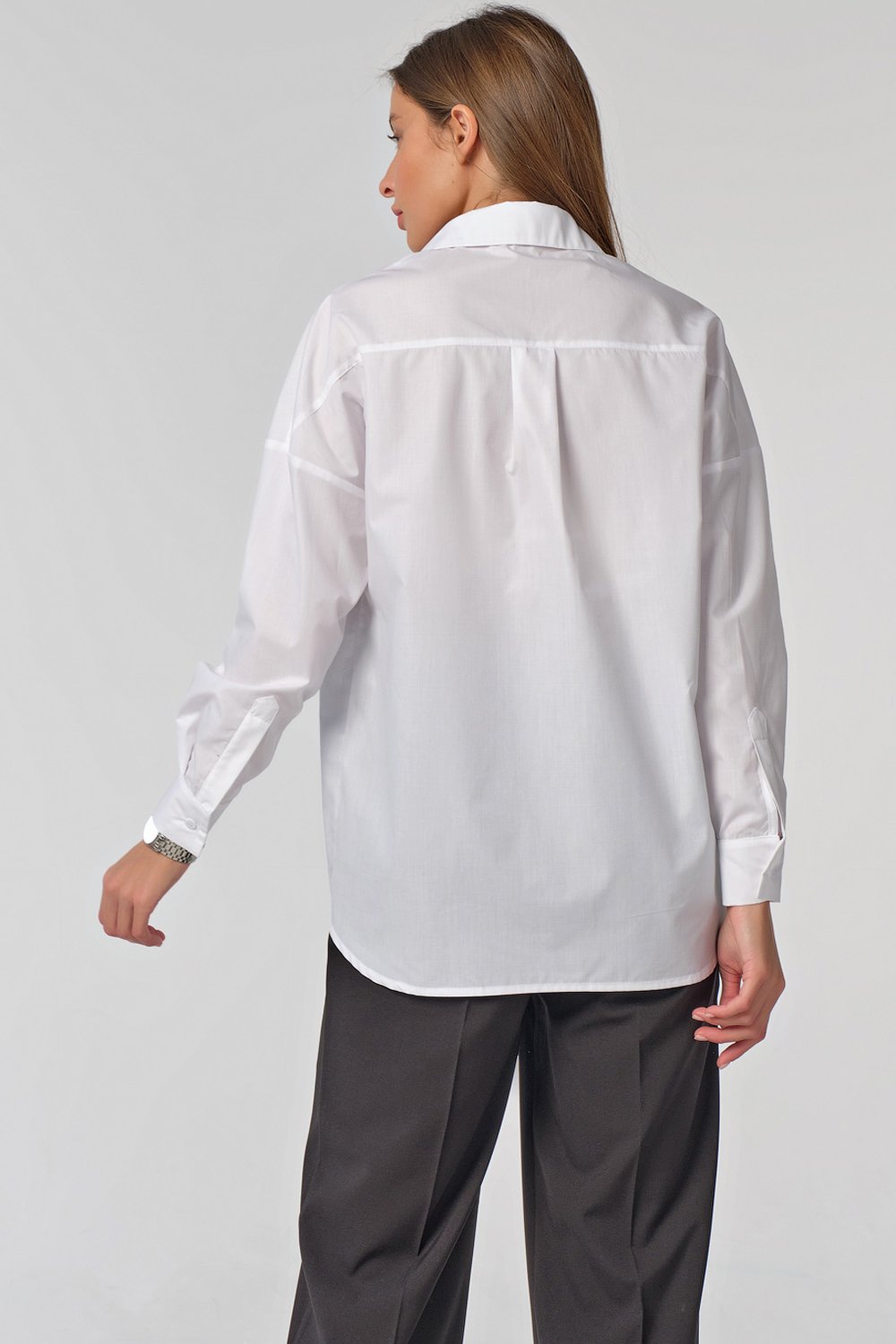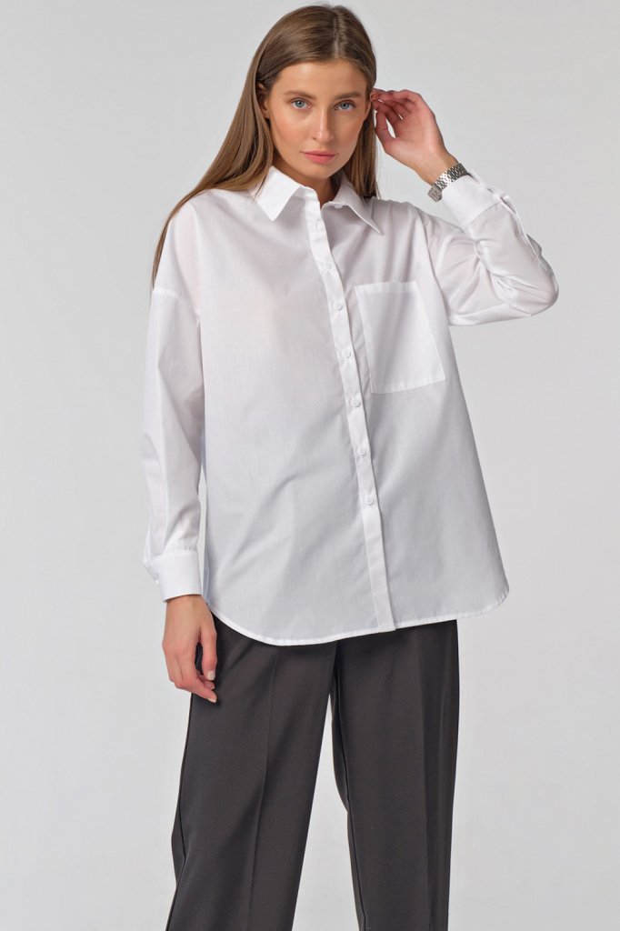 •Особенности: Рубашка прямого силуэта из блузочной ткани. Детали: отложной воротник на стойке, накладные карманы с клапанами по переду, клапаны застегиваются на петлю-пуговицу, широкие рукава. Застежка на петли-пуговицы по переду.
