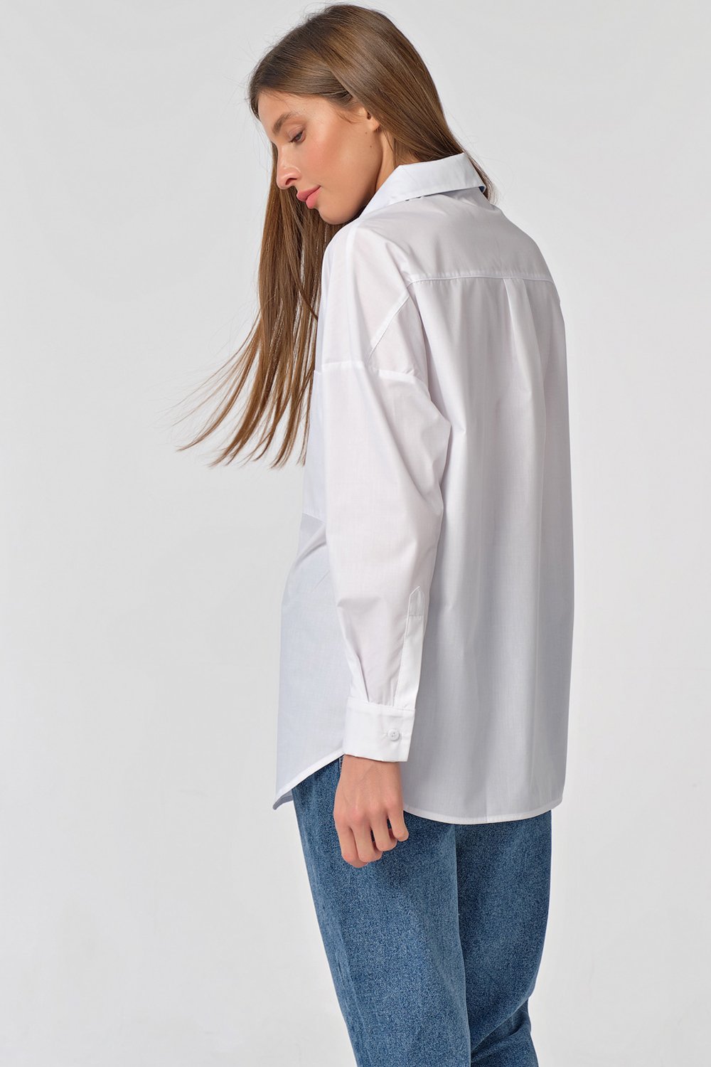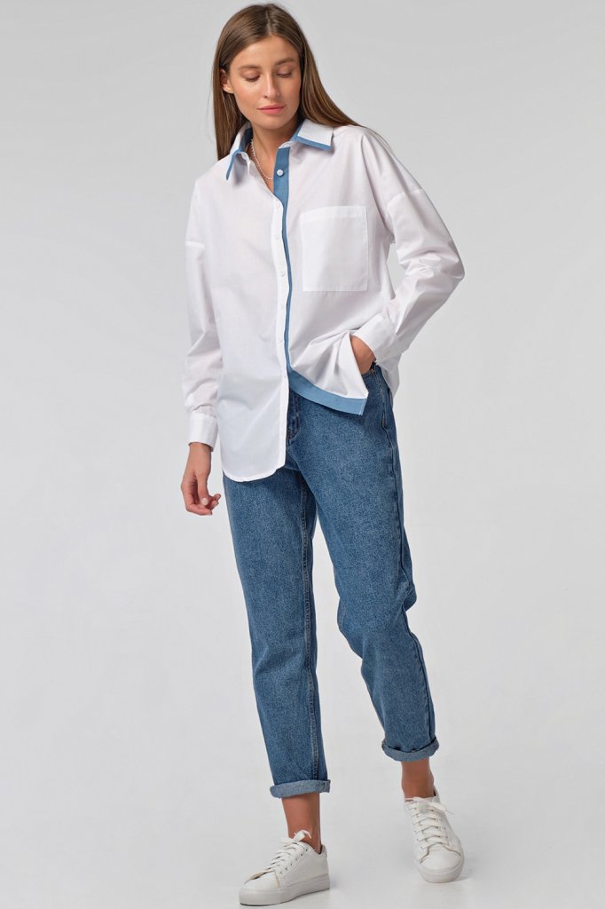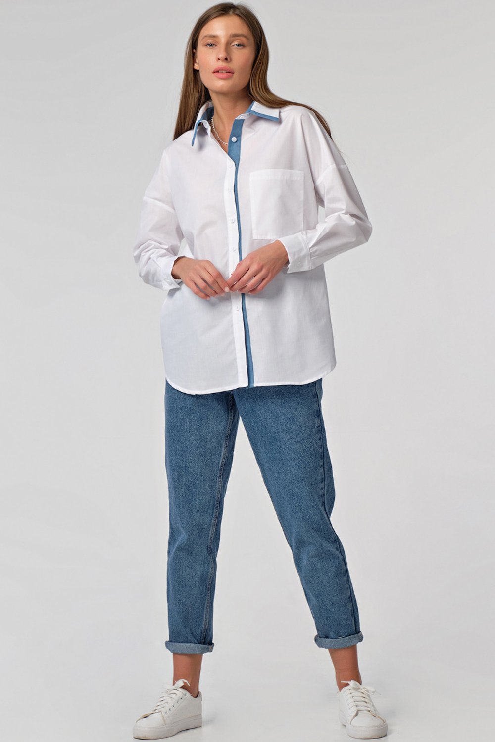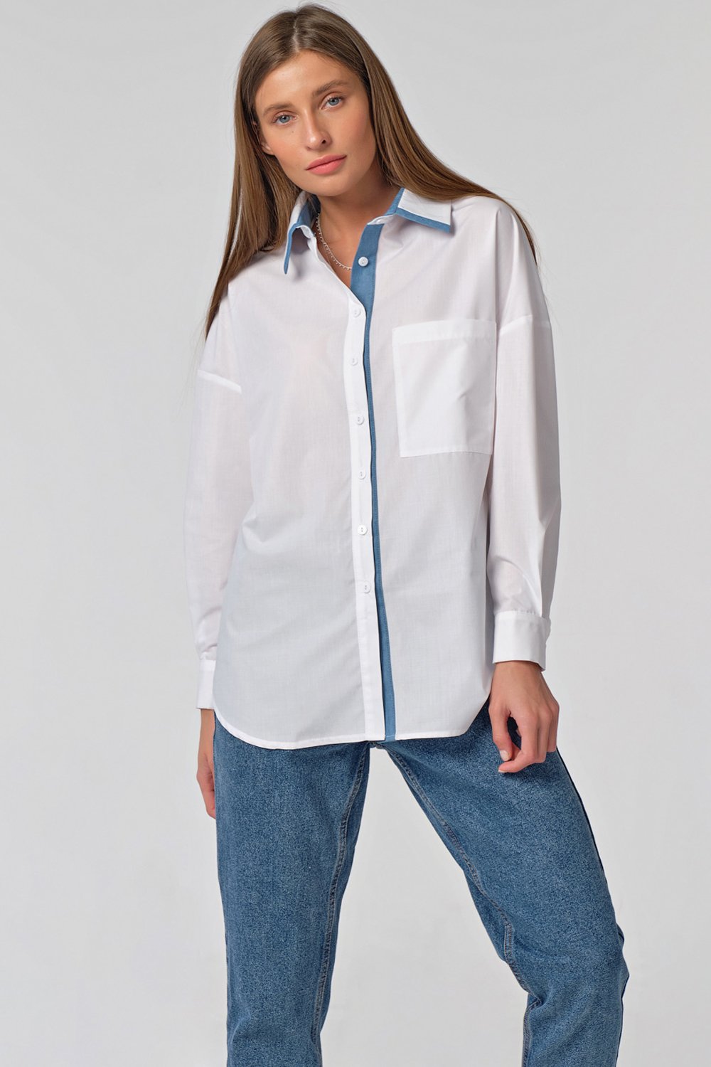 •Особенности: рубашка прямого силуэта из сорочечной ткани. Детали: спущенная линия плеча, втачной рукав с манжетой, отложной воротник со стойкой, накладной карман на переде, кокетка по спинке, фигурная линия низа. Застежка на петли-пуговицы на планке.