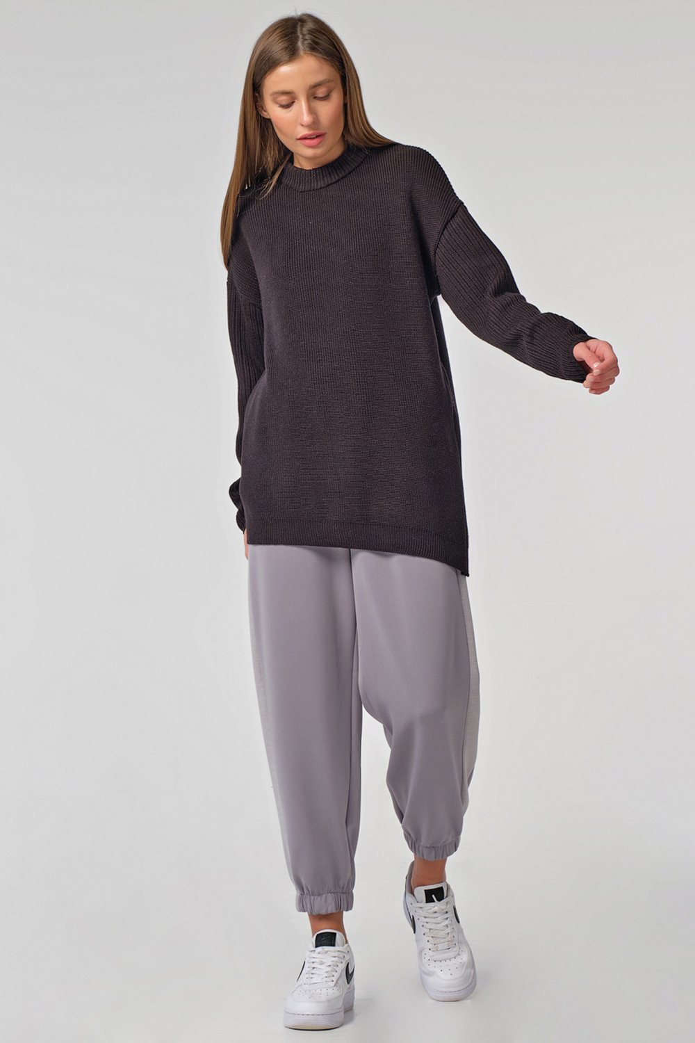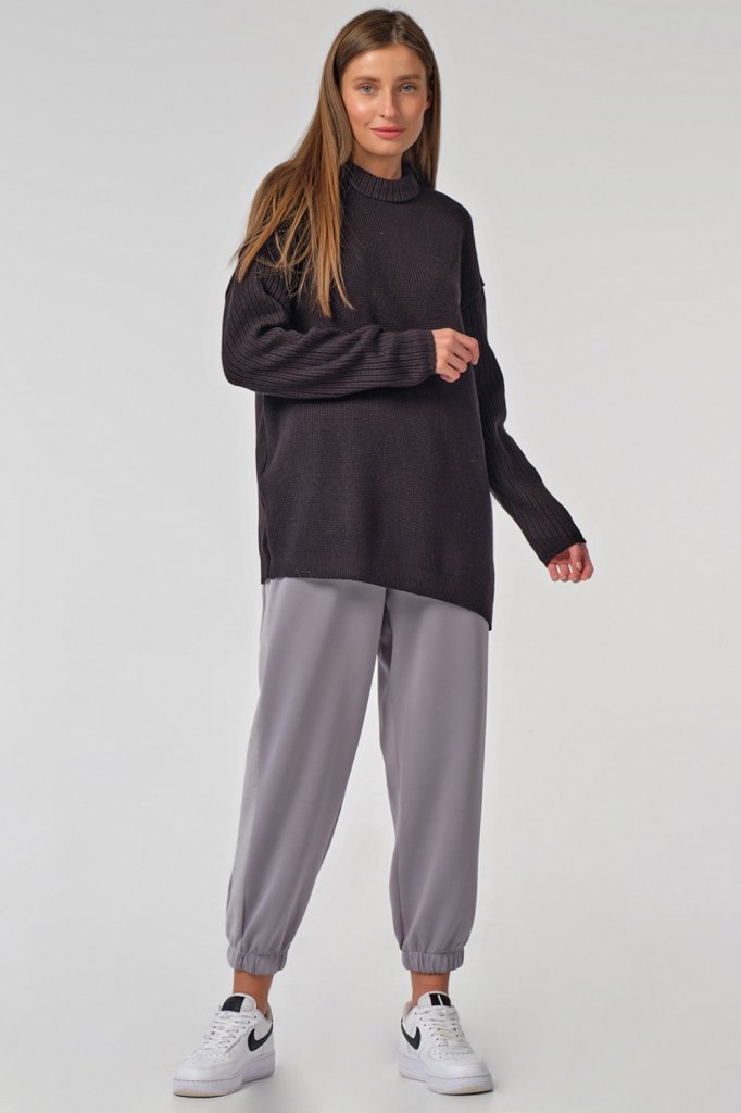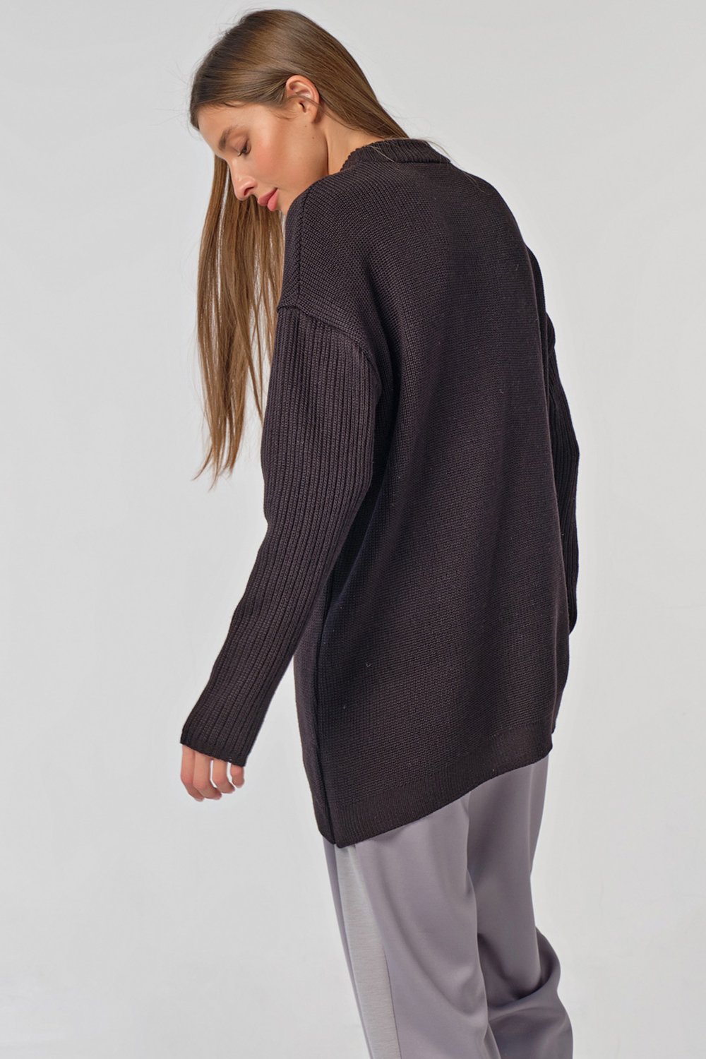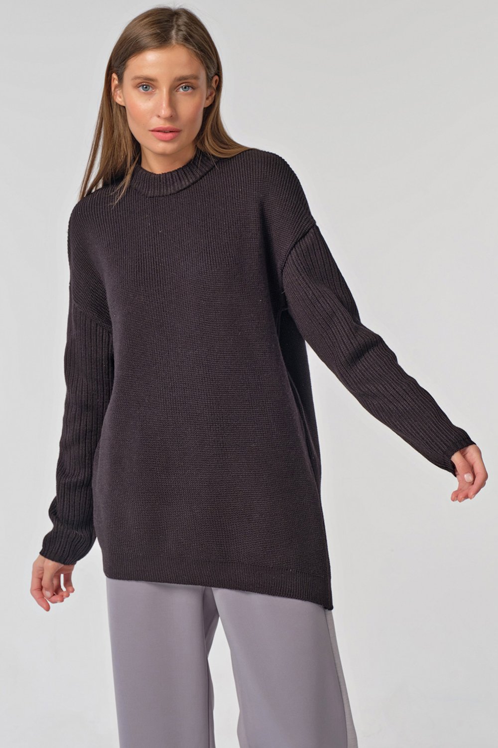 •Длина изделия: асимметричная 70-82 см. Особенности: Вязаный джемпер "oversize" силуэта с асимметричным низом. Двойной воротник стойка, рукава и цельновязаные манжеты выполнены в рубчик.