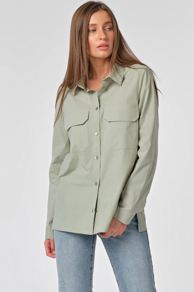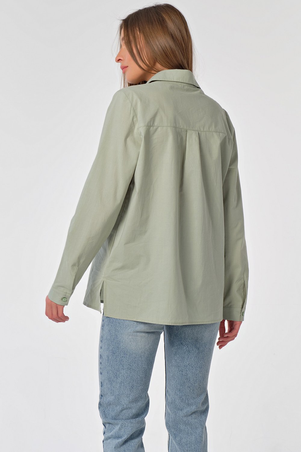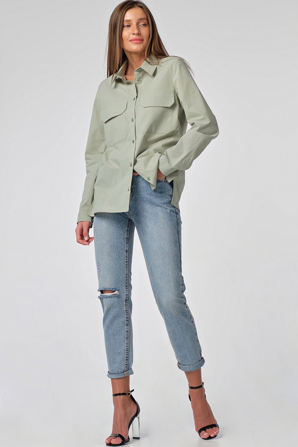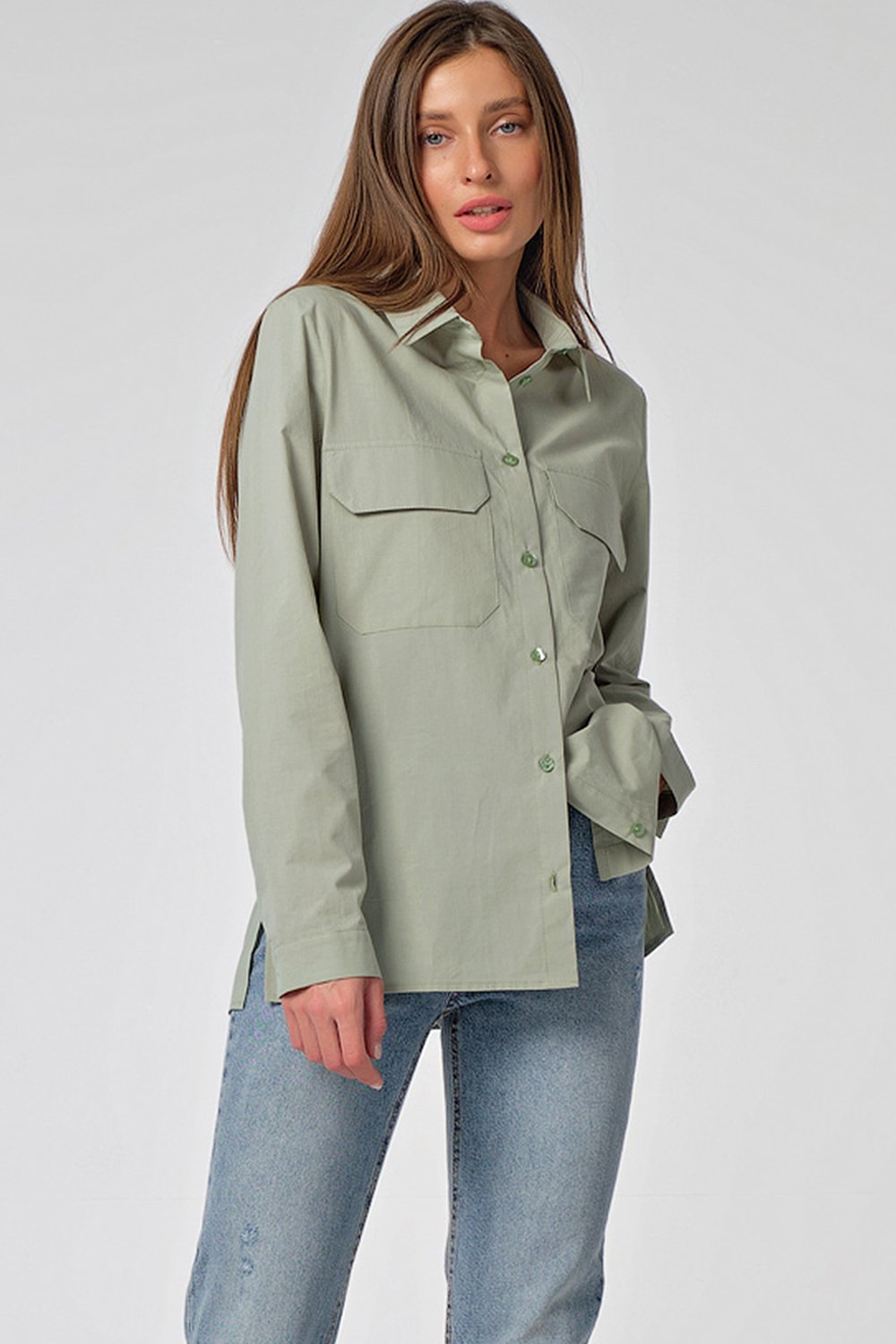 •Особенности: рубашка прямого силуэта из сорочечной ткани. Детали: классический втачной рукав с притачной манжетой с пуговицей, отложной воротник со стойкой, фигурные накладные карманы с клапанами по переду, кокетка по спинке, разрезы в боковых швах. Застежка на петли-пуговицы по переду.