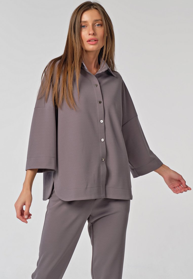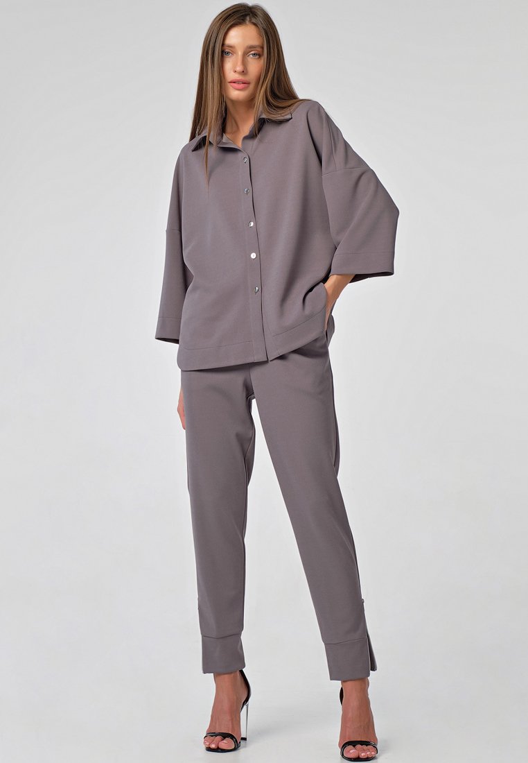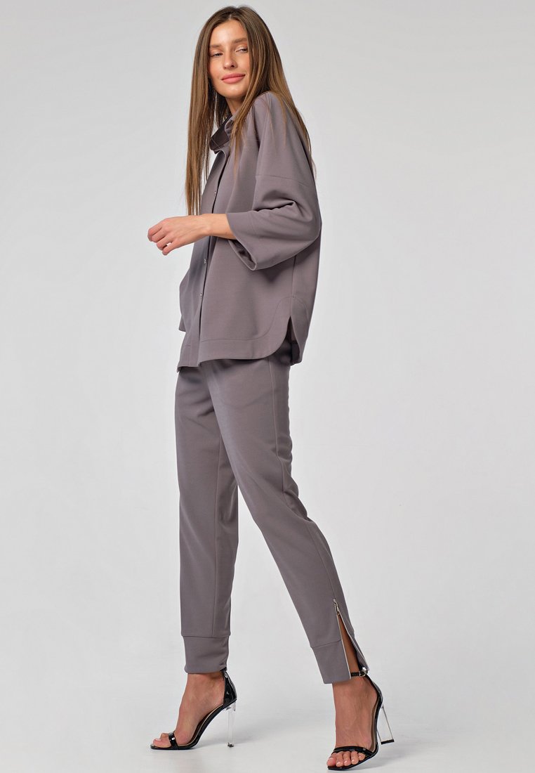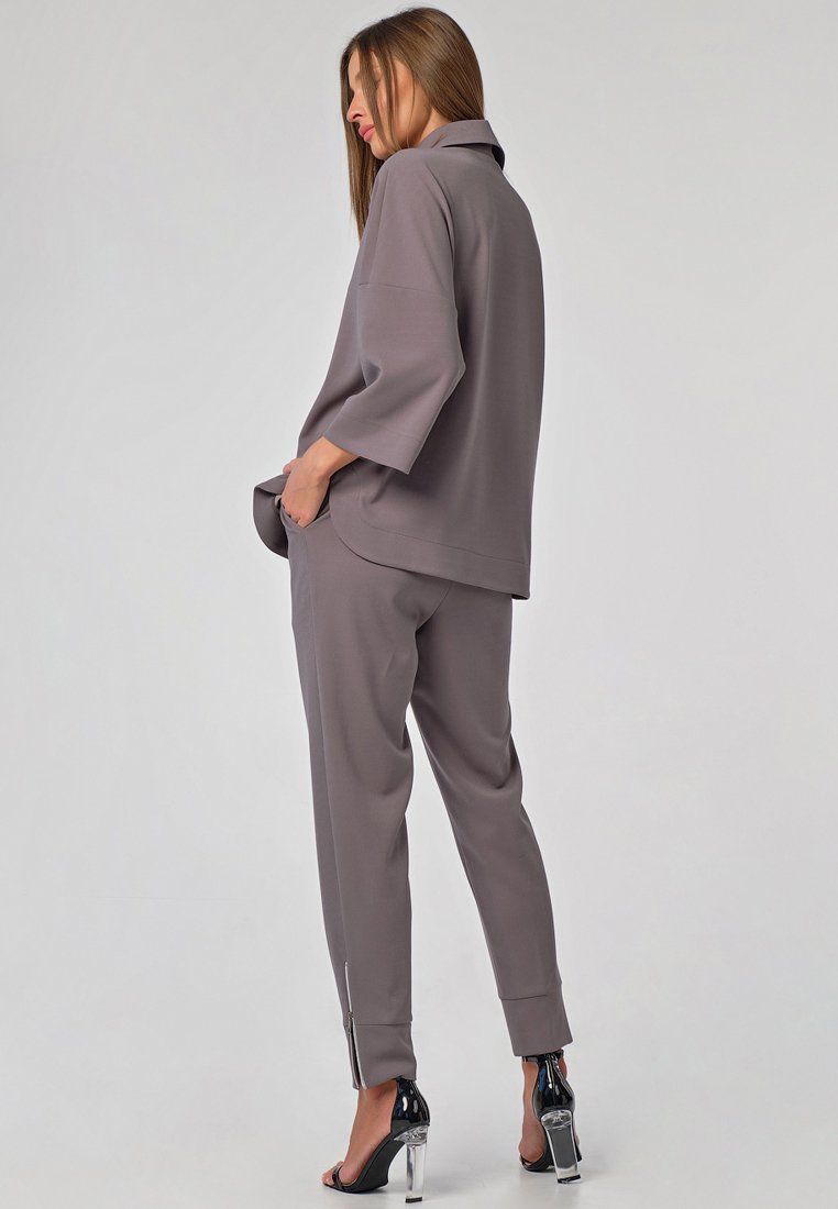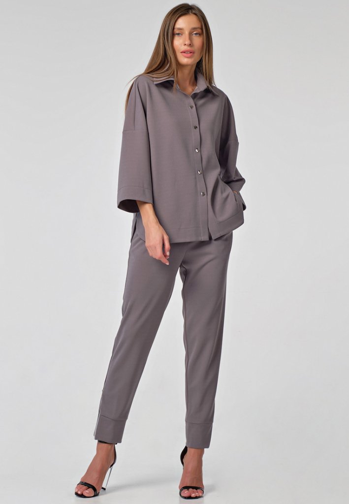 •Особенности: костюм ( рубашка и брюки) из плотного трикотажа. Детали блузы: отложной воротник на стойке, спущенная линия плеча, втачной широкий рукав с широкой подгибкой, фигурная линия низа с широкой отстрочкой, застежка на кнопки по переду. Детали брюк: зауженные брюки с притачным поясом с застежкой на молнию и пуговицу, боковые карманы, широкие притачные манжеты по низу, декоративные застежки молнии в боковых швах по низу брюк.