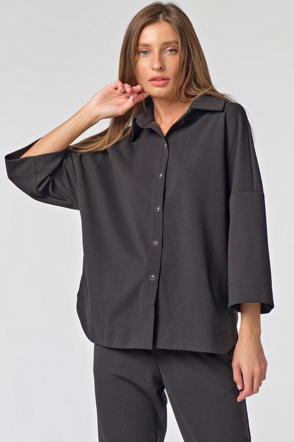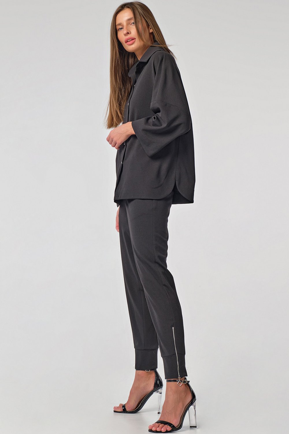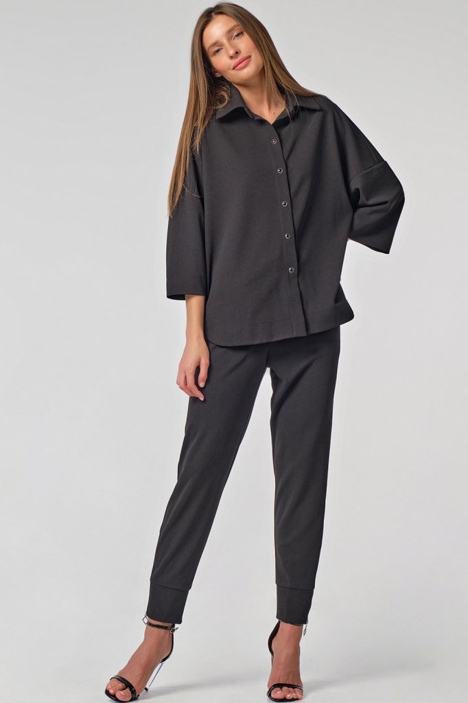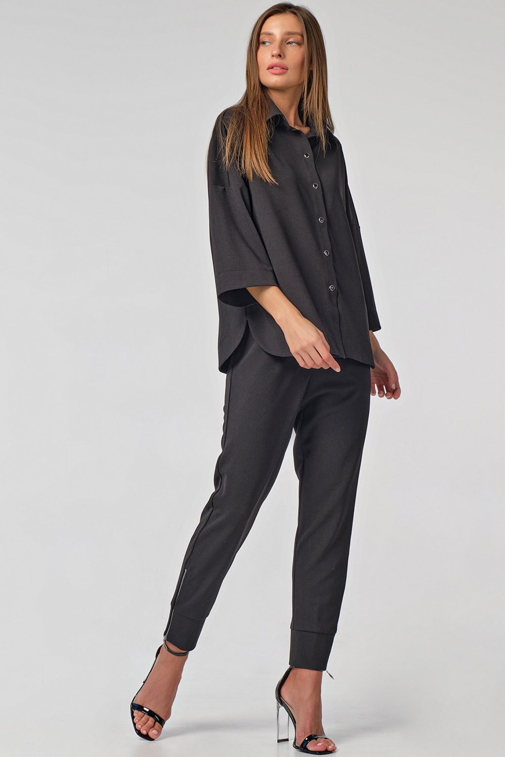 •Особенности: костюм ( рубашка и брюки) из плотного трикотажа. Детали блузы: отложной воротник на стойке, спущенная линия плеча, втачной широкий рукав с широкой подгибкой, фигурная линия низа с широкой отстрочкой, застежка на кнопки по переду. Детали брюк: зауженные брюки с притачным поясом с застежкой на молнию и пуговицу, боковые карманы, широкие притачные манжеты по низу, декоративные застежки молнии в боковых швах по низу брюк.