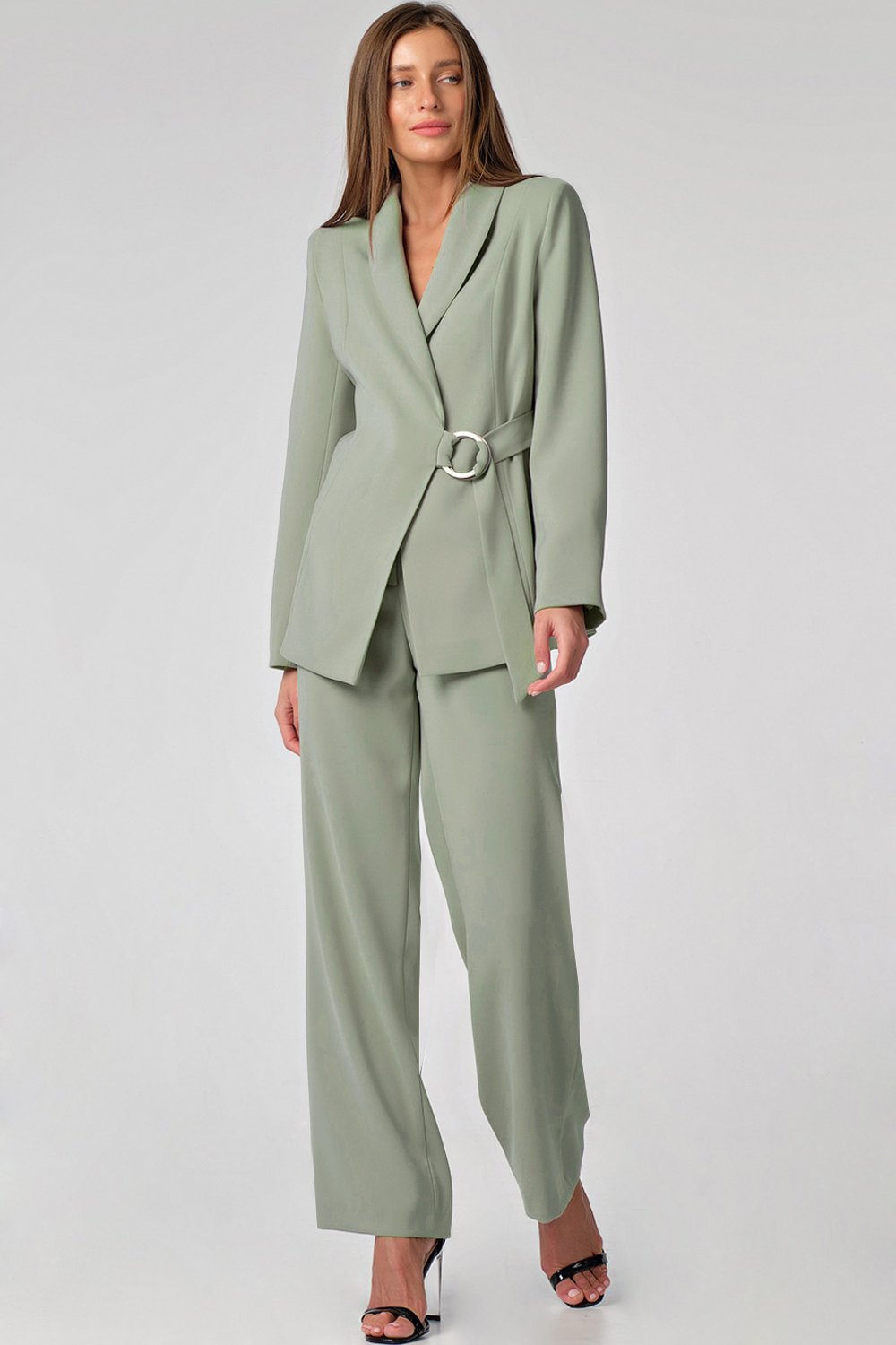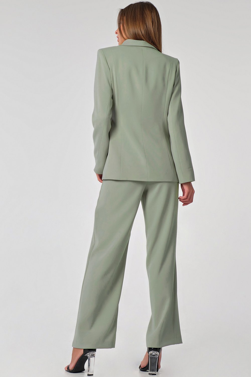 •Особенности: Костюм полуприлегающего силуэта из костюмной ткани на подкладке. Детали жакета: шалевый воротник, втачной рукав, плечевые накладки, вертикальные рельефы по переду и спинке, застежка на потайную пуговицу и на полупояс и кольцо. Детали брюк: прямые брюки с притачным поясом, без карманов, застежка на молнию и пуговицу.