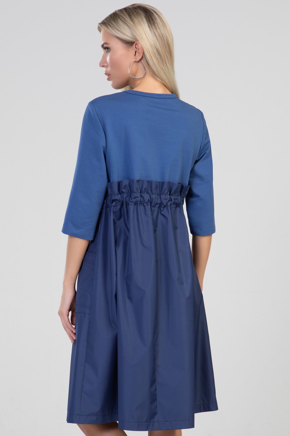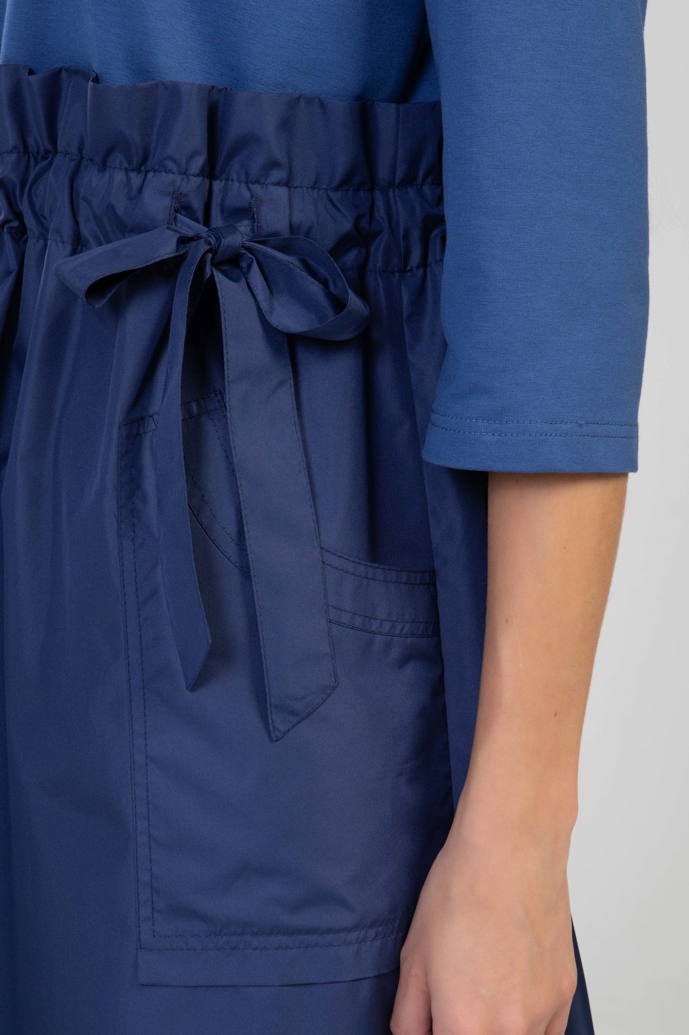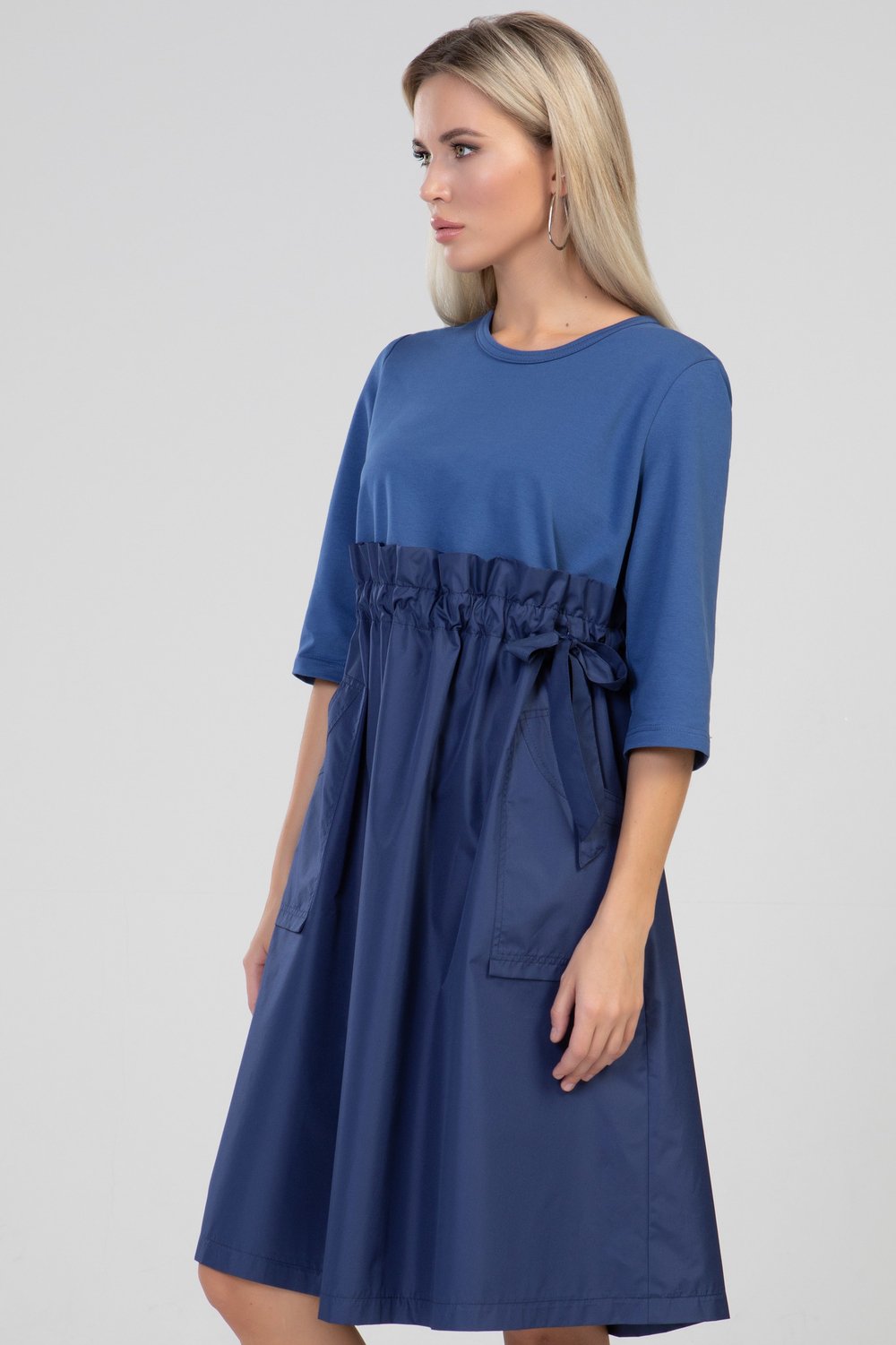 Платье А-образного силуэта, отрезное выше линии талии, с кулисой. В кулису продет пояс. Нижняя часть переда с накладными карманами. Горловина круглая, рукав втачной, 3/4. Платье выполнено из разного сырья : верхняя часть переда и спинки, рукава- из трикотажного полотна футера двухниточного, нижняя часть переда и спинки, пояс - из тонкой плащевой ткани. Цвет индиго.Характеристики:
