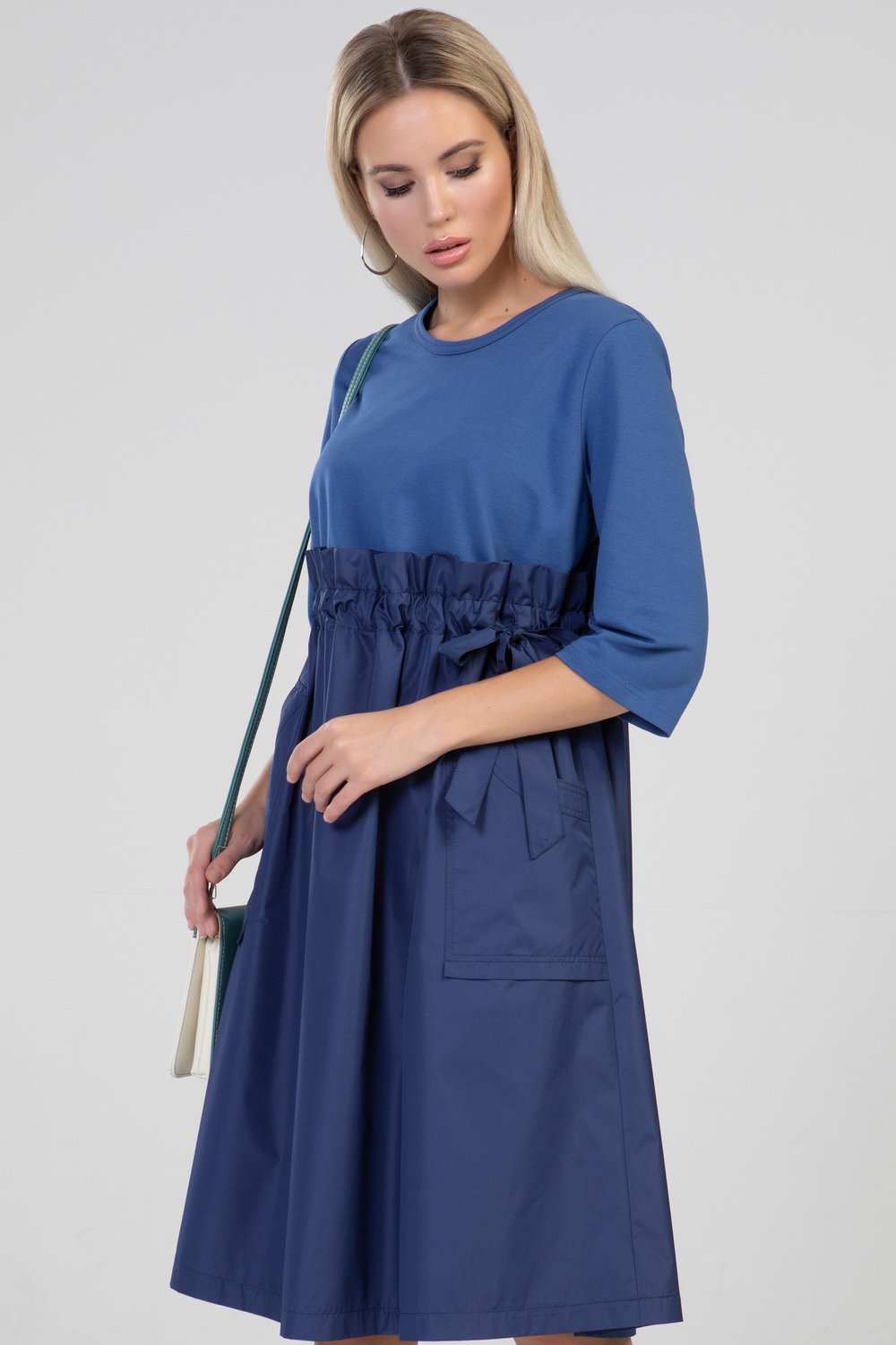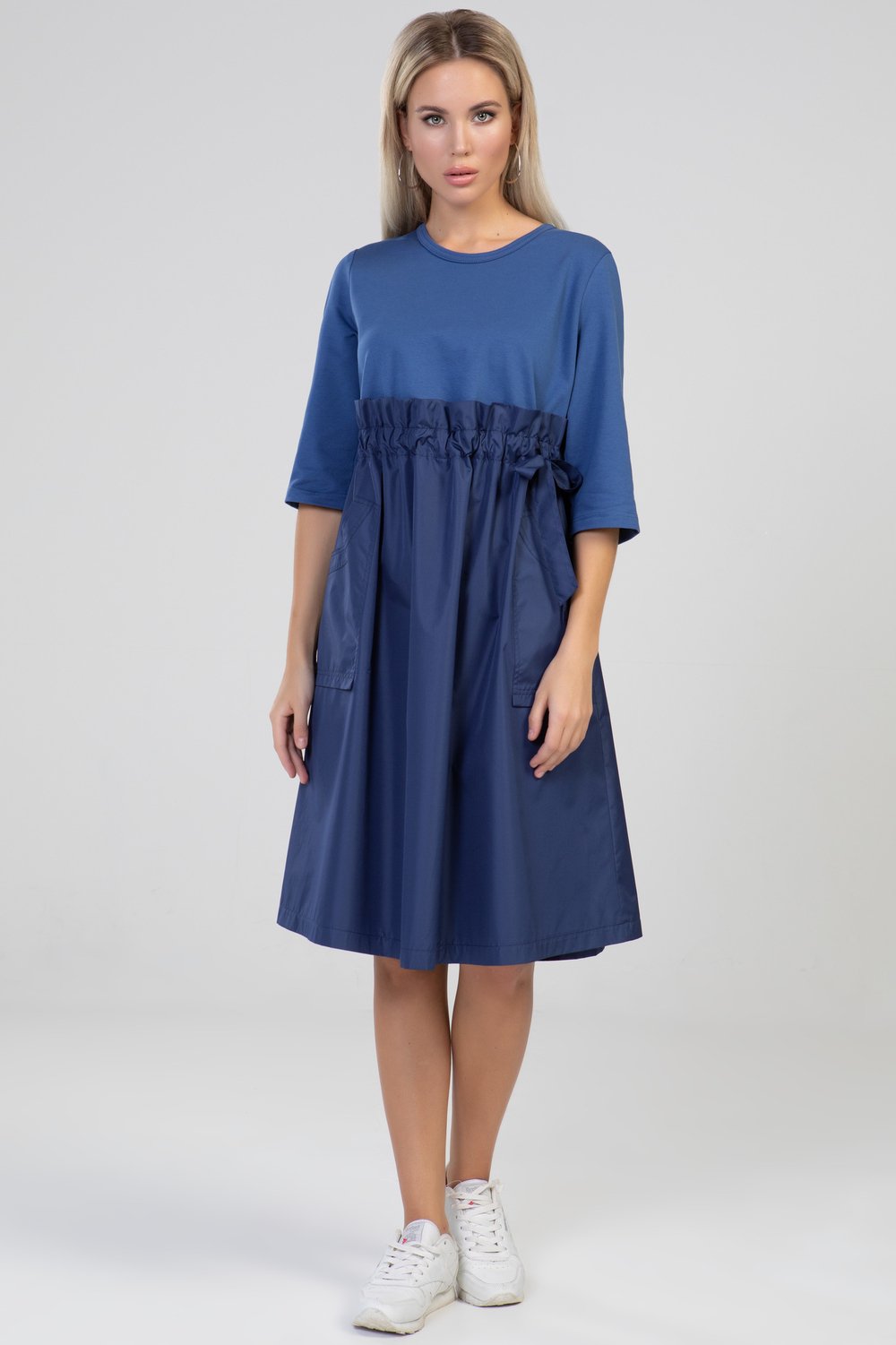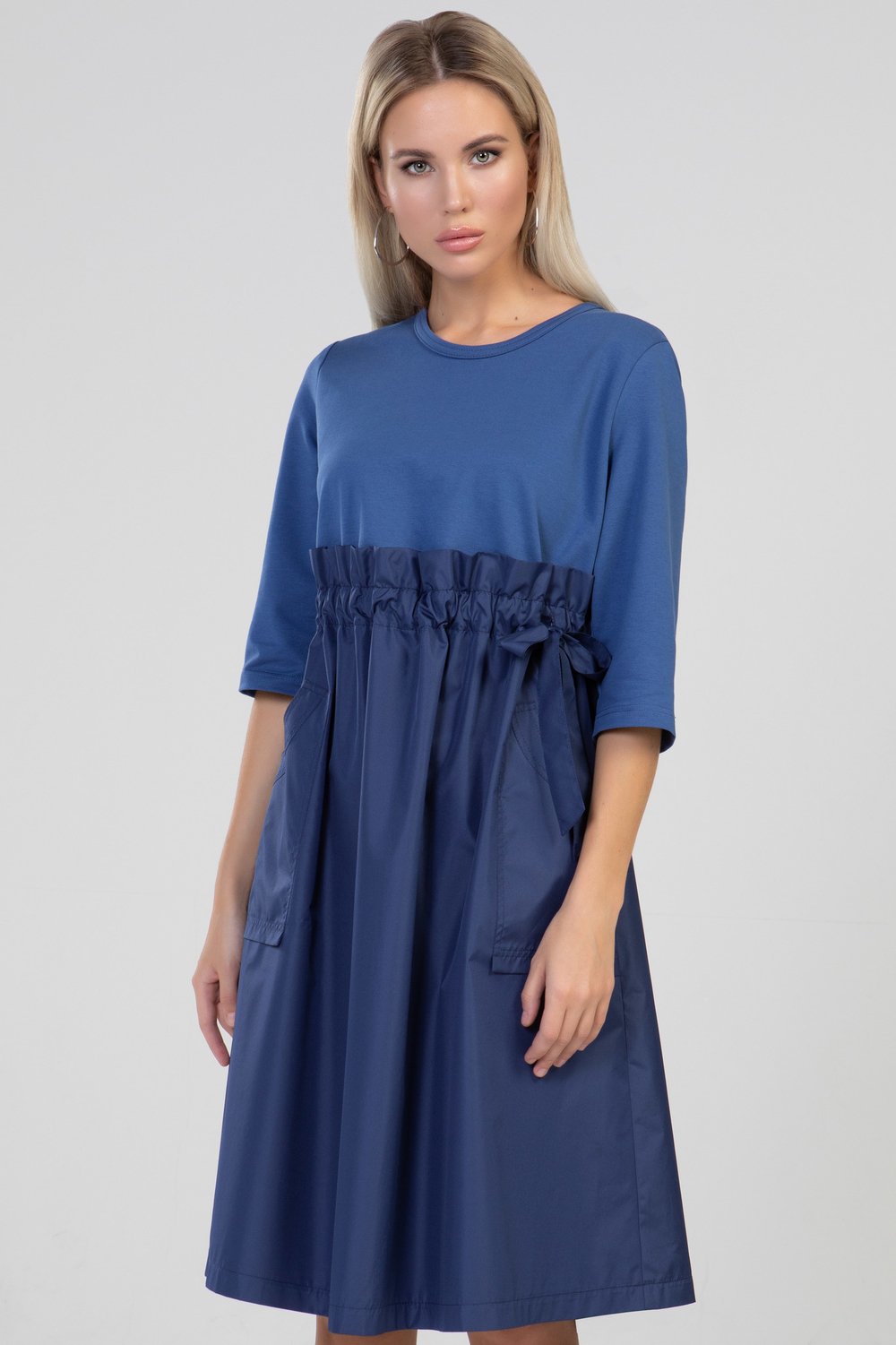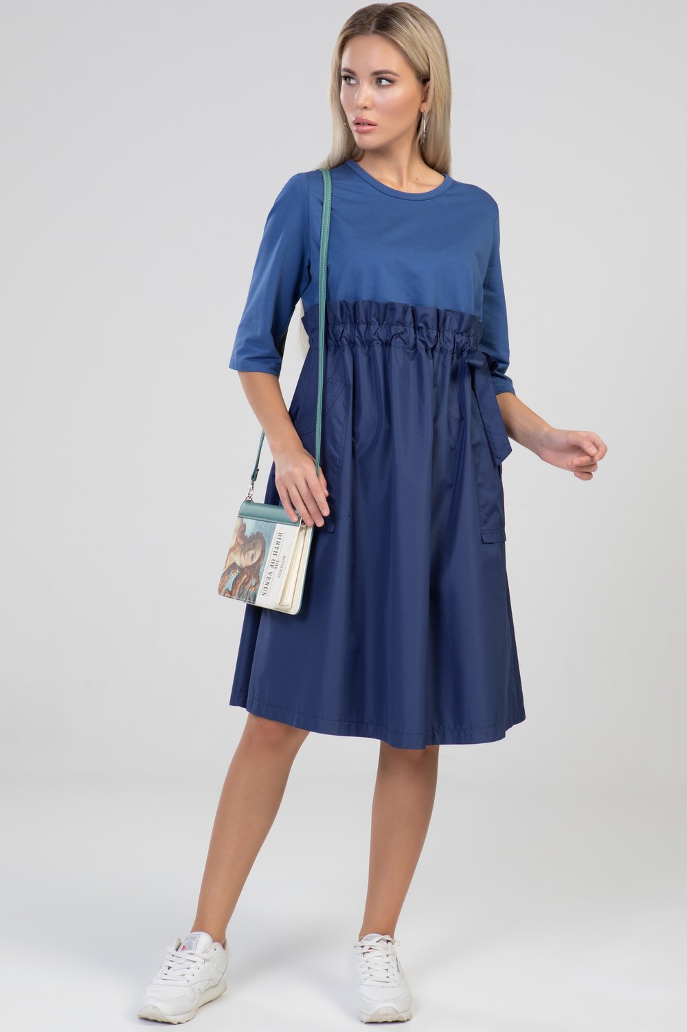 Платье А-образного силуэта, отрезное выше линии талии, с кулисой. В кулису продет пояс. Нижняя часть переда с накладными карманами. Горловина круглая, рукав втачной, 3/4. Платье выполнено из разного сырья : верхняя часть переда и спинки, рукава- из трикотажного полотна футера двухниточного, нижняя часть переда и спинки, пояс - из тонкой плащевой ткани. Цвет индиго.Характеристики: