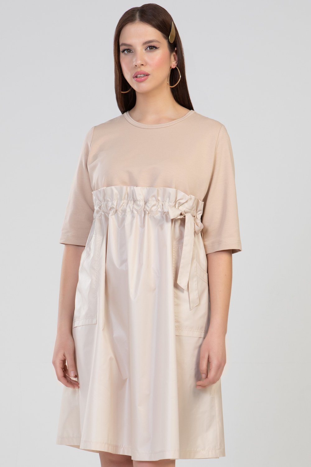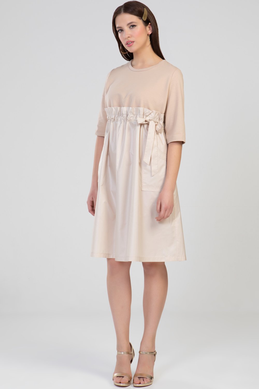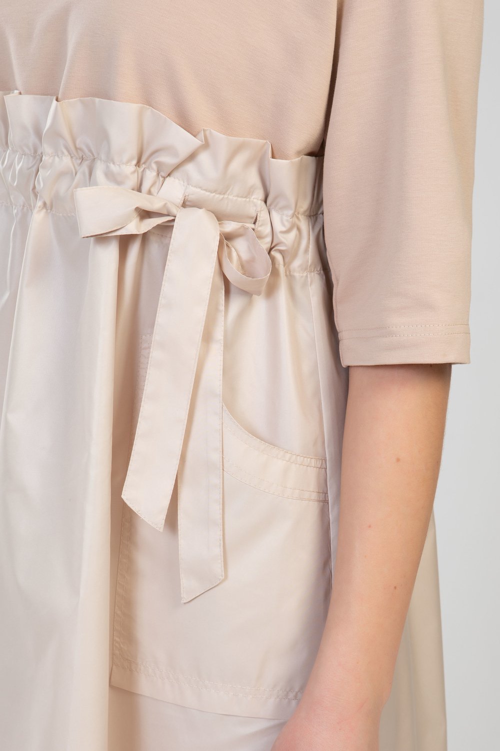 Платье А-образного силуэта, отрезное выше линии талии, с кулисой. В кулису продет пояс. Нижняя часть переда с накладными карманами. Горловина круглая, рукав втачной, 3/4. Платье выполнено из разного сырья : верхняя часть переда и спинки, рукава- из трикотажного полотна футера двухниточного, нижняя часть переда и спинки, пояс - из тонкой плащевой ткани. Цвет бежевый.Характеристики: