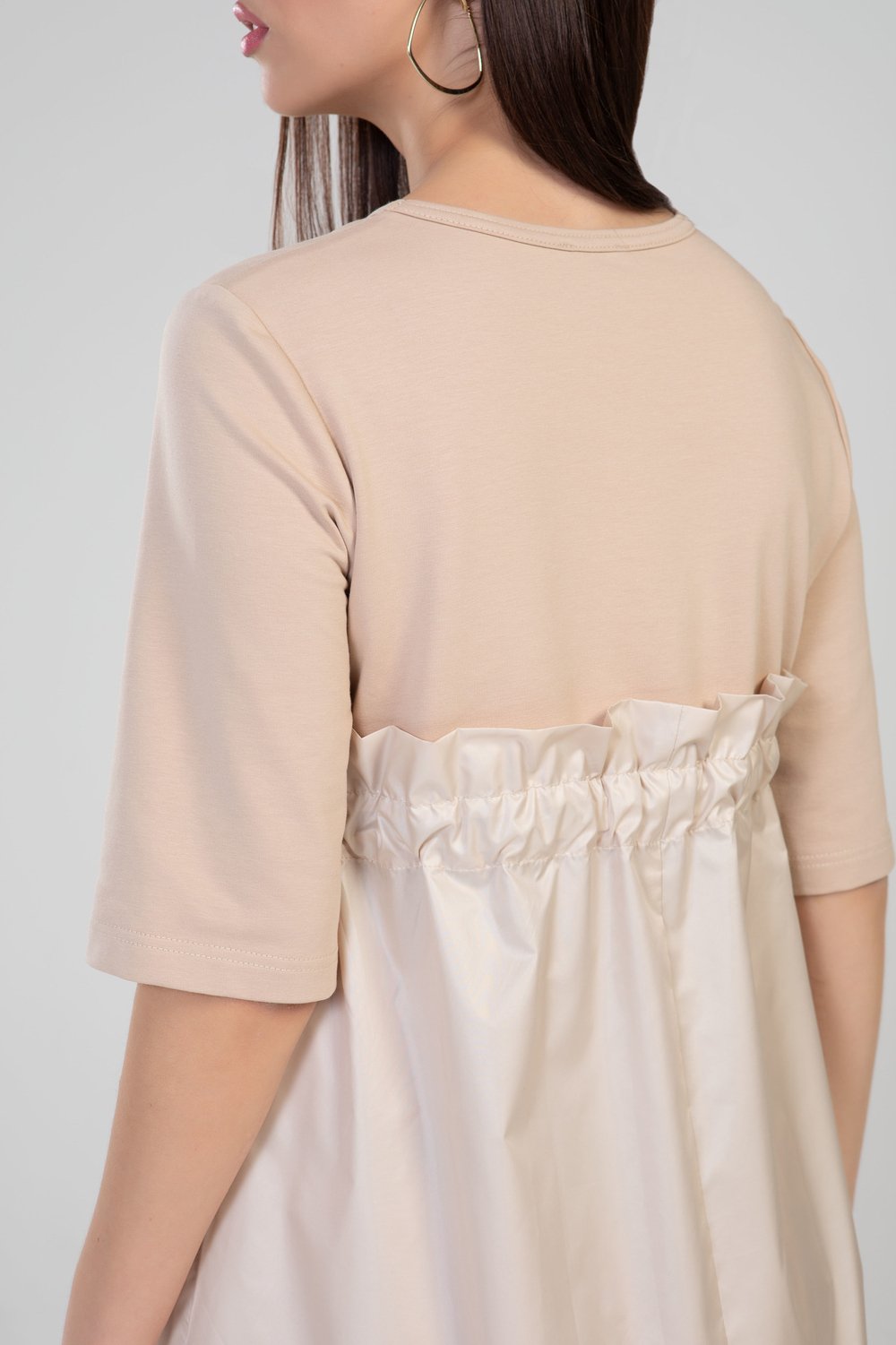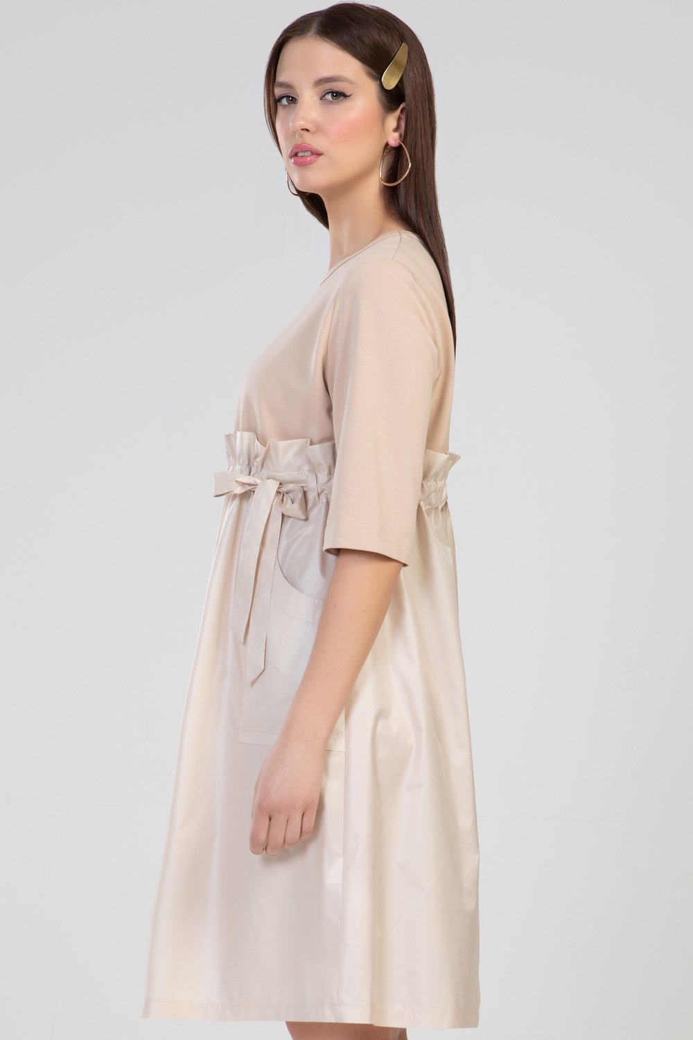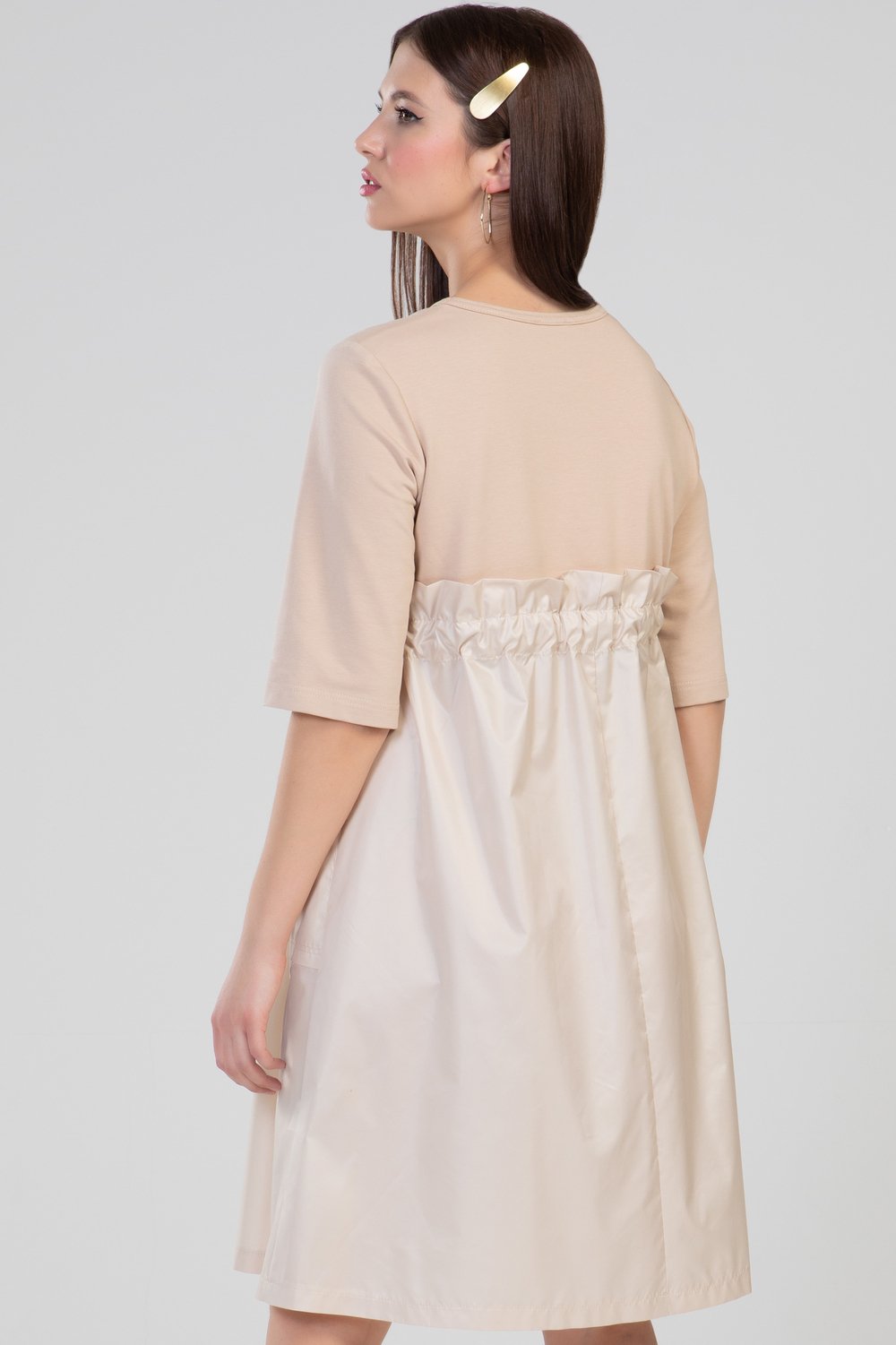 Платье А-образного силуэта, отрезное выше линии талии, с кулисой. В кулису продет пояс. Нижняя часть переда с накладными карманами. Горловина круглая, рукав втачной, 3/4. Платье выполнено из разного сырья : верхняя часть переда и спинки, рукава- из трикотажного полотна футера двухниточного, нижняя часть переда и спинки, пояс - из тонкой плащевой ткани. Цвет бежевый.Характеристики: