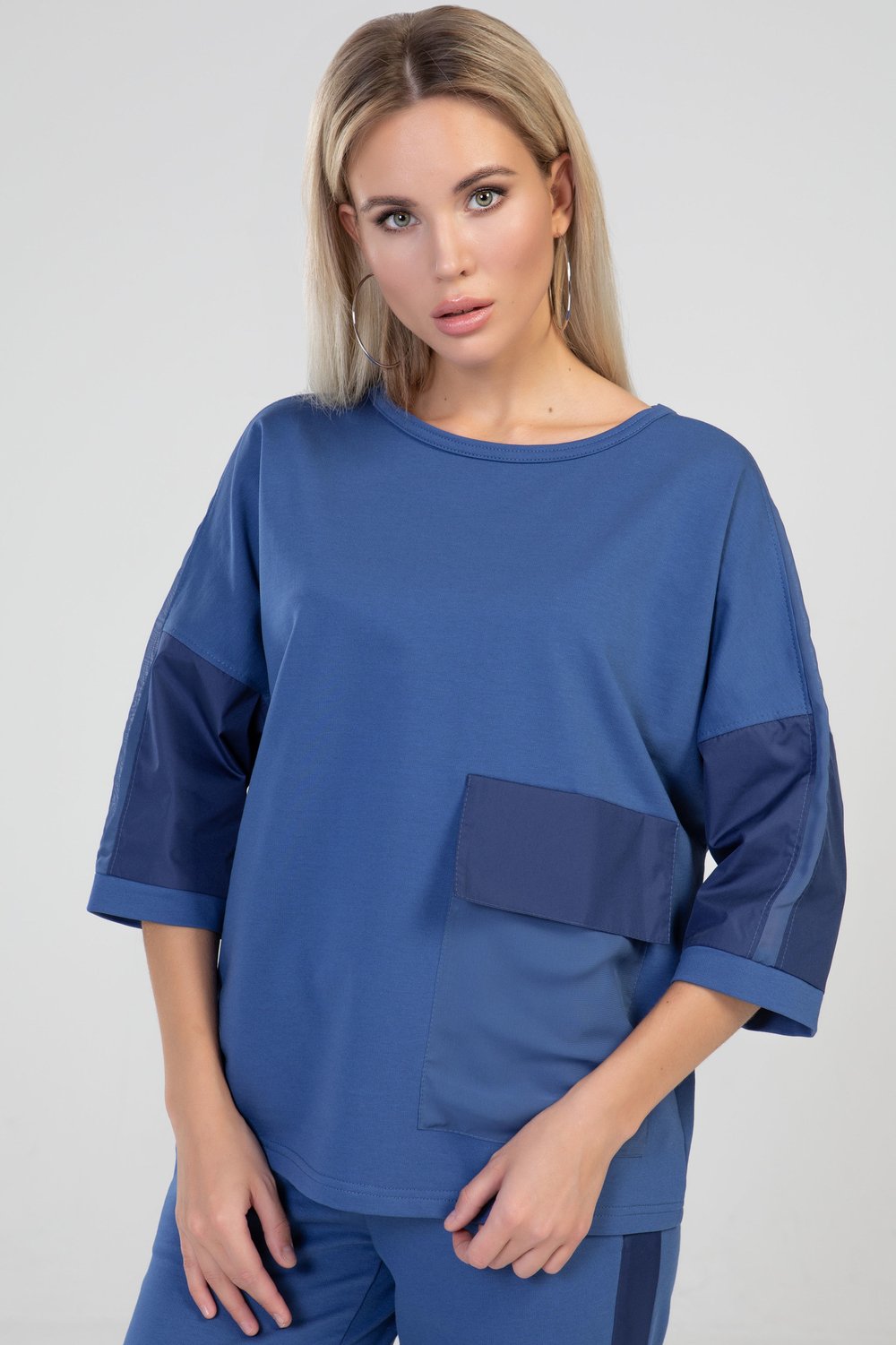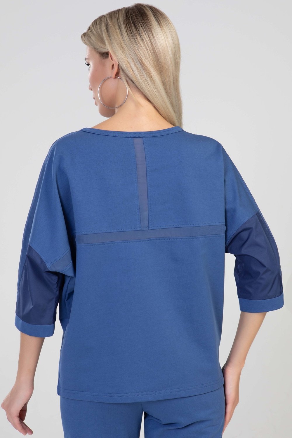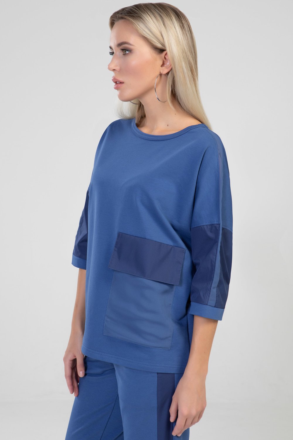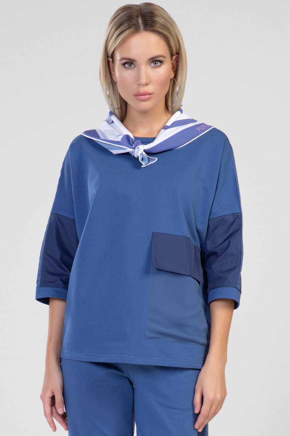 Блуза прямого силуэта, с цельнокроеным рукавом. Горловина круглая. Перед с накладным карманом с клапаном. Спинка и рукав с членением. Низ рукава с притачной манжетой. По верхнему шву рукава, по спинке вертикально и горизонтально втачаны отделочные детали из шифона шириной 2,0см в готовом виде. Клапан и нижняя часть рукава выполнены из тонкой плащевой ткани, накладной карман из шифона в тон основного сырья. Цвет индиго.Характеристики: