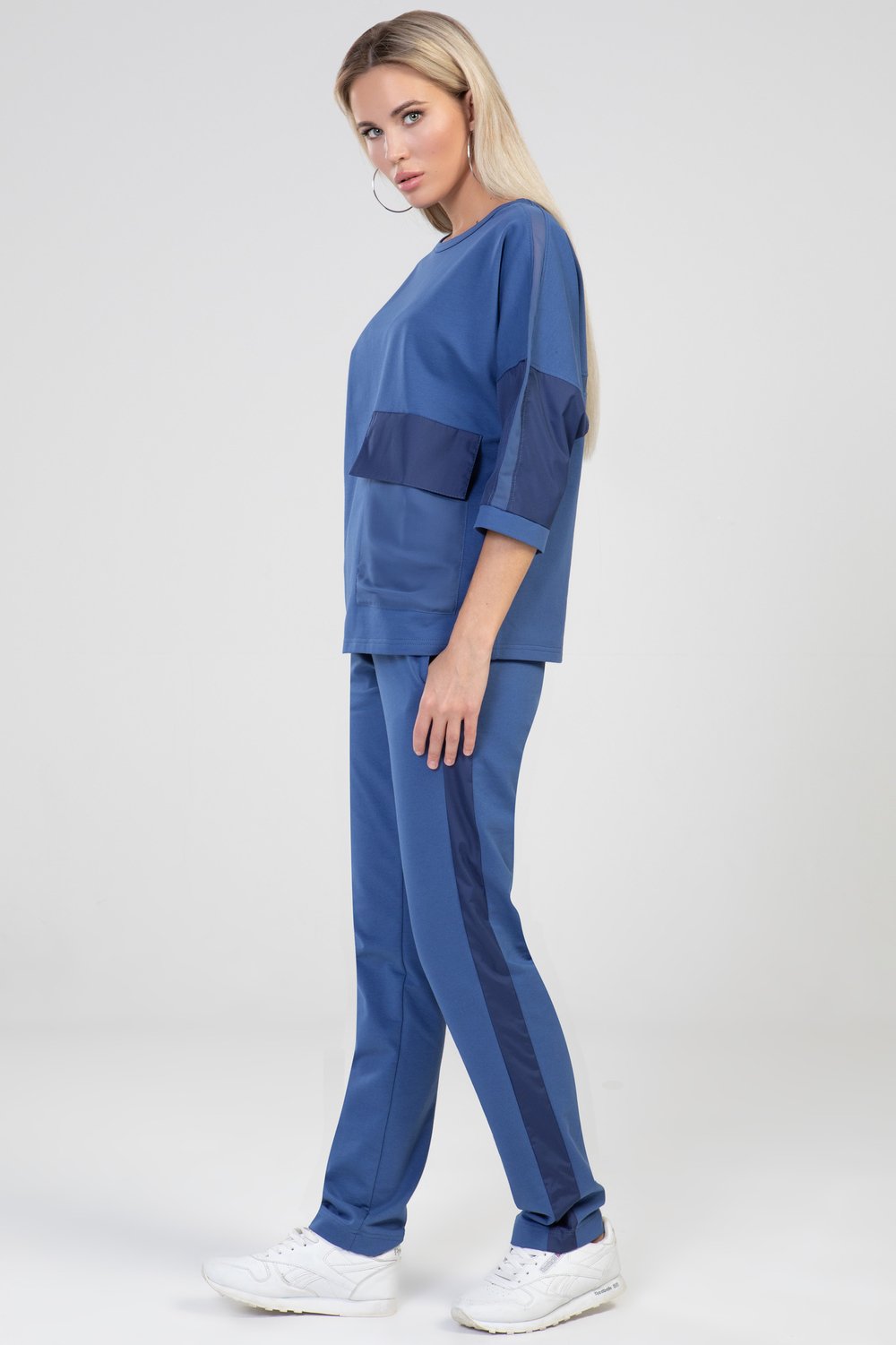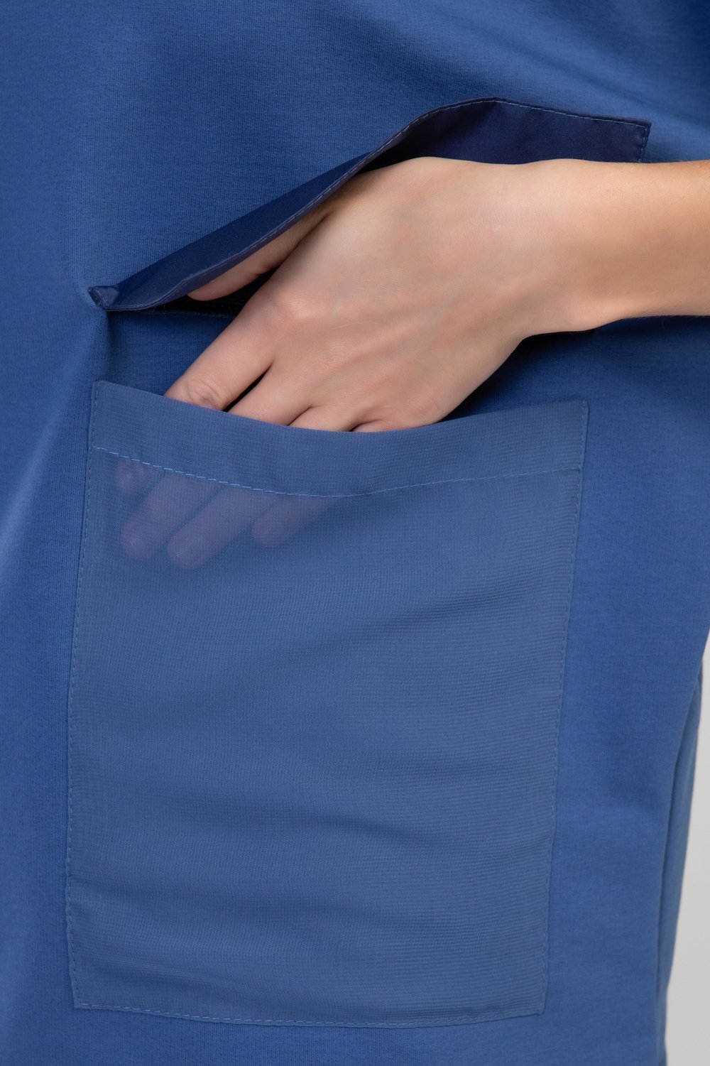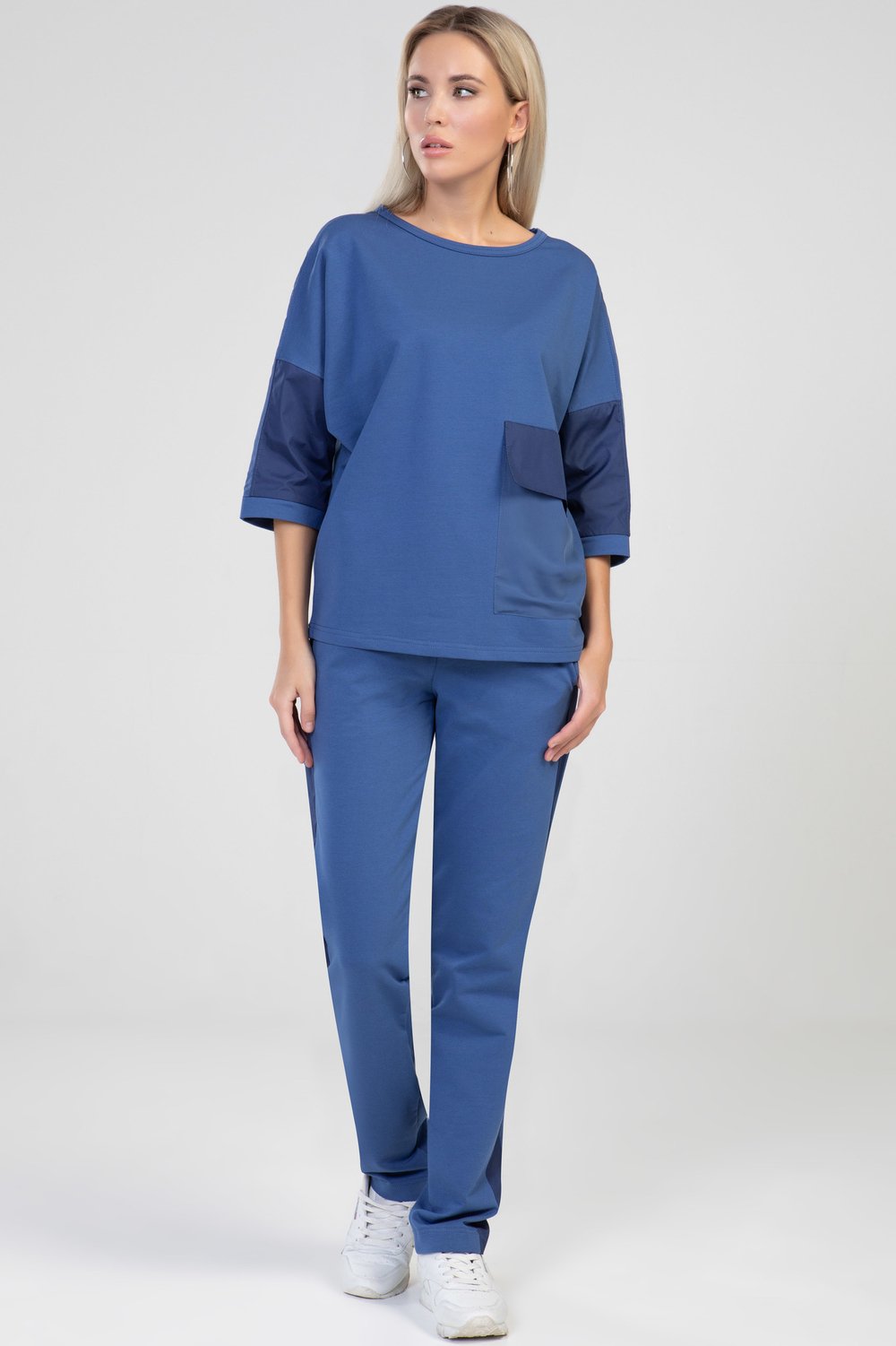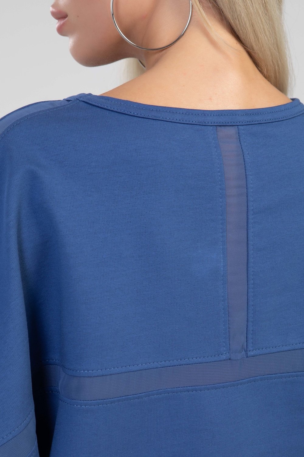 Блуза прямого силуэта, с цельнокроеным рукавом. Горловина круглая. Перед с накладным карманом с клапаном. Спинка и рукав с членением. Низ рукава с притачной манжетой. По верхнему шву рукава, по спинке вертикально и горизонтально втачаны отделочные детали из шифона шириной 2,0см в готовом виде. Клапан и нижняя часть рукава выполнены из тонкой плащевой ткани, накладной карман из шифона в тон основного сырья. Цвет индиго.Характеристики: