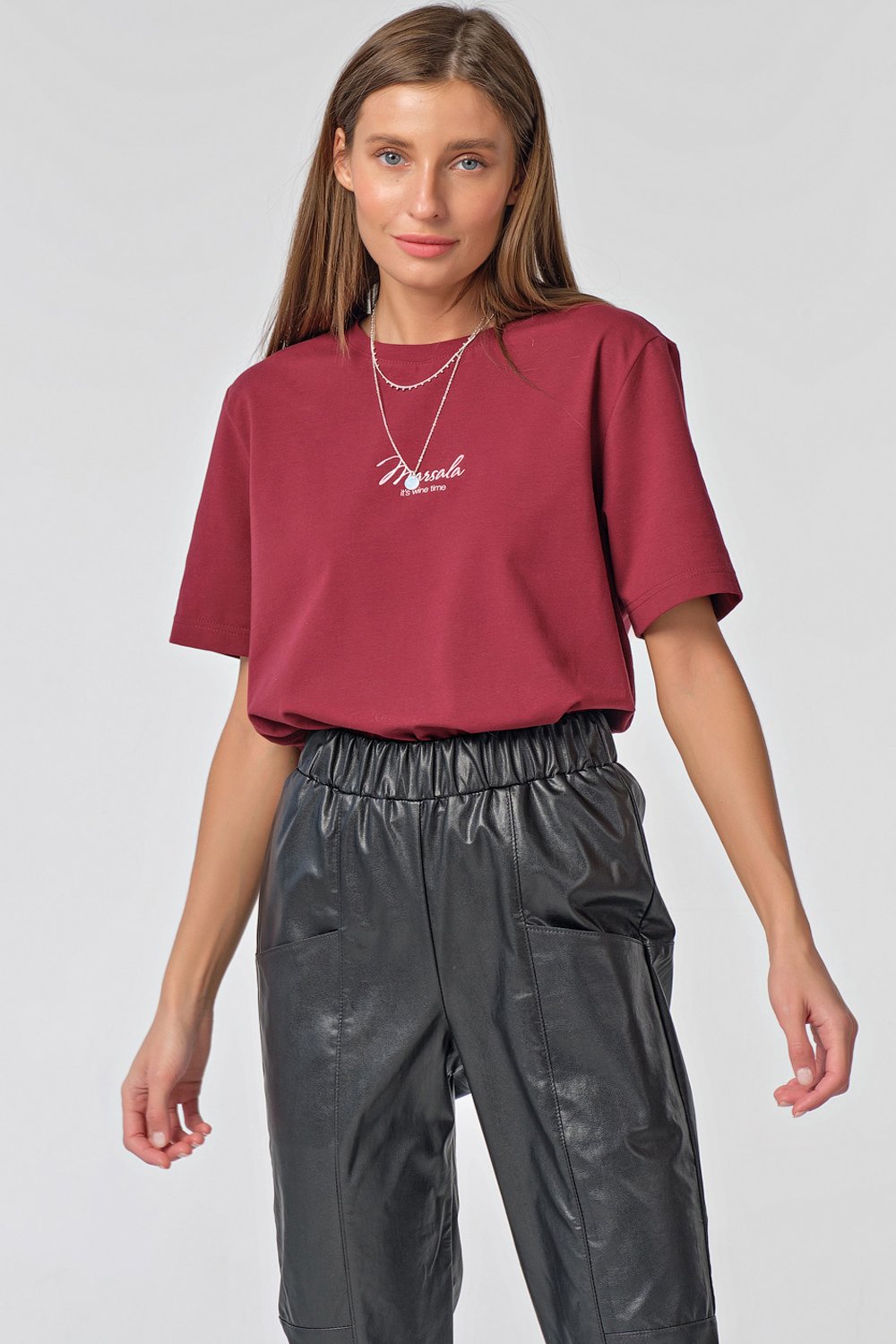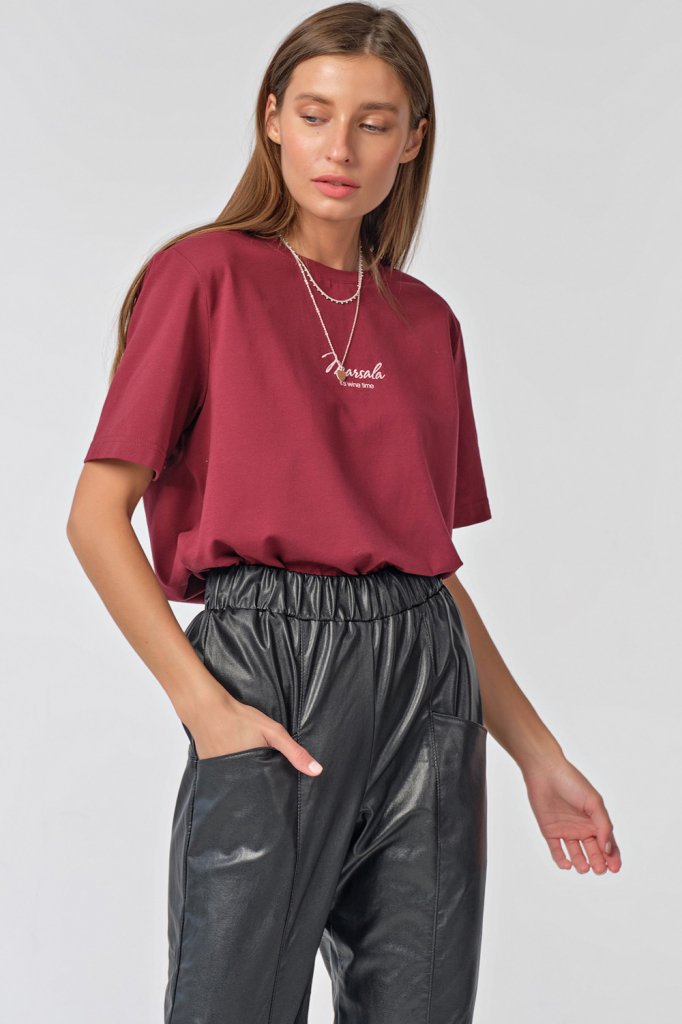 • Особенности: Футболка прямого силуэта среднего объема из трикотажа. Детали: горловина обработана бейкой, по переду нанесен принт.