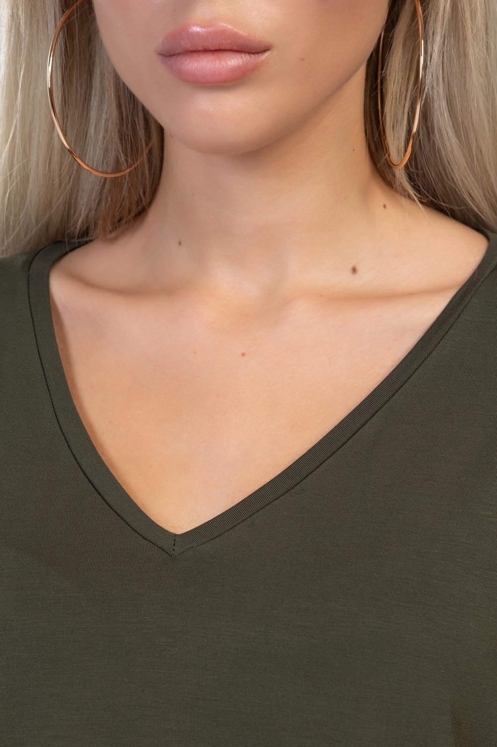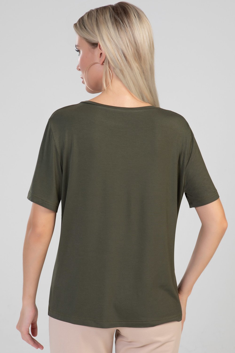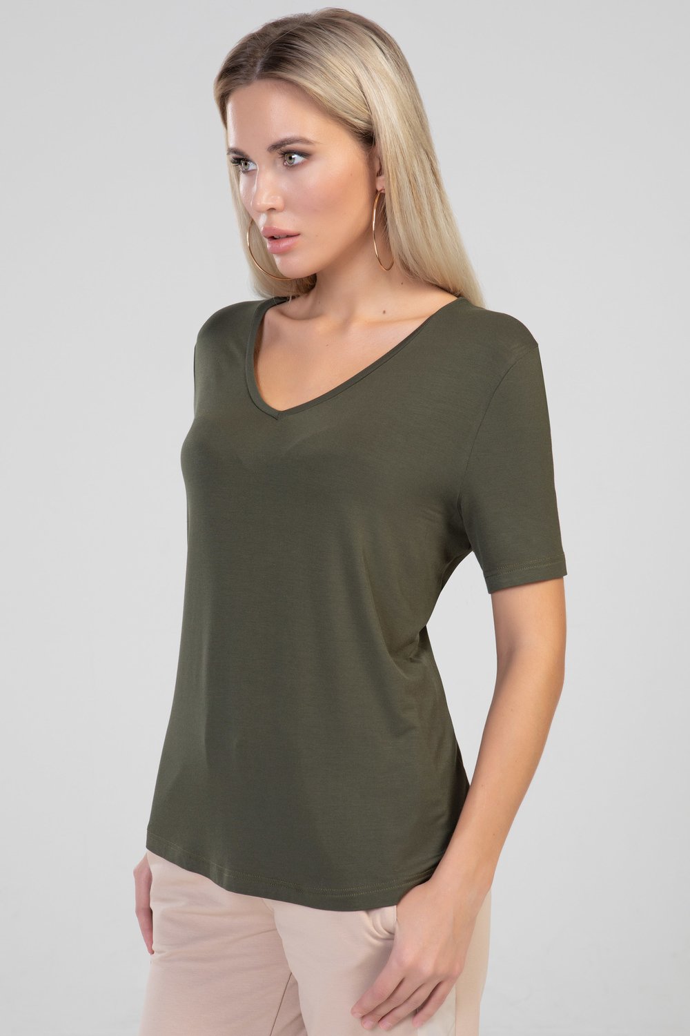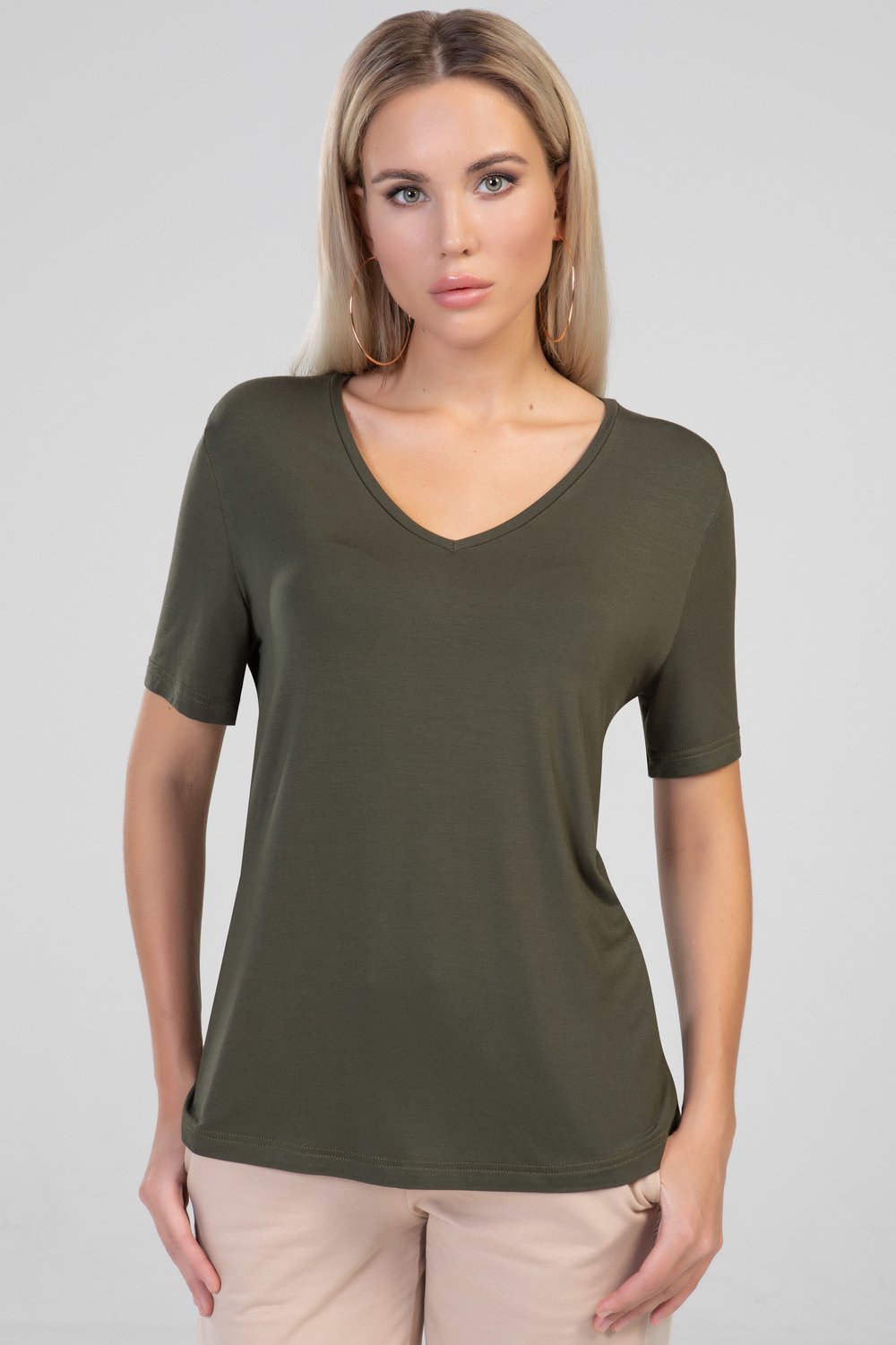 Блуза женская прямого силуэта. Горловина V - образная с узкой бейкой. Рукав втачной, короткий. Цвет хаки.Характеристики: