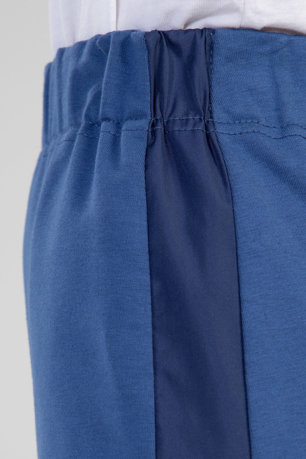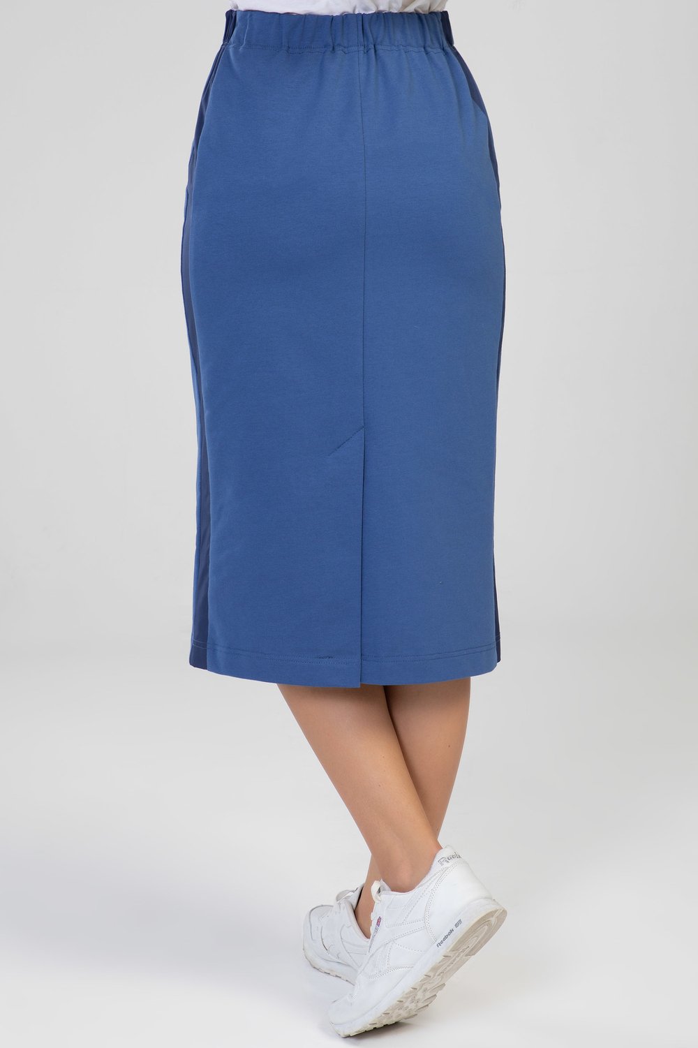 Юбка женская прямого силуэта, с цельнокроенным поясом на эластичной тесьме, по боковым швам с лампасами. Спинка с открытой шлицей в среднем шве. Ширина эластичной тесьмы 4,0см. Лампасы выполнены из тонкой плащевой ткани в тон основного сырья. Цвет деним.Характеристики: