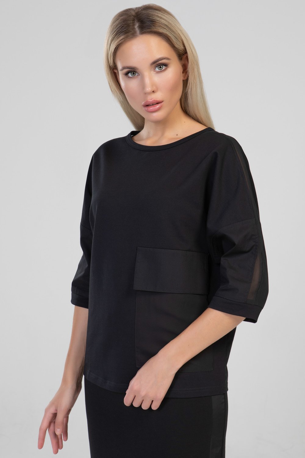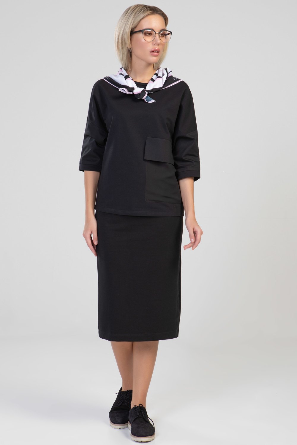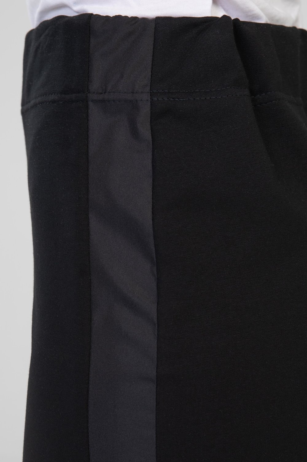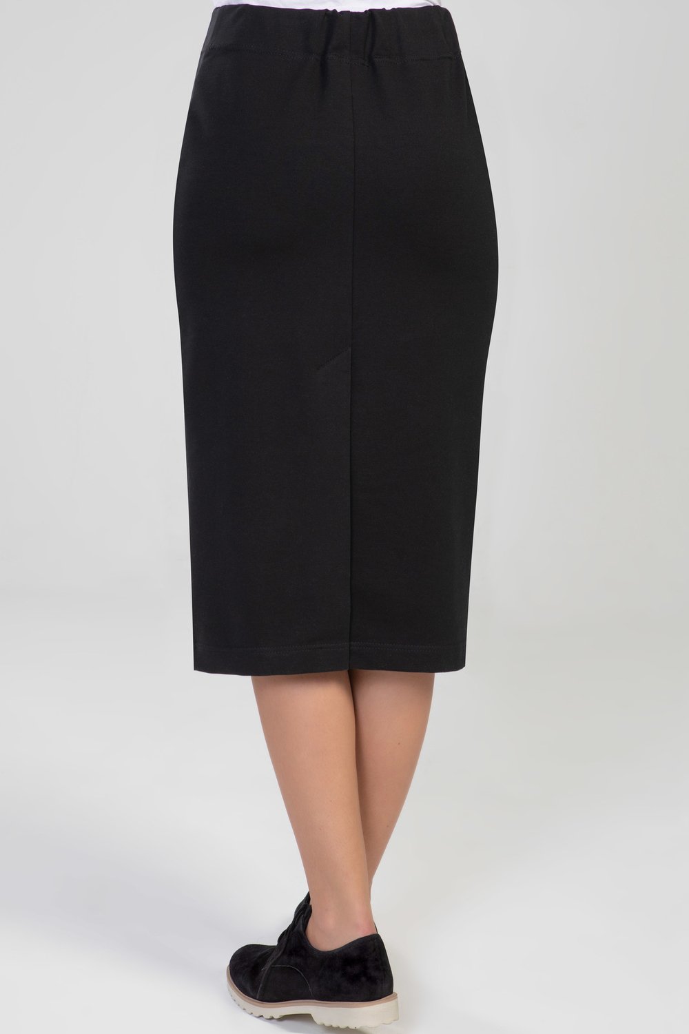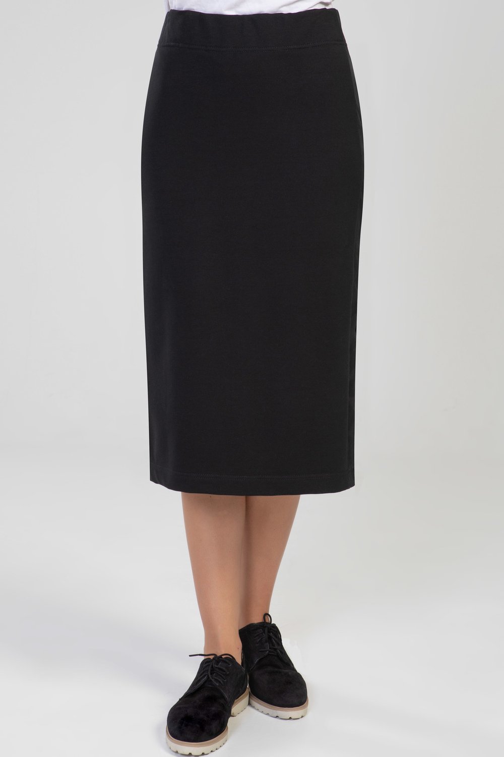 Юбка женская прямого силуэта, с цельнокроенным поясом на эластичной тесьме, по боковым швам с лампасами. Спинка с открытой шлицей в среднем шве. Ширина эластичной тесьмы 4,0см. Лампасы выполнены из тонкой плащевой ткани в тон основного сырья. Цвет черный.Характеристики: