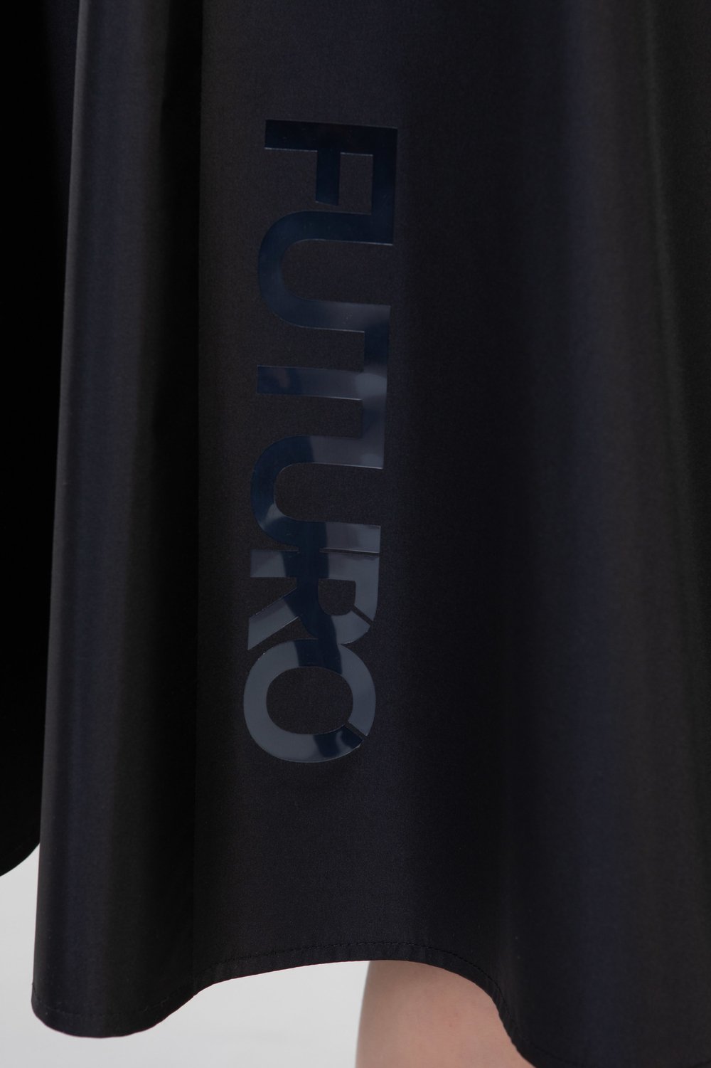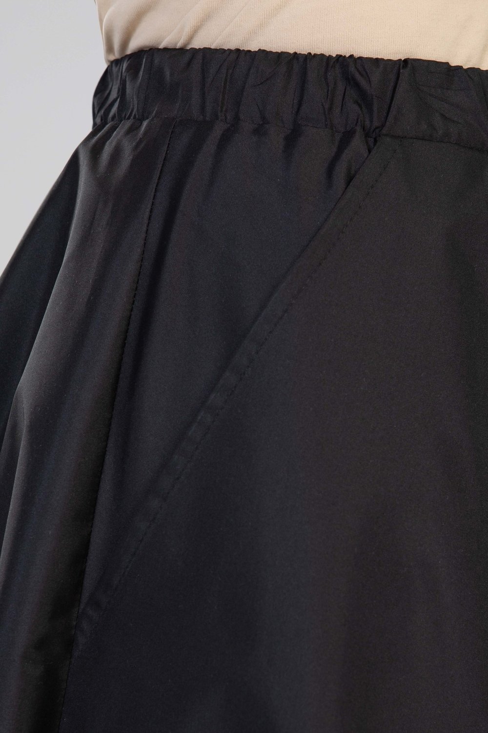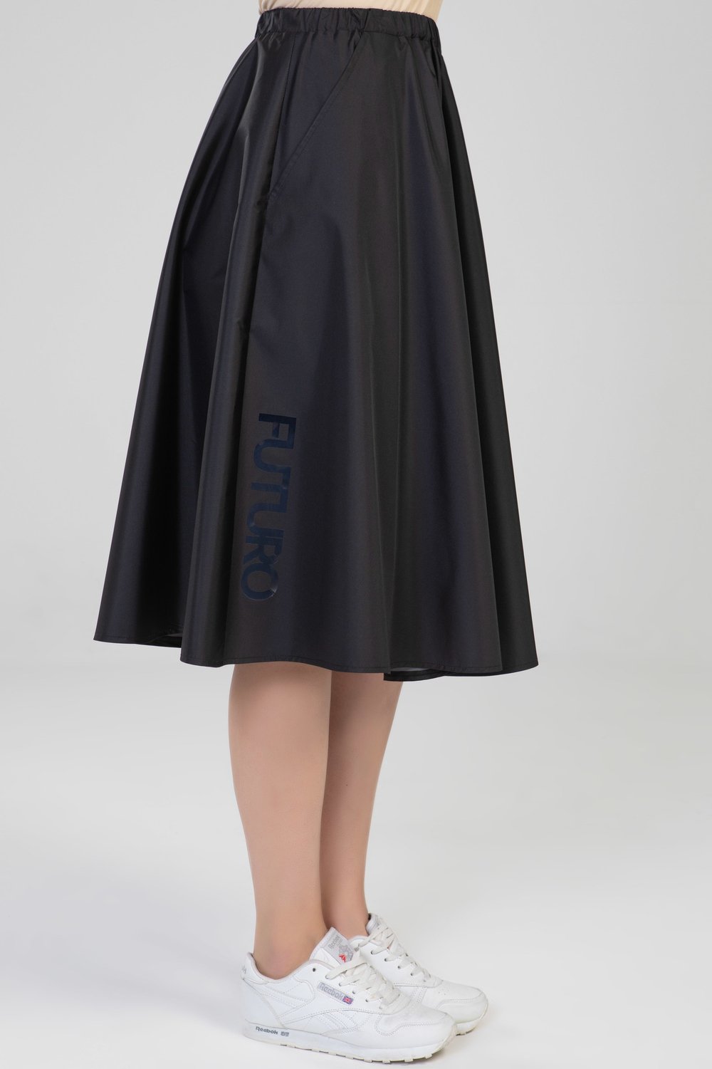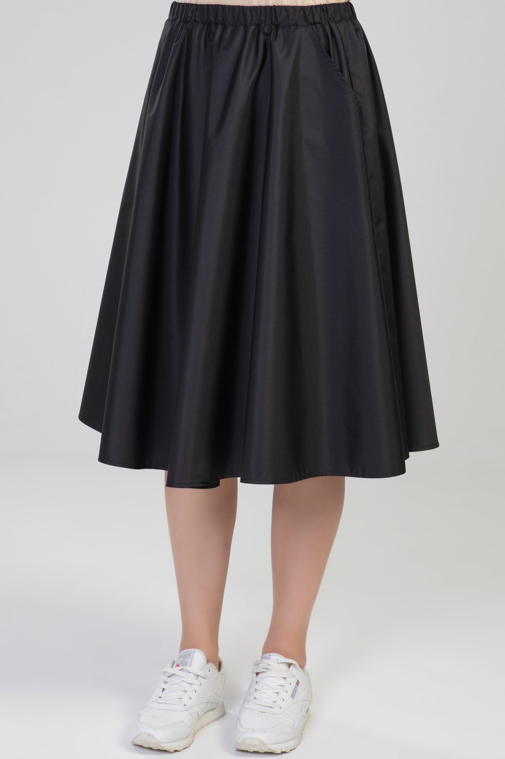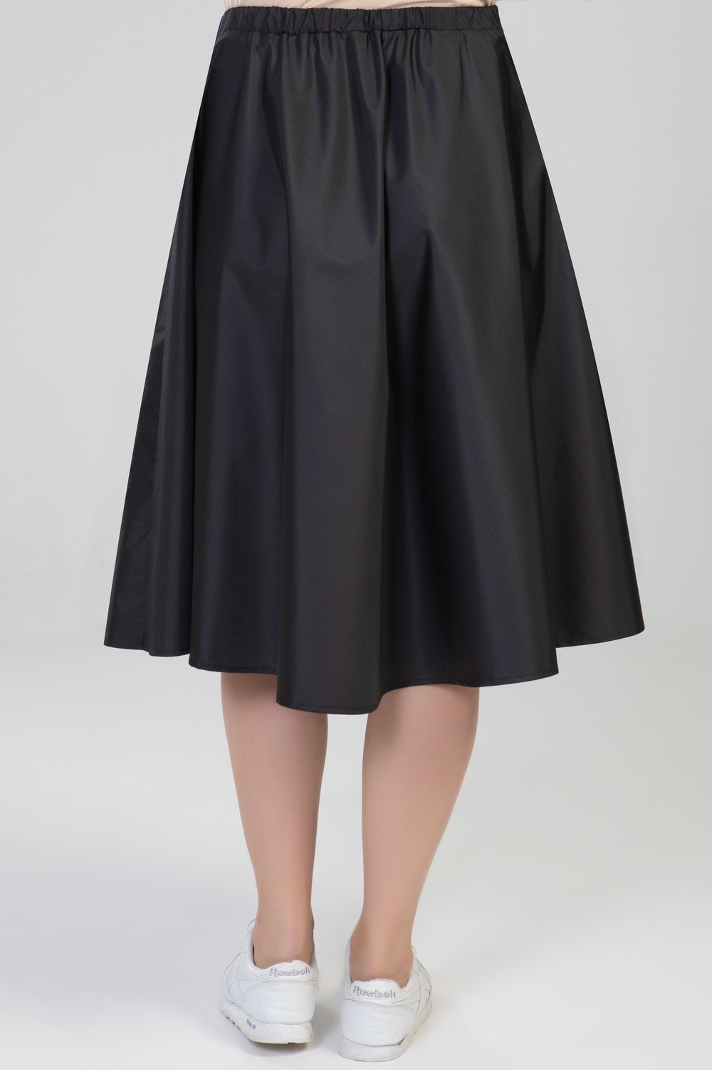Юбка женская, трапециевидного силуэта, с боковыми карманами. Верх юбки на притачном поясе с эластичной тесьмой. Цвет черный. На правой стороне переда вертикально выполнена аппликация из прозрачной пленки.Характеристики: