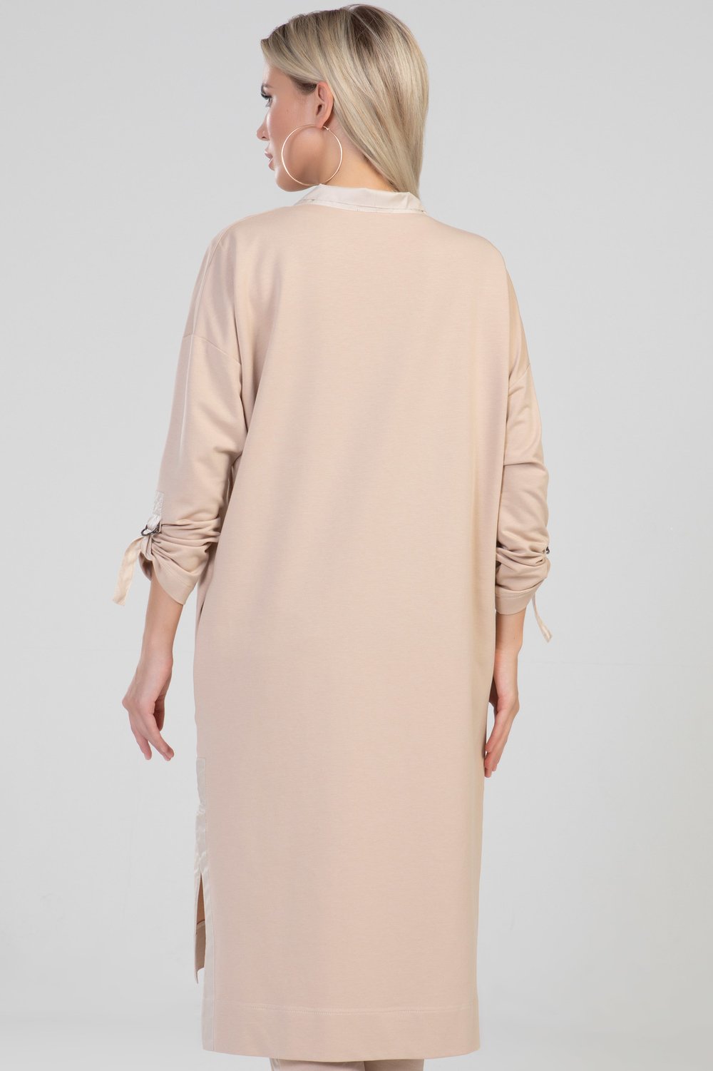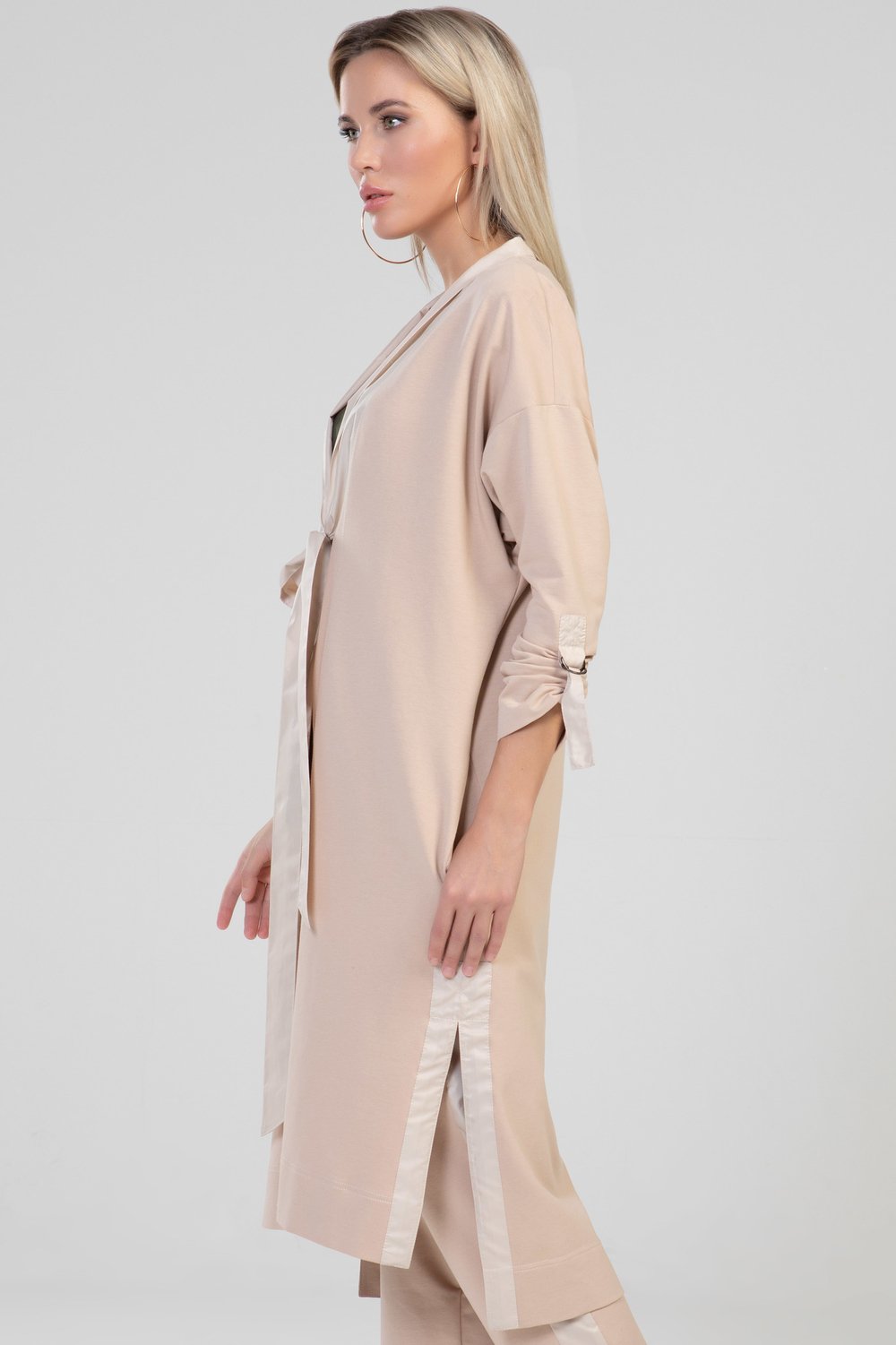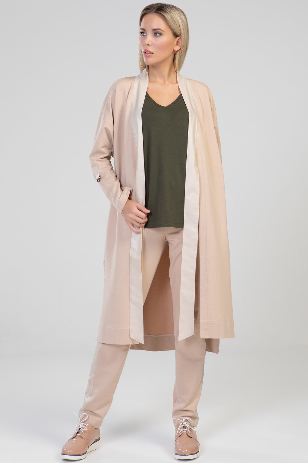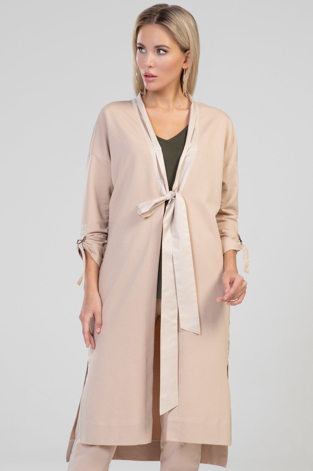 Жакет прямого силуэта, разноуровневый, без застежки, с разрезами и карманами в боковом шве. Воротник отложной с цельнокроеными завязками. Плечо спущенное. Рукав втачной, длинный, с патой, продетой в полукольца для регулировки длины рукава. Воротник, цельнокроеный с завязками, паты рукава, обтачки бокового разреза выполнены из тонкой плащевой ткани в тон основного сырья. Цвет мокко.Характеристики: