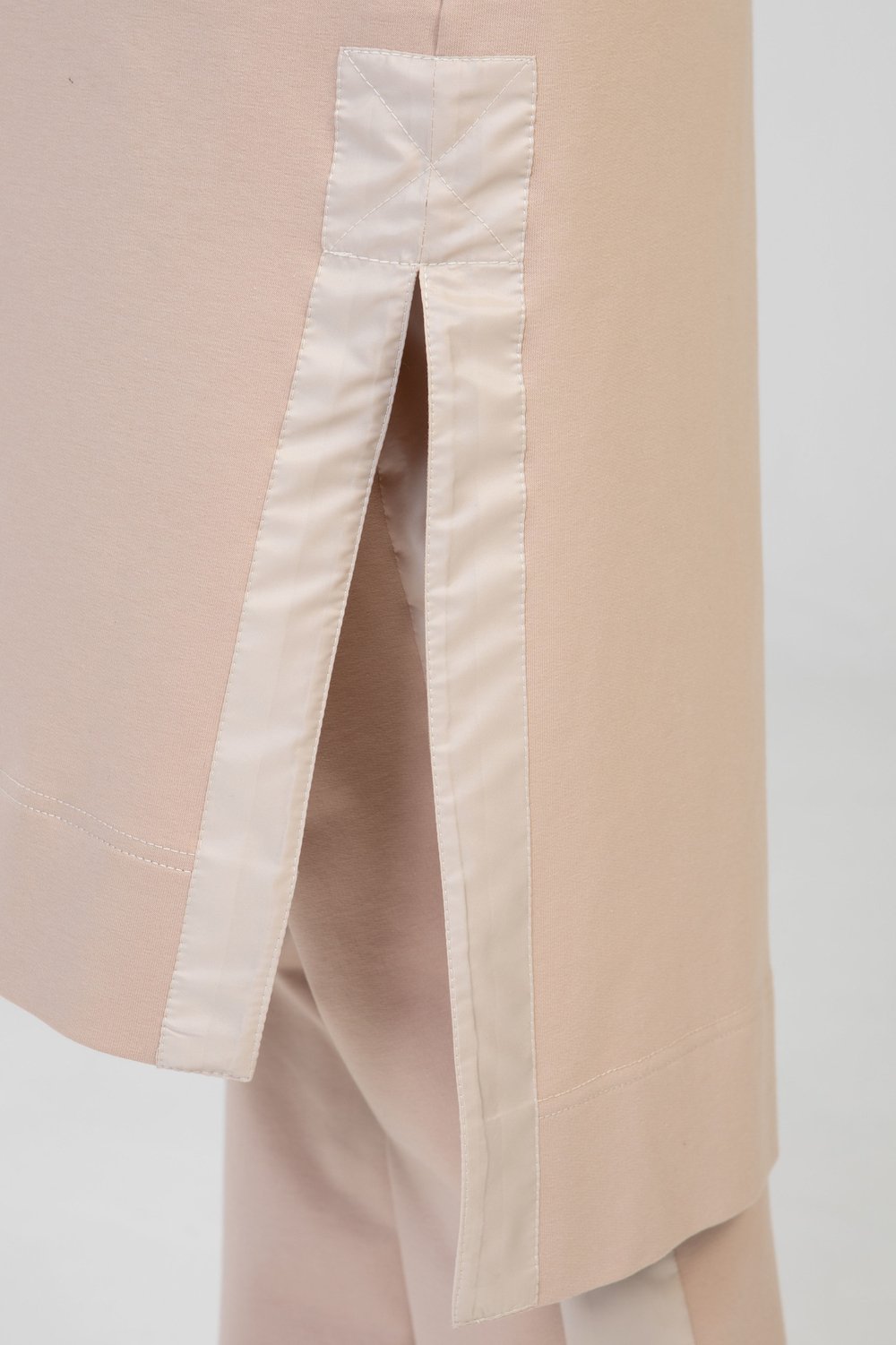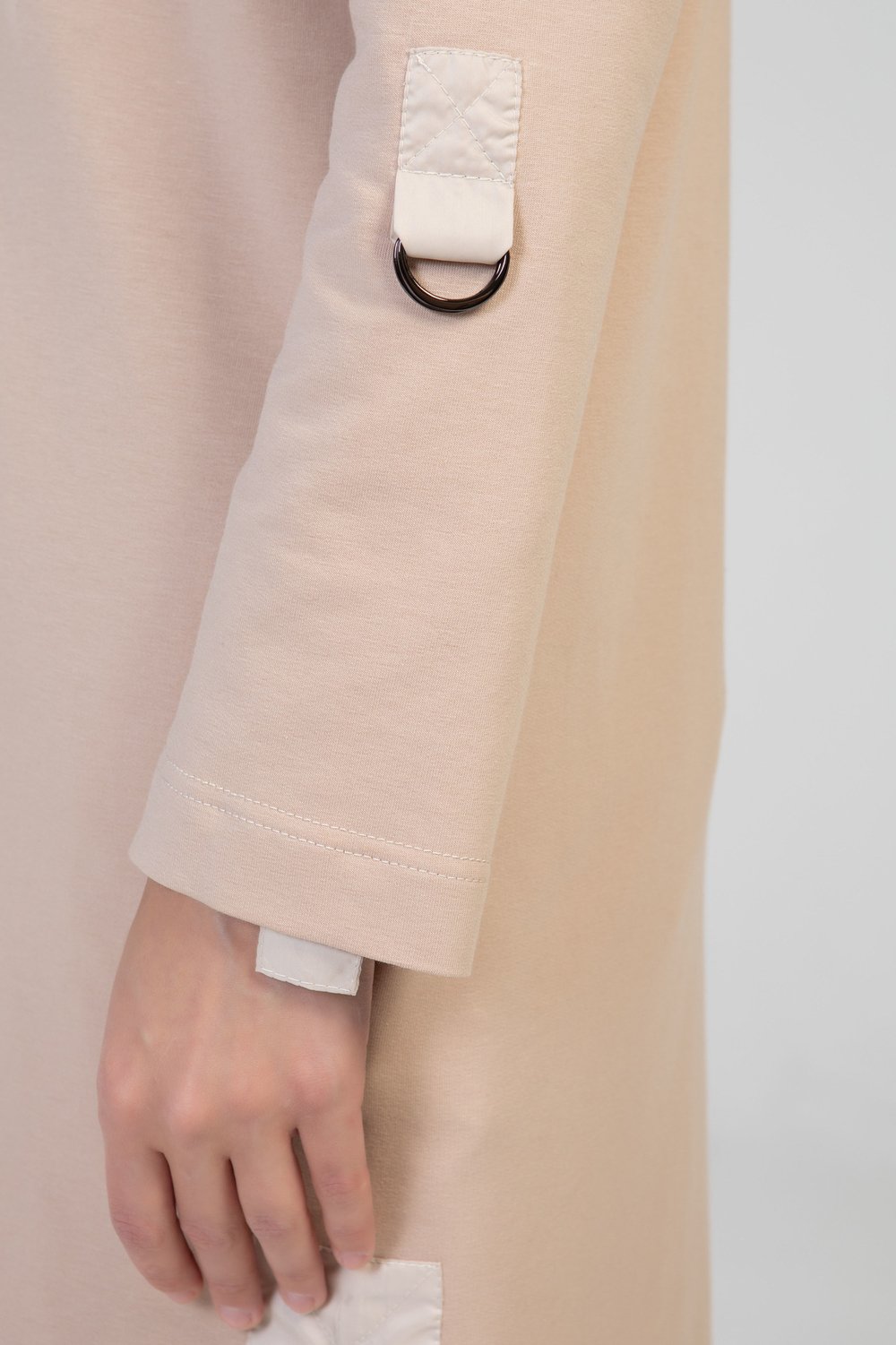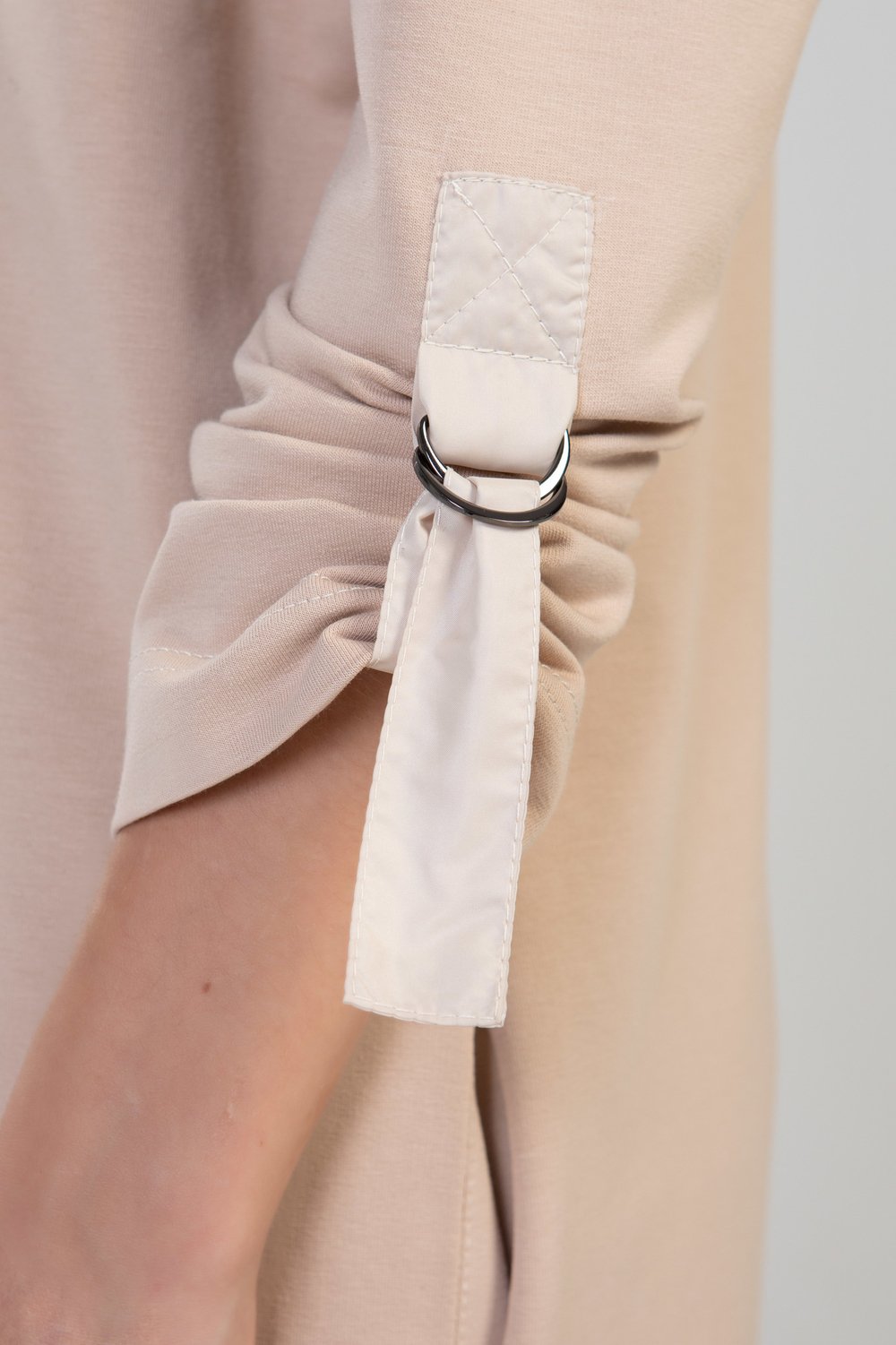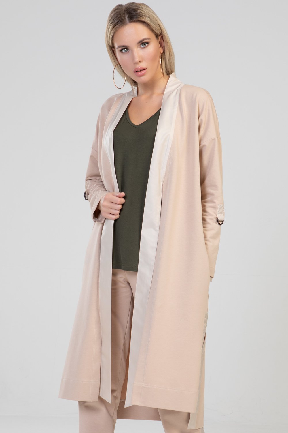 Жакет прямого силуэта, разноуровневый, без застежки, с разрезами и карманами в боковом шве. Воротник отложной с цельнокроеными завязками. Плечо спущенное. Рукав втачной, длинный, с патой, продетой в полукольца для регулировки длины рукава. Воротник, цельнокроеный с завязками, паты рукава, обтачки бокового разреза выполнены из тонкой плащевой ткани в тон основного сырья. Цвет мокко.Характеристики: