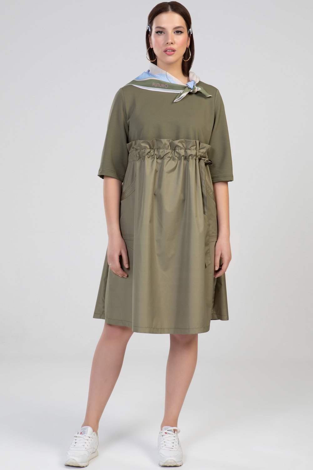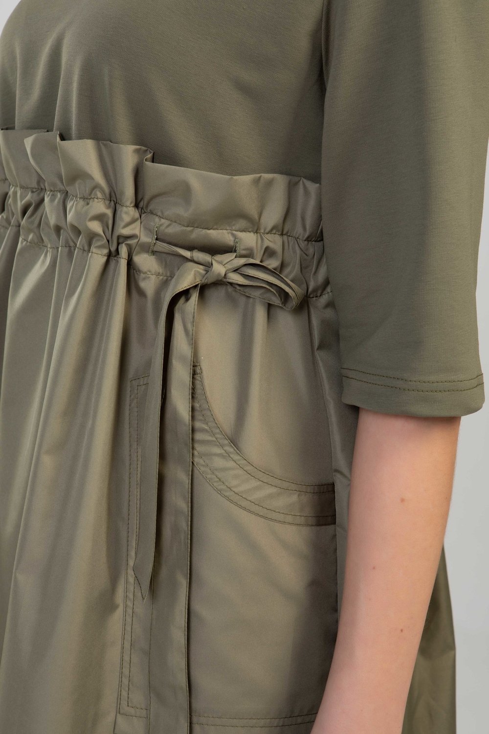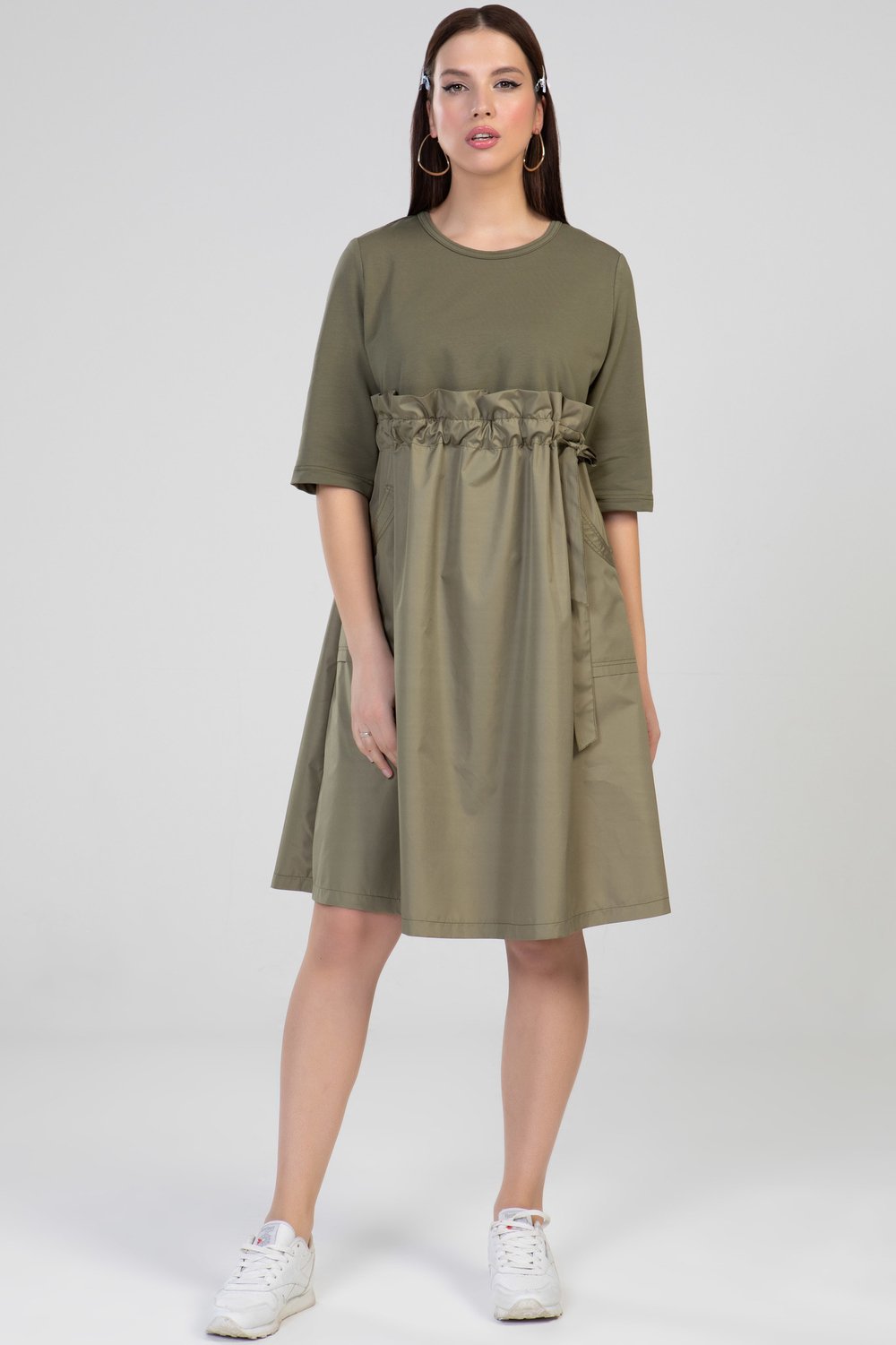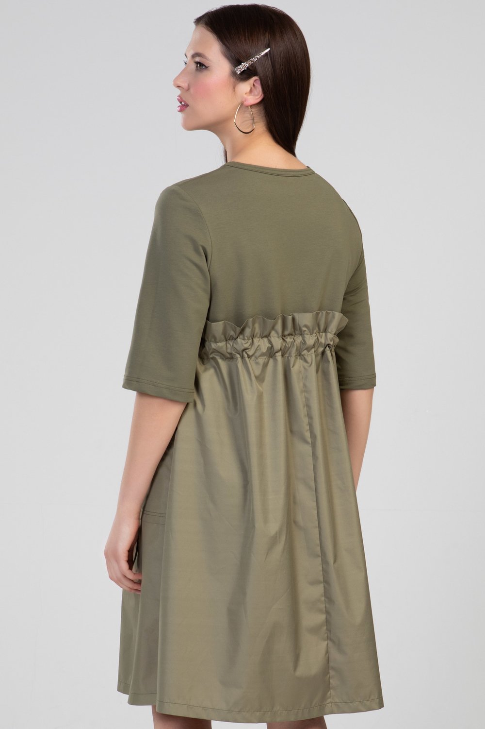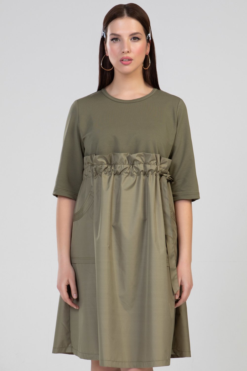 Платье женское А-образного силуэта, отрезное выше линии талии, с кулисой. В кулису продет пояс. Нижняя часть переда с накладными карманами. Горловина круглая, рукав втачной, 3/4. Платье выполнено из разного сырья : верхняя часть переда и спинки, рукав - из трикотажного полотна футера двухниточного, нижняя часть переда и спинки, пояс - из тонкой плащевой ткани в тон футера. Цвет хаки.Характеристики:
