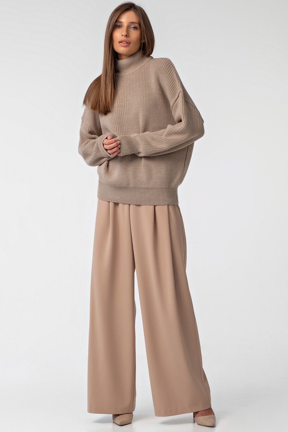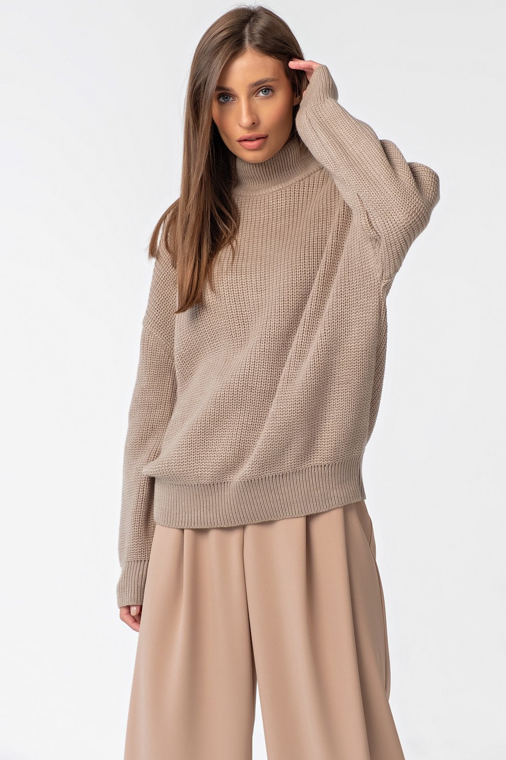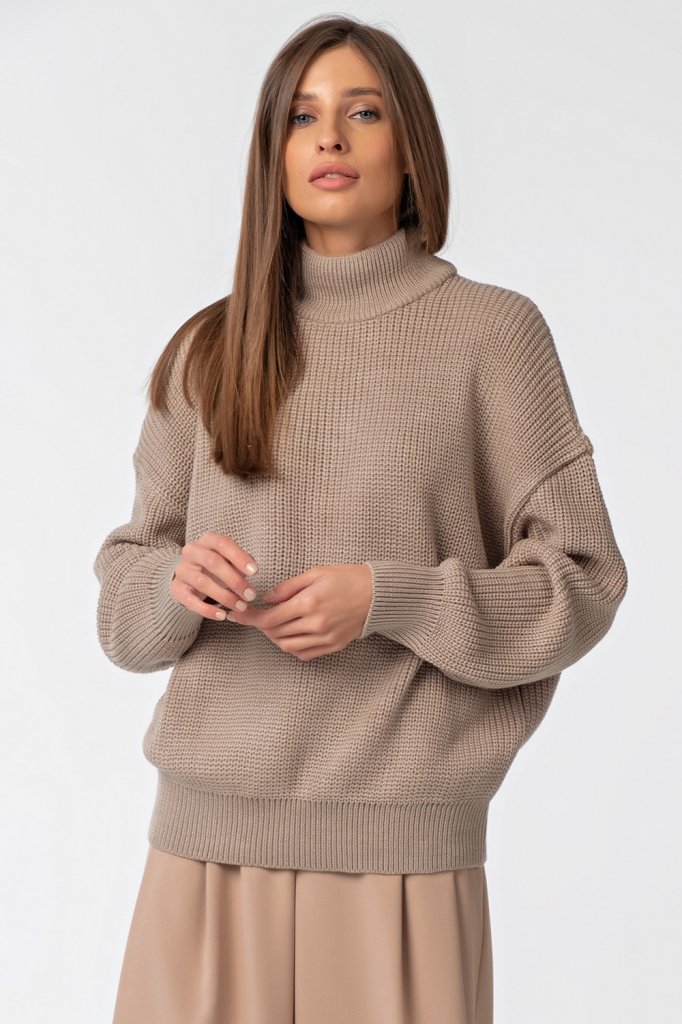 • Особенности: Объемный свитер выполнен фактурной вязкой из смесовой пряжи. Вырез горловины оформлен двойной обтачкой. Рукав со спущенной проймой и цельновязаной манжетой. По низу изделие оформлено резинкой в рубчик.